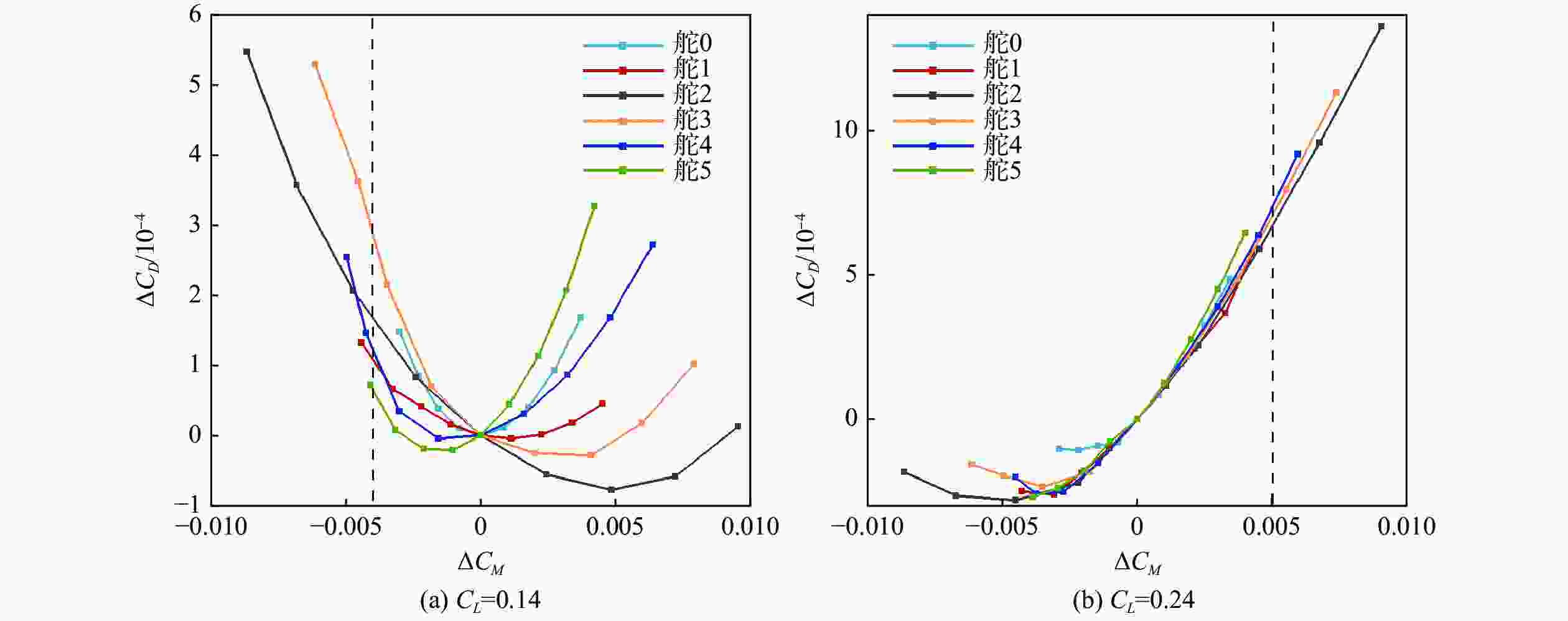 布局 舵 0/(°) 舵 1/(°) 舵 2/(°) 舵 3/(°) 舵 4/(°) 舵 5/(°) α/(°) ${C_D}$ ${C_M}$ $\Delta {C_D}$/10−4 基准构型 0 0 0 0 0 0 2.58 0.00795 0.0040 0 舵0 配平 4.91 0 0 0 0 0 2.41 0.00817 0.0003 2.2 舵5 配平 0 0 0 0 0 3.83 2.37 0.00806 0.0001 1.1 表 3 ${C_L} = 0.24$时基准构型与单舵面配平构型气动力系数