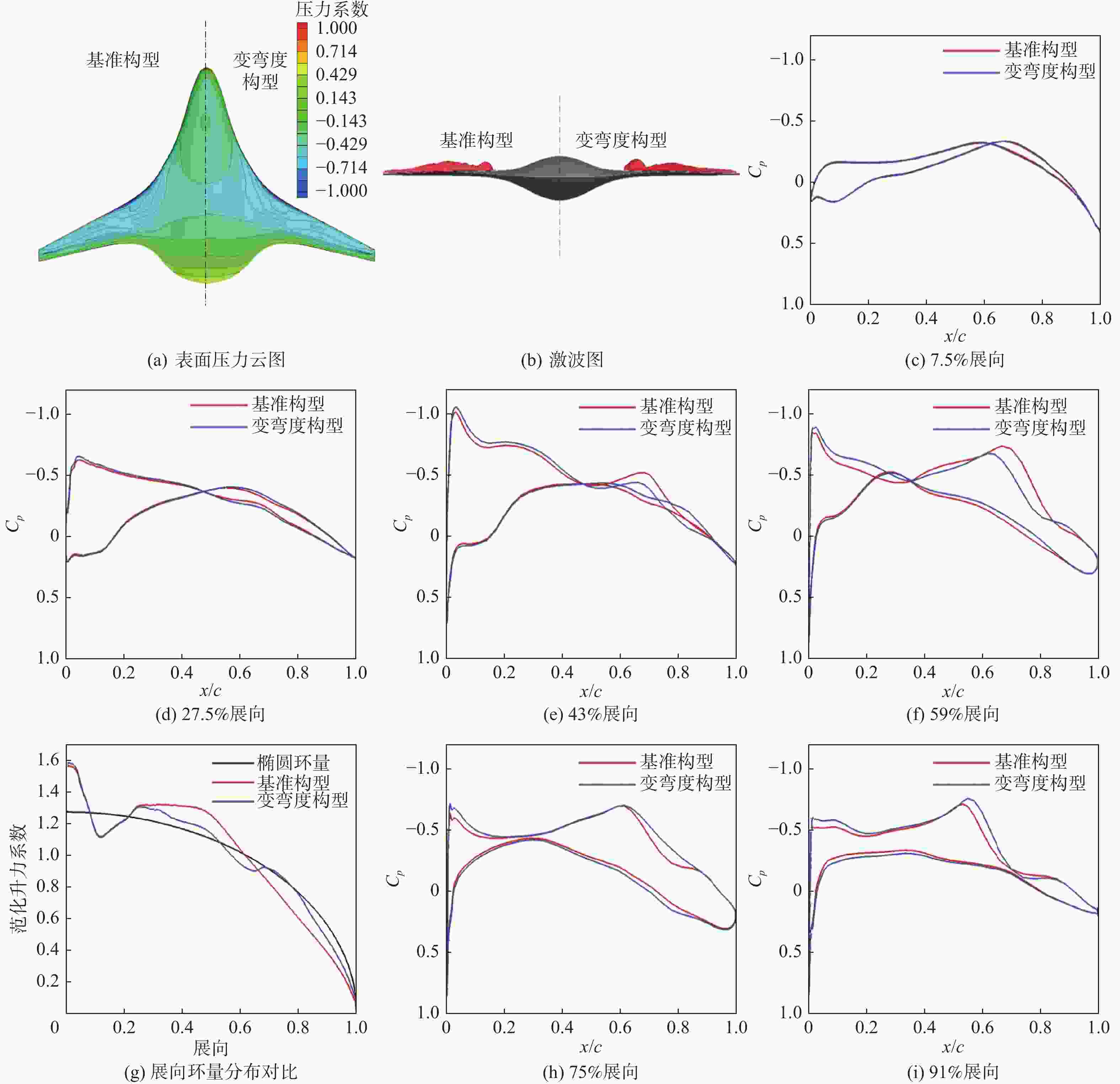 ${C_L}$ 舵 0/(°) 舵 1/(°) 舵 2/(°) 舵 3/(°) 舵 4/(°) 舵 5/(°) α/(°) ${C_D}$ ${C_M}$ $\Delta {C_D}$/10−4 0.14 0 0 0 0 0 0 2.58 0.00795 0.0040 0 −0.21 0.02 −1.11 −1.28 1.31 0.09 2.80 0.00787 0.0072 −0.8 0.24 0 0 0 0 0 0 3.63 0.01148 −0.0049 0 1.46 2.65 0.09 0.74 0.89 2.25 3.22 0.01095 −0.0157 −5.3 表 6 考虑配平约束时变弯度减阻优化结果
