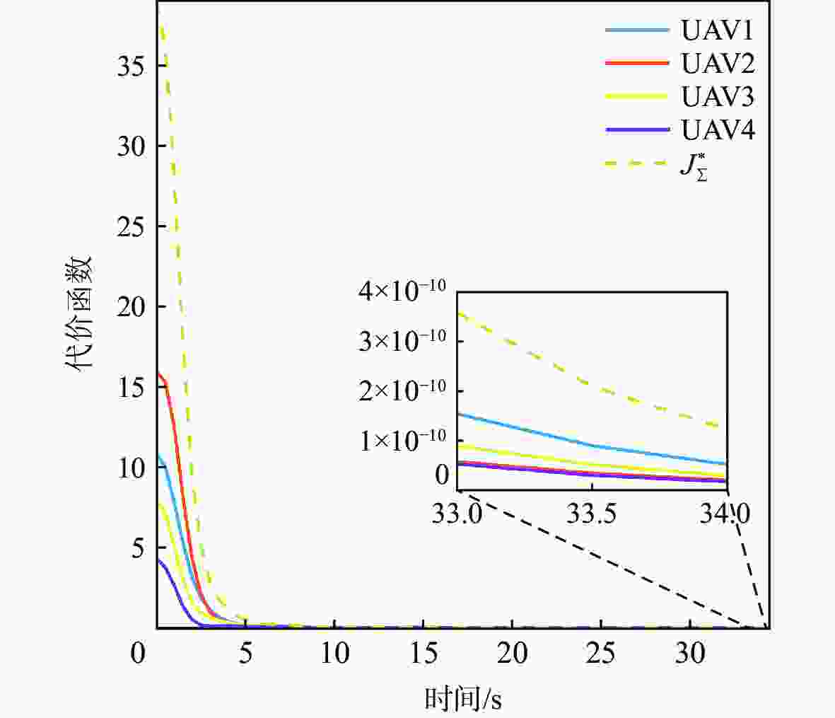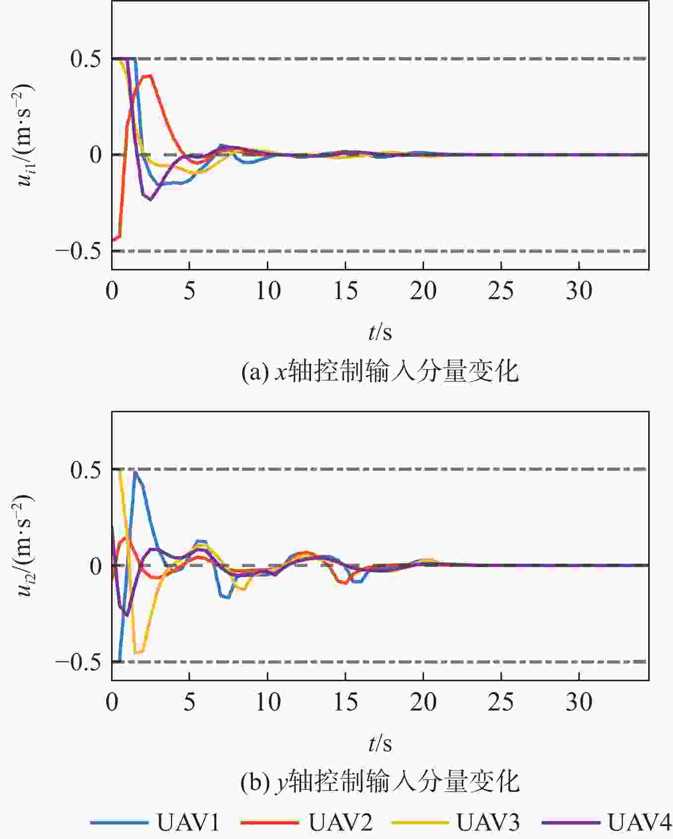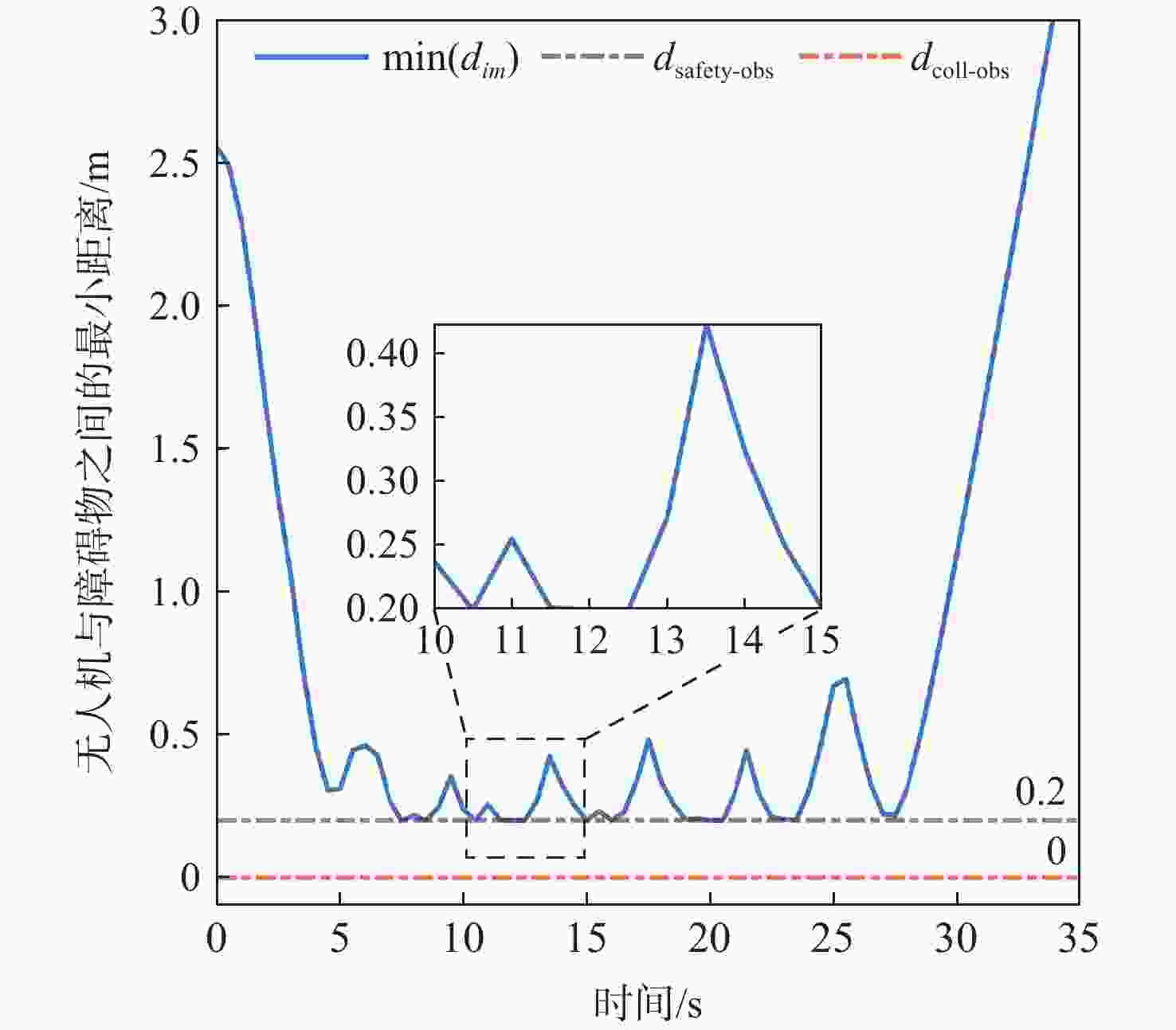 参数 数值 参数 数值 $ {\lambda _{i{\text{,f}}}} $ 1 ${r_{{\text{margin-UAV}}}}$/m 0.1 $ {\lambda _{i{\text{,v}}}} $ 1 ${r_{{\text{obs}}}}$/m 0.25 $ {\lambda _{i{\text{,c}}}} $ 0.5 ${r_{{\text{margin-obs}}}}$/m 0.1 $ \Delta T $/s 0.5 ${\underline{v} _{ih}}$/(m·s−1) −1 $P$ 8 ${\bar v_{ih}}$/(m·s−1) 1 ${T_{{\text{max}}}}$/s 35 ${\underline{u} _{ih}}$/(m·s−2) −0.5 $ {{\boldsymbol{v}}_{{\text{ref}}}} $/(m·s−1) ${\left[ {\begin{array}{*{20}{c}} {0.5}&0 \end{array}} \right]^{\text{T}}}$ ${\bar u_{ih}}$/(m·s−2) 0.5 ${r_{{ - UAV}}}$/m 0.1 表 2 平均滚动优化时间对比