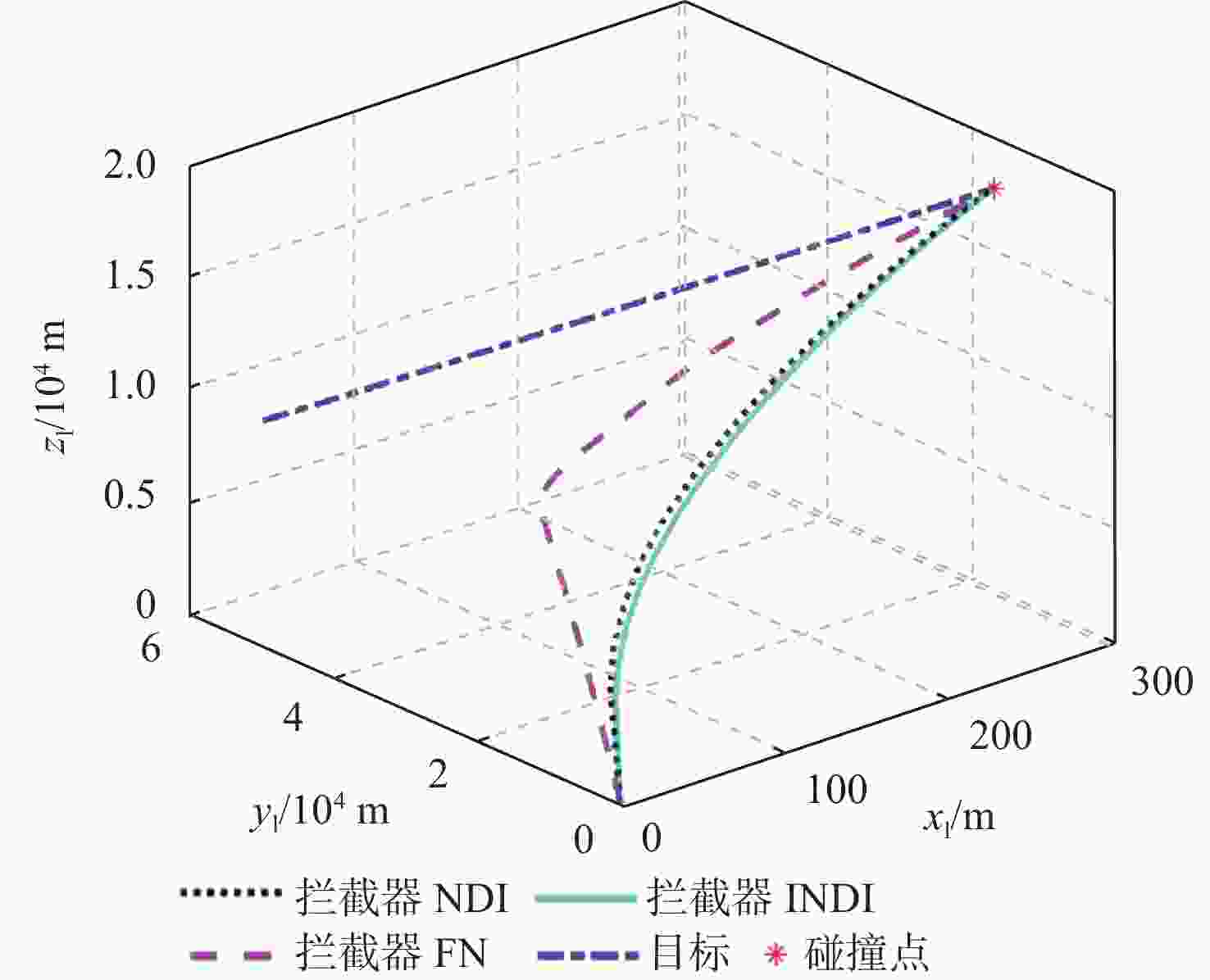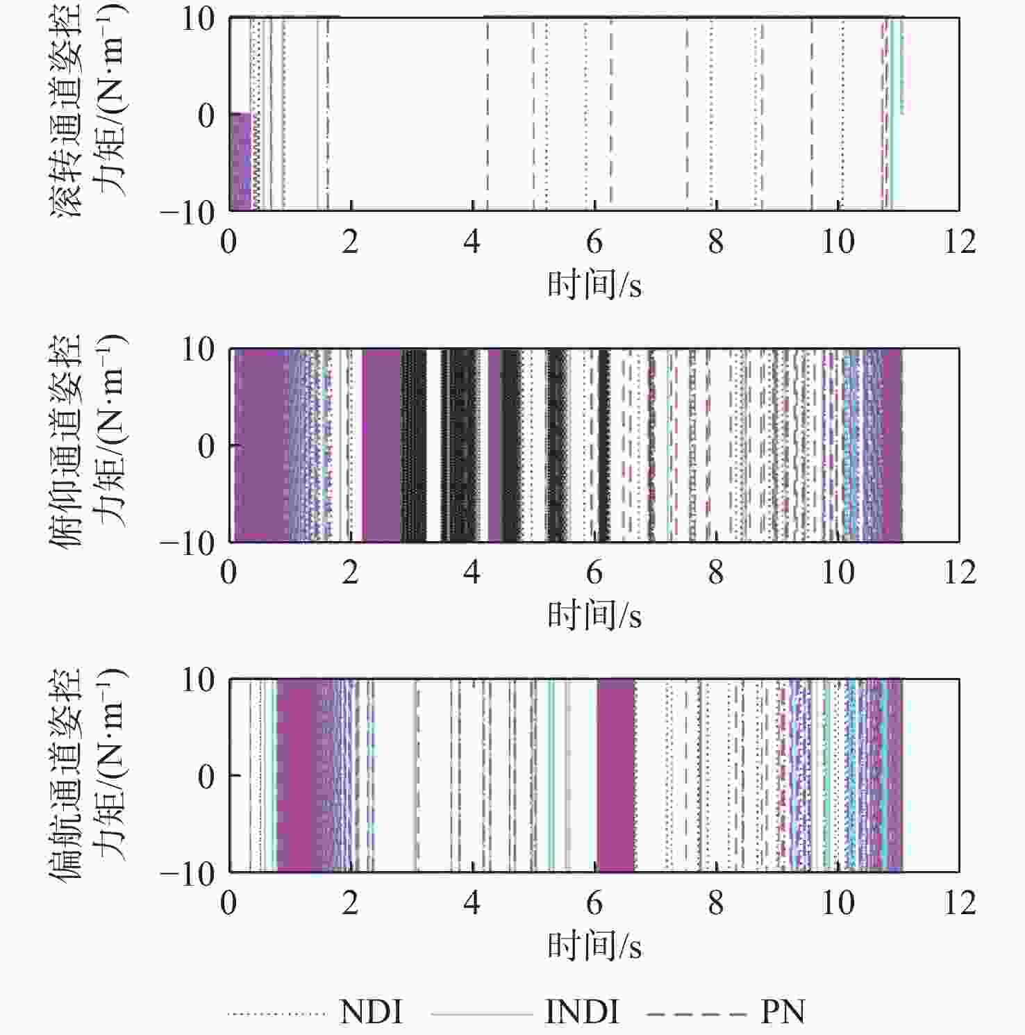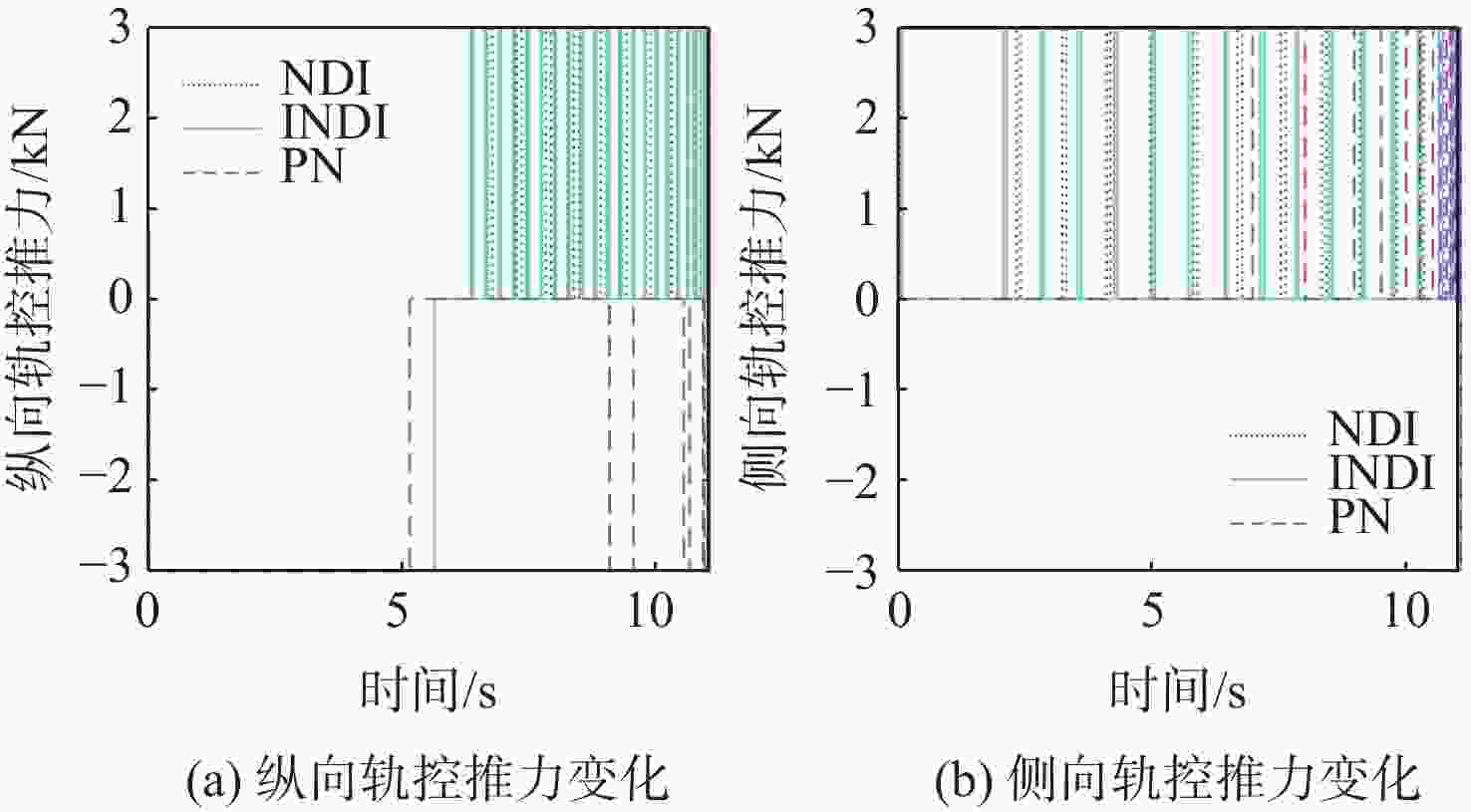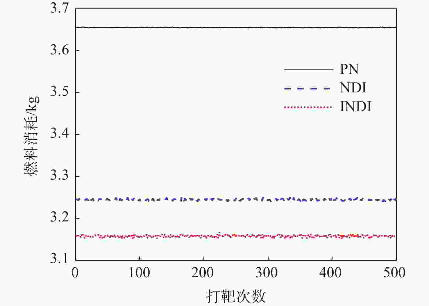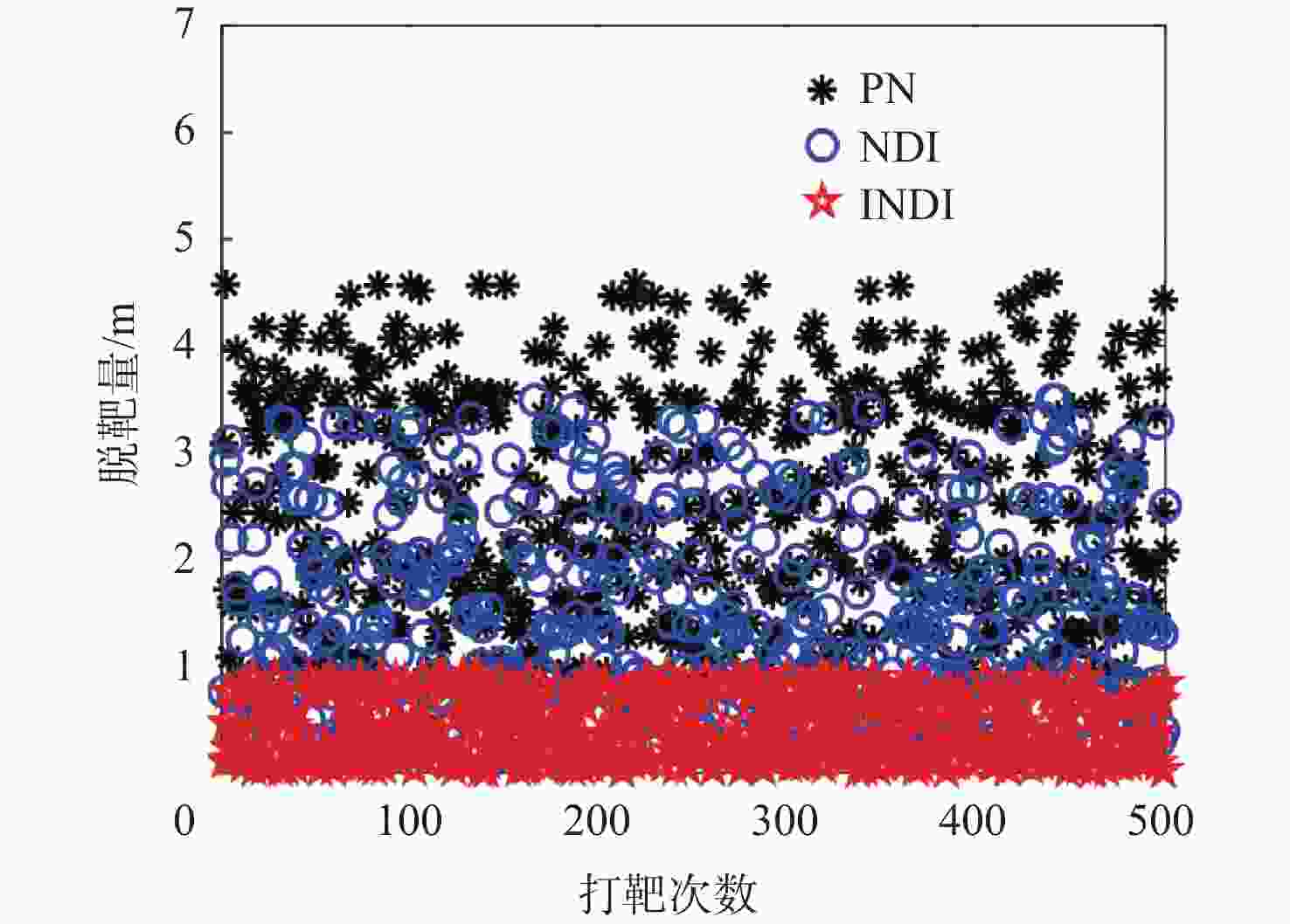 制导方法 仿真情形 脱靶量/m 燃料消耗/kg NDI 标称低机动 0.920 1.995 偏差高机动 2.015 3.245 INDI 标称低机动 0.394 1.930 偏差高机动 0.405 3.157 PN 标称低机动 0.870 1.971 偏差高机动 2.553 3.655 -