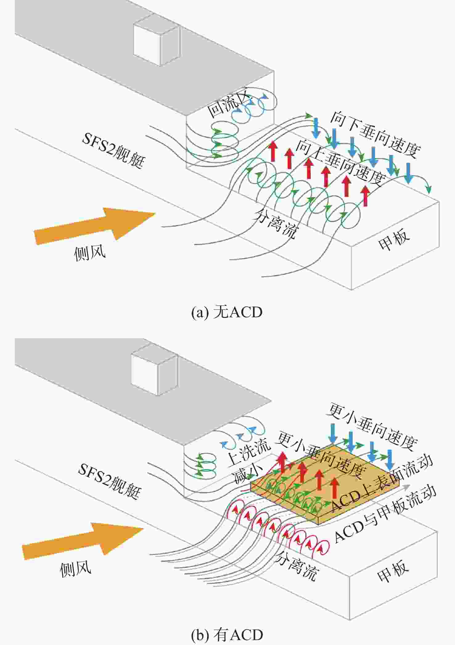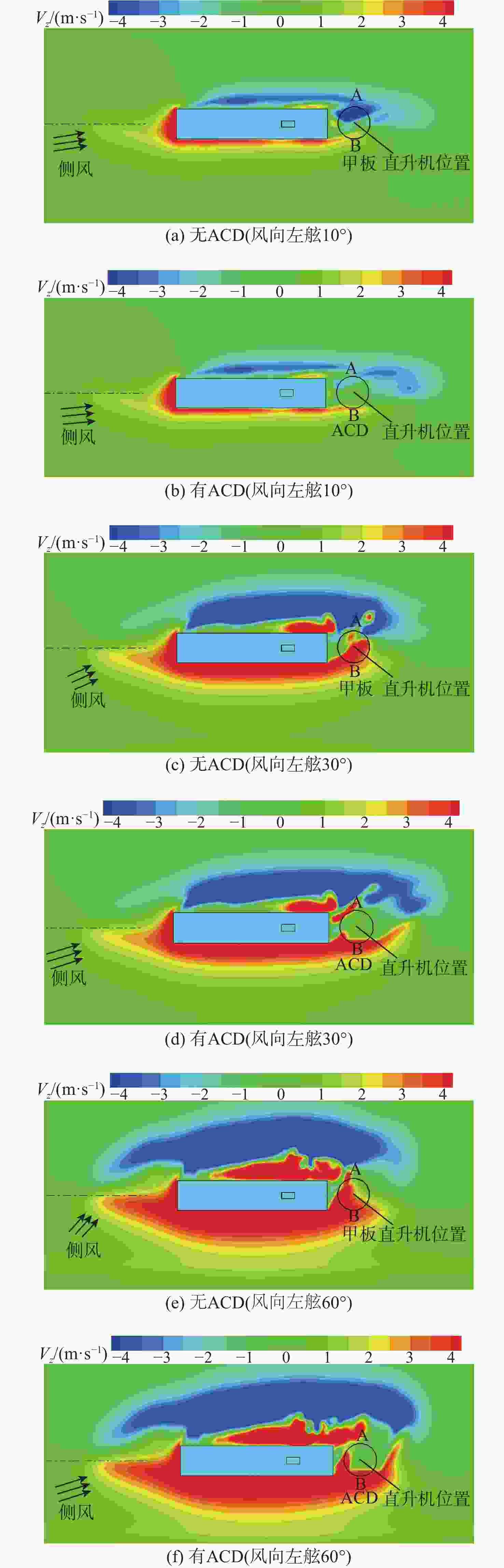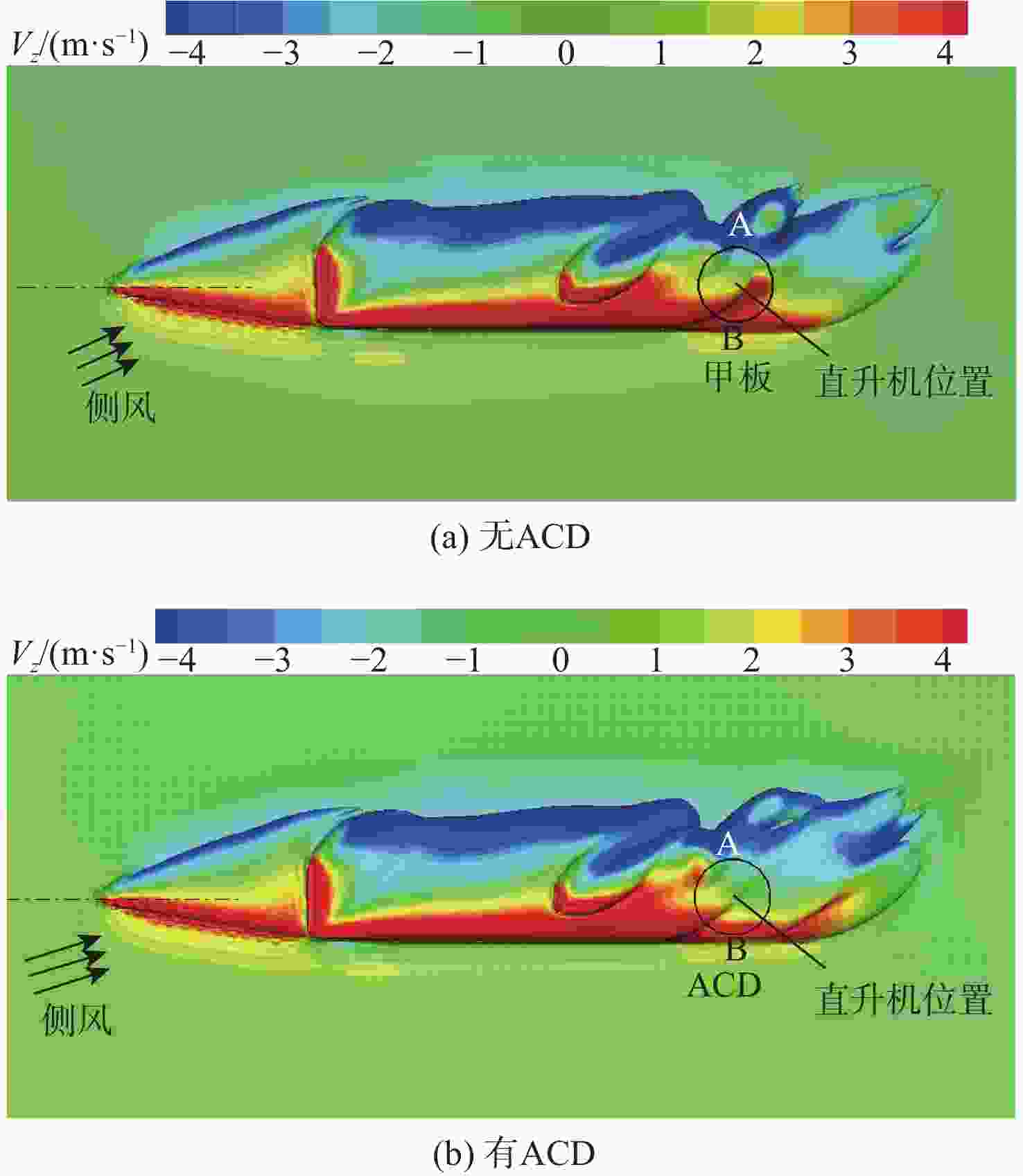 被动与主动流动控制可减小舰艇艉流强度,但直升机着舰甲板处仍存在明显回流现象,由此导致直升机气动载荷变化显著。提出了自动升降的舰艇主动甲板,建立基于格子玻尔兹曼方法(LBM)的舰艇主动甲板流场分析方法,并结合单向耦合模型,嵌入旋翼黏性涡粒子法,研究直升机主动甲板着舰气动载荷特性。通过与SFS2舰艇流场试验、分离涡模拟(DES)方法、大涡模拟(LES)方法比较,验证了所建方法的准确性。随后研究主动甲板对舰艇流场和直升机着舰气动载荷的影响特性。结果表明:相比于标准SFS2舰艇,主动甲板有效抑制了直升机着舰甲板处回流,以及直升机旋翼拉力损失、滚转和俯仰力矩,最大降幅分别为21.6%、55.1%、74.6%。