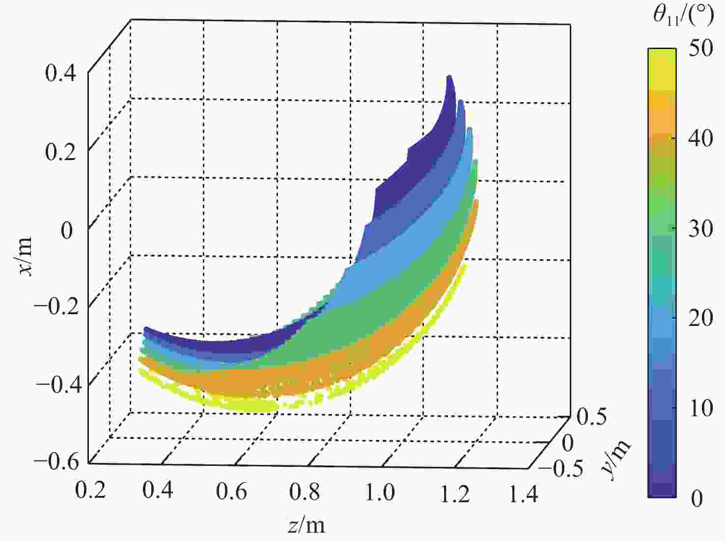 连杆k 转角${\phi _{k{{ - }}1}}$ 偏置${\alpha _{k - 1}}$ 转角${\varphi _k}$ 偏置${d_k}$ 1 0 0 $ {\beta _i} $ 0 2 0 ${r_i}$ 0 ${h_i}$ 3 $ {\text{π}} /2 $ 0 ${\alpha _i} + {\theta _{i_1}}$ 0 4 0 ${m_i}$ ${\theta _{i_2}}$ 0 5 $ - {\text{π}}/2 $ 0 ${\theta _{i_3}}$ 0 6 0 ${l_i}$-${l_{di}}$ 0 0 表 3 工况参数取值