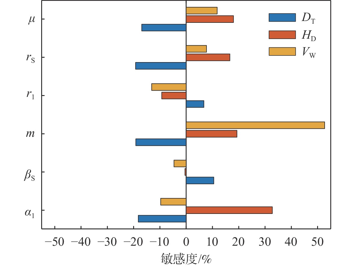 $ {\alpha _1} $/(°) $ m $/m $ {r_{\text{S}}} $/m $ {V_{\text{W}}} $/10−3 m3 $ {D_{{\text{Tmin}}}} $/mm $ {H_{{\text{Dmin}}}} $/mm 初始值 最优解 初始值 最优解 初始值 最优解 初始值 最优解 初始值 最优解 初始值 最优解 36.87 41.73 0.200 0.214 0.125 0.095 7.28 7.91 354.34 368.50 312.70 313.30 -
