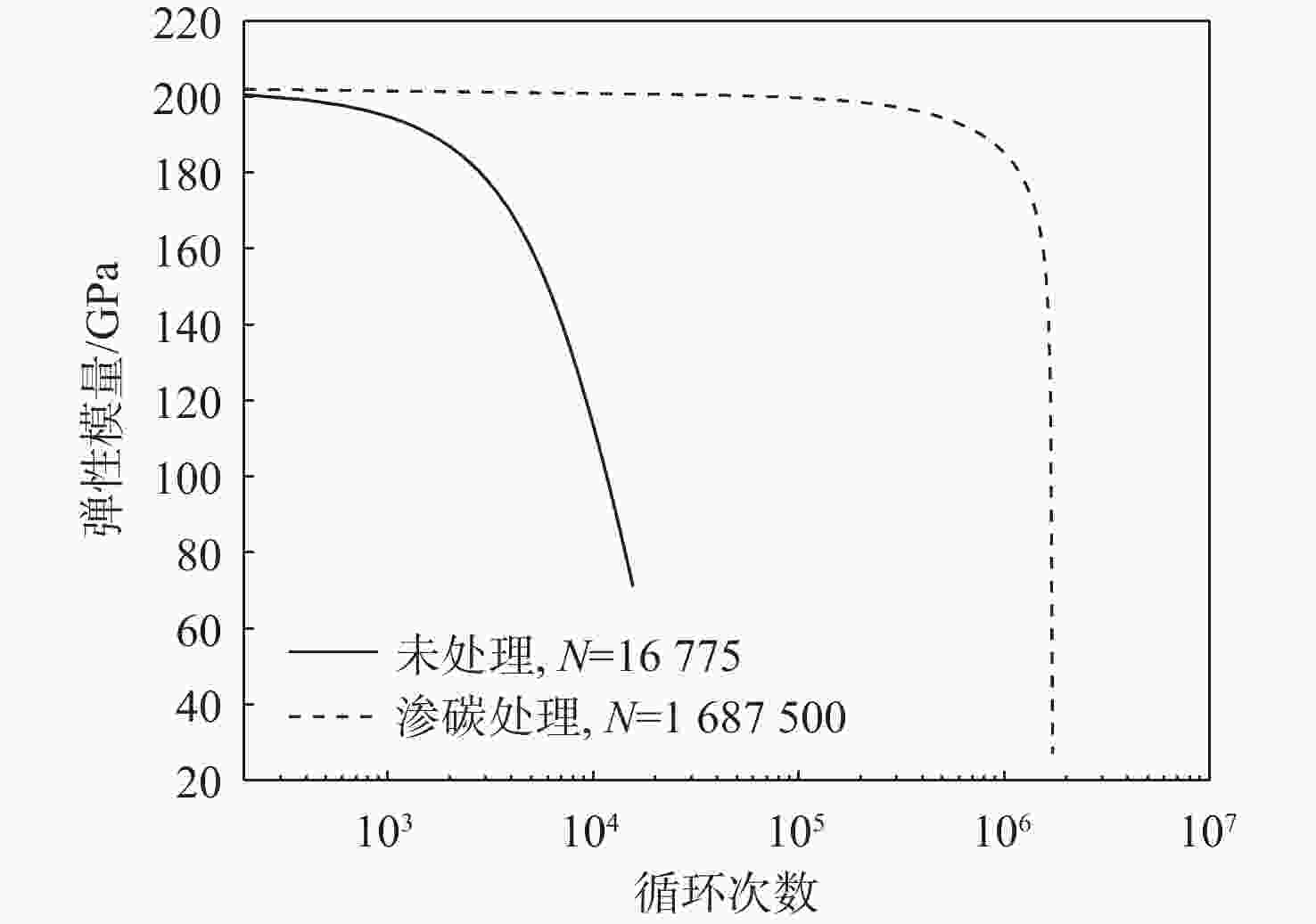 工艺 深度/mm E/GPa H/GPa Am B n 渗碳 0.4 196.71 8.60 1306.44 7317.83 0.5 0.8 198.51 8.46 1227.16 7233.58 0.5 1.2 199.78 7.45 949.23 6743.53 0.5 1.6 204.97 6.96 766.31 6781.83 0.5 2.0 203.45 6.57 675.21 6594.20 0.5 2.4 203.24 6.30 635.20 6331.17 0.5 2.8 203.05 6.15 594.34 6278.78 0.5 3.2 203.51 6.13 572.66 6287.36 0.5 3.6 203.97 6.25 611.60 6368.36 0.5 4.0 204.50 5.76 539.57 5827.44 0.5 碳氮复渗 0.4 203.92 8.38 1175.38 7296.70 0.5 0.8 199.46 7.61 947.26 7118.17 0.5 1.2 197.52 6.57 709.87 6434.09 0.5 1.6 207.77 6.13 619.92 5980.08 0.5 2.0 197.58 5.92 585.75 5948.47 0.5 2.4 200.13 5.80 571.72 5795.60 0.5 2.8 204.56 5.87 562.89 5870.99 0.5 3.2 207.28 5.87 551.67 5923.64 0.5 3.6 201.42 5.89 575.66 5848.25 0.5 4.0 201.81 5.77 564.22 5774.15 0.5 表 3 未进行表面硬化处理的M50NiL轴承钢试件的疲劳损伤材料参数