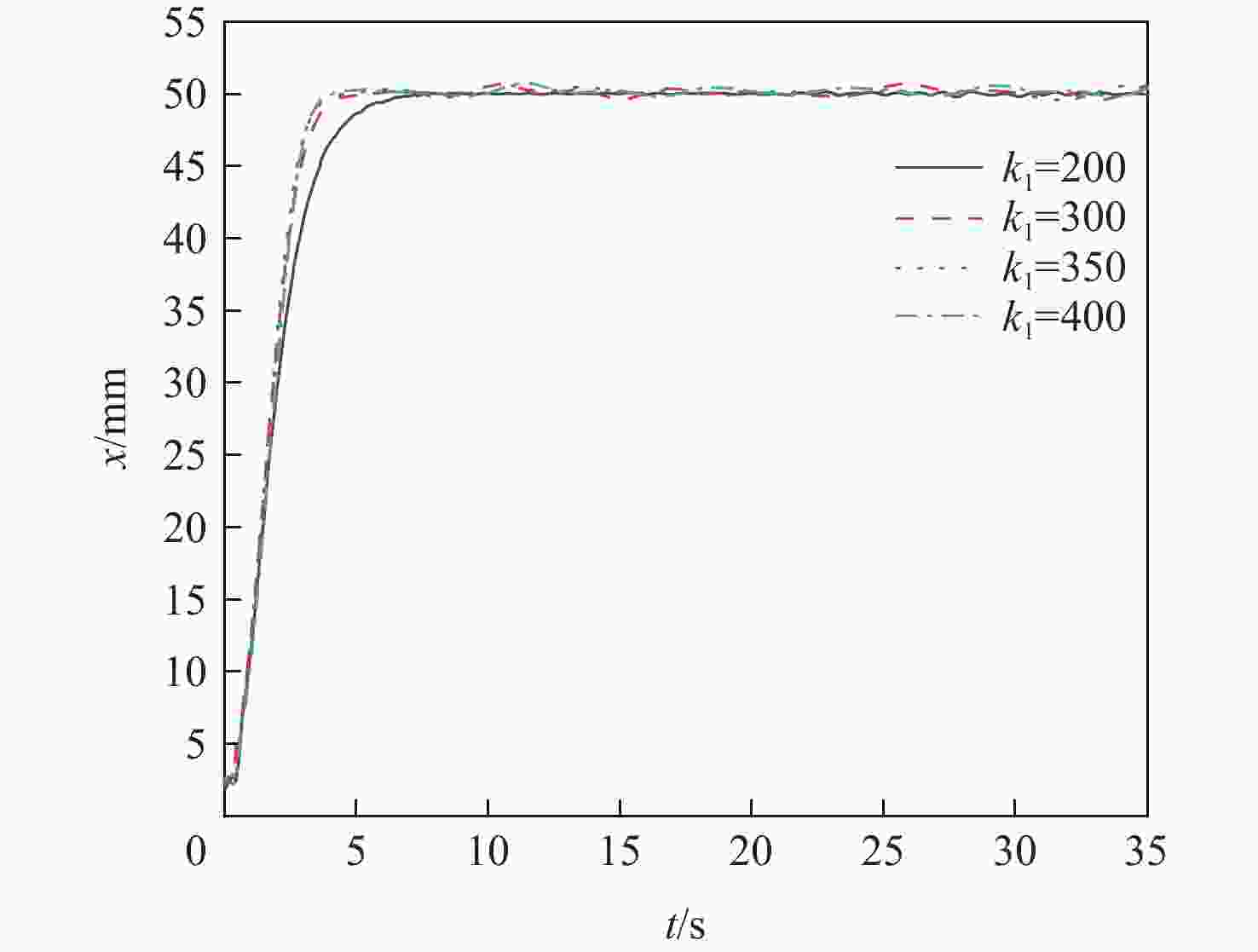 反演代表参数 上升时间/s 控制精度/mm 最大超调量占比/% $ {k}_{1}=200 $ 8.49 0.09 0.18 $ {k}_{1}=300 $ 5.54 0.72 1.43 $ {k}_{1}=350 $ 4.62 0.65 1.31 $ {k}_{1}=400 $ 4.12 0.77 1.54 -