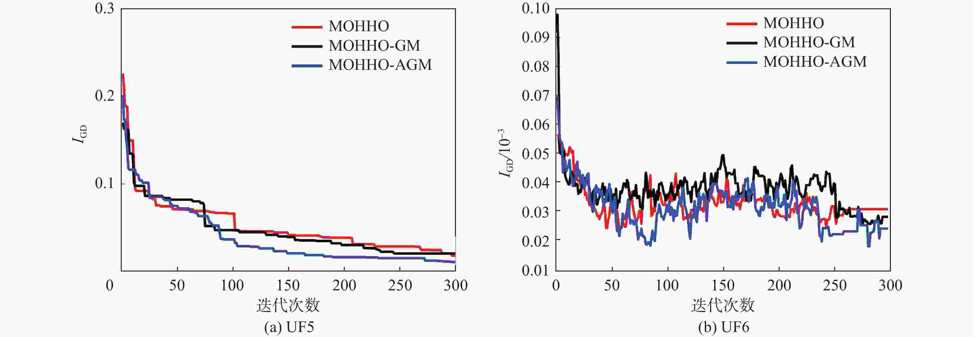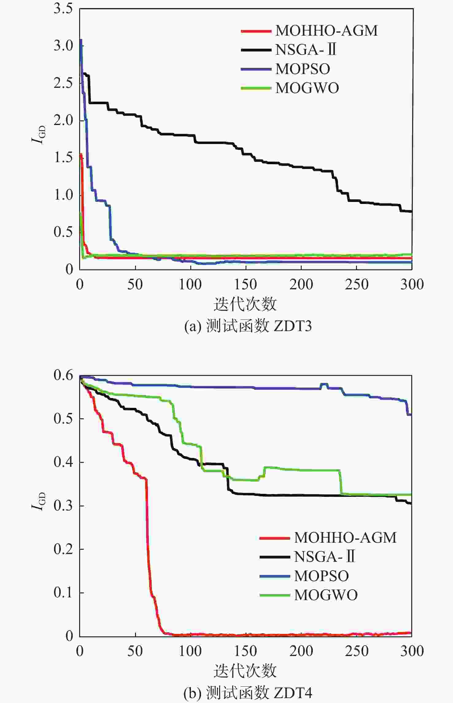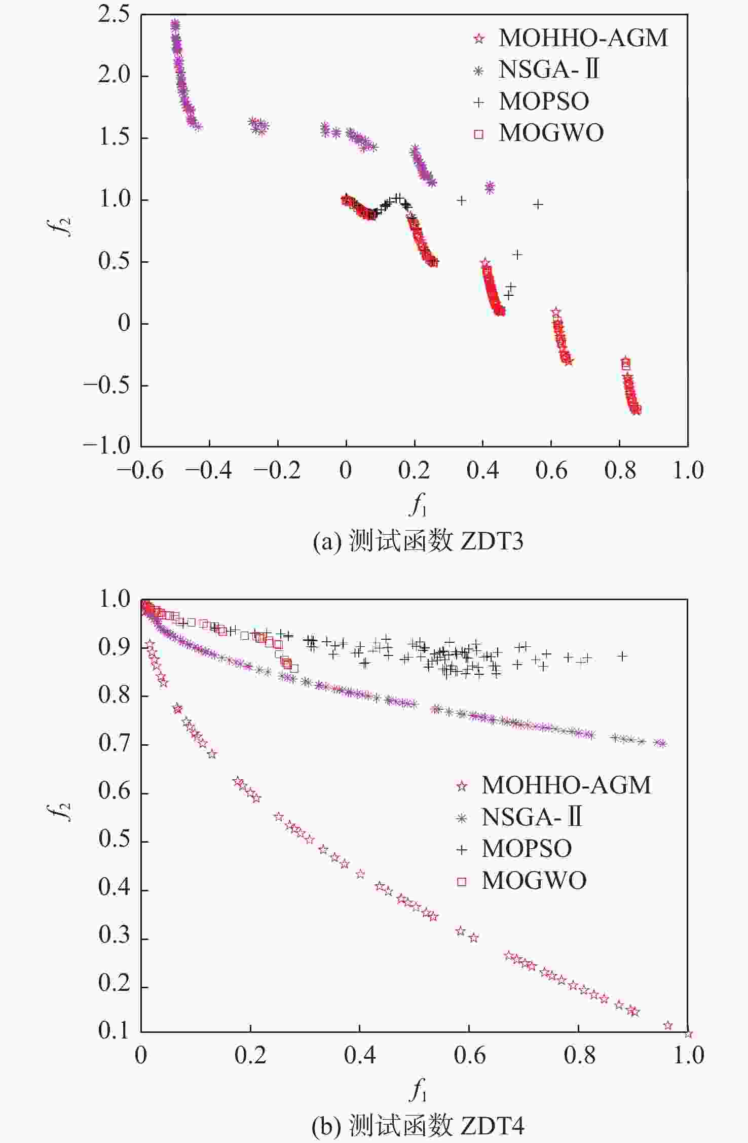 突变步长$ \sigma = 0.1 \times ({b_{\text{u}}} - {b_{\text{l}}}) $MOPSO 权重$ w = 0.5 $、学习因子$ {c_1} = 1.5、{c_2} = 1.5 $ MOGWO $ {a}_{\mathrm{max}}=2、{a}_{\mathrm{min}}=0 $ MOHHO $ {E_0} \in [ - 1,1] $、$ {E_1} \in [0,2] $ MOHHO-GM $ {E_0} \in [ - 1,1] $、$ {E_1} \in [0,2] $、变异率$ M_{\mathrm{P}} = 0.1 $、