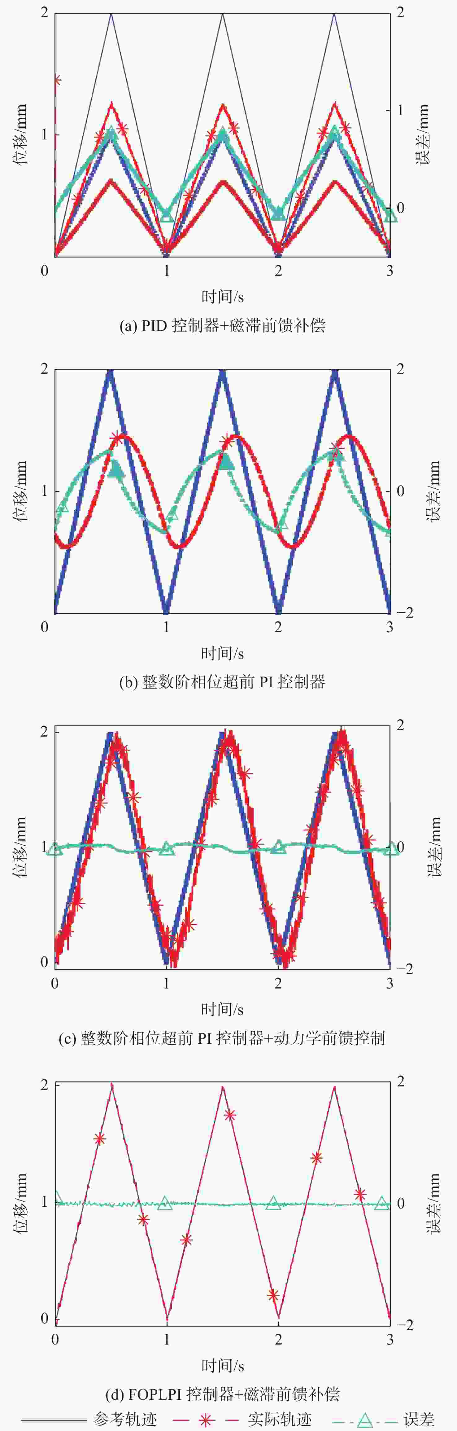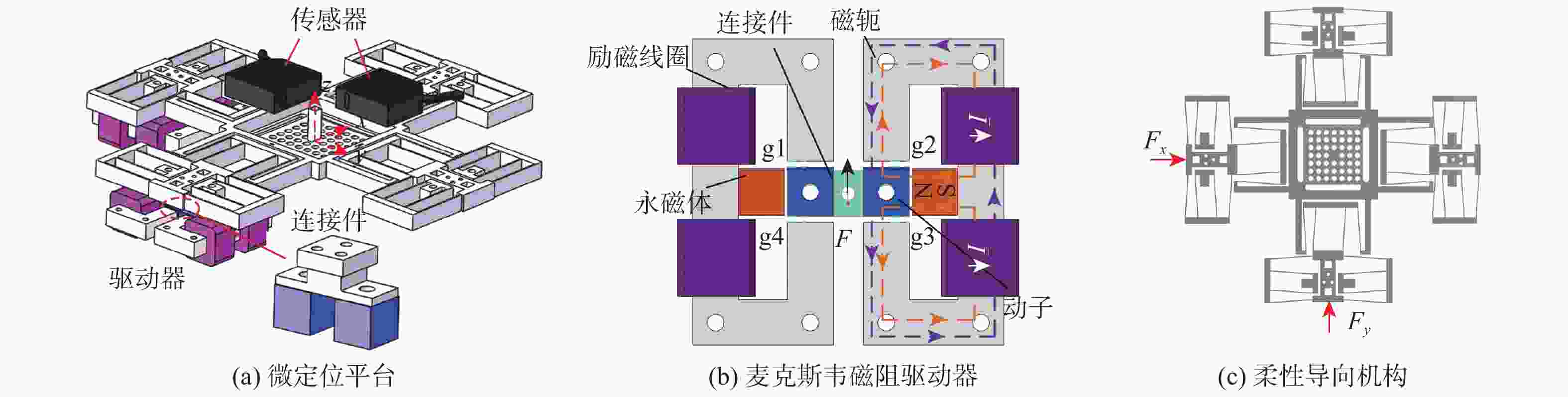 麦克斯韦磁阻驱动器克服了传统压电陶瓷驱动器行程小及音圈电机推力密度和效率低等难题,在大行程高速微纳米定位中具有极大的应用潜力。设计了一种基于麦克斯韦磁阻驱动的大行程二自由度柔顺微定位平台,并对其进行了高性能轨迹跟踪控制。该定位平台由2个永磁偏置的麦克斯韦磁阻驱动器和二自由度并联解耦柔性导向机构组成,平台利用磁阻驱动器的非线性负刚度来部分补偿柔性导向机构的弹性恢复力,有效提高了运动行程和能量传递效率,使其在±2 mm行程范围内的所需推力从±120 N减少至±24 N。轨迹跟踪控制方面,为补磁阻驱动器偿驱动器软磁材料冲磁带来的磁滞非线性,利用逆Prandtl-Ishlinskii磁滞模型构建了率相关磁滞补偿控制器并将其置于前馈回路中。为解决平台低阻尼谐振及动力学模型不一致等问题,设计了含分数阶相位超前环节的PI反馈控制器以完成对系统开环频率特性的灵活调整,实现了对平台的高精度轨迹跟踪控制,有效减小了系统的跟踪误差。对2 mm幅值、1 Hz和10 Hz频率的三角波信号进行轨迹跟踪所得到的均方根误差分别为0.013 mm和0.017 mm。