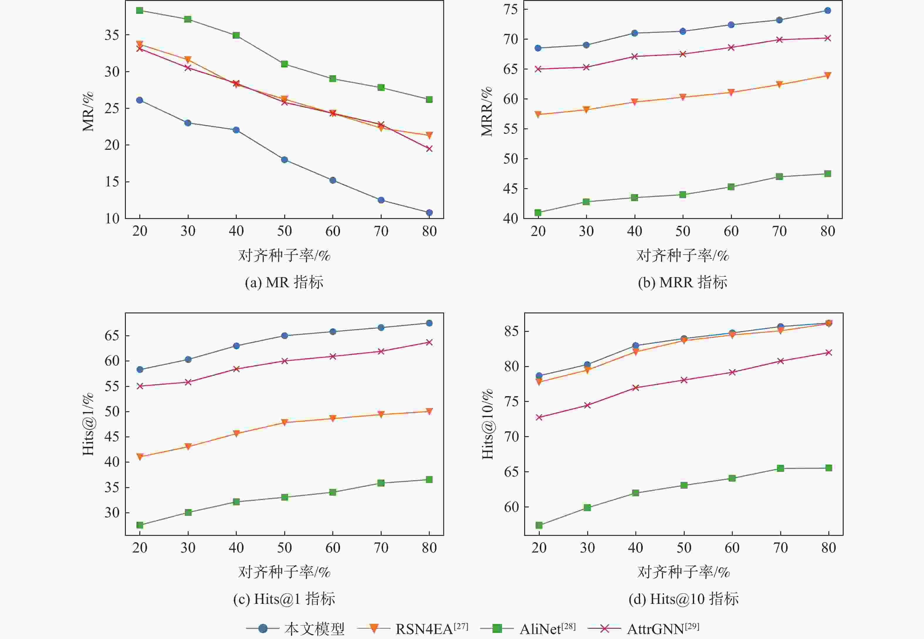 % 模型 MR MRR Hits@1 Hits@10 GCN-align[22] 51.37 60.73 50.92 77.38 KDCoE[23] 33.83 53.35 36.83 60.24 MuGNN[24] 42.82 47.23 47.85 68.76 SEA[25] 28.23 64.27 51.21 70.72 MultiKE[26] 41.78 54.93 51.19 75.25 RSN4EA[27] 32.72 49.02 52.72 73.82 AliNet[28] 38.83 61.38 53.48 75.63 AttrGNN[29] 28.28 62.82 53.05 75.42 本文模型 26.24 66.32 57.82 81.73 表 6 消融实验