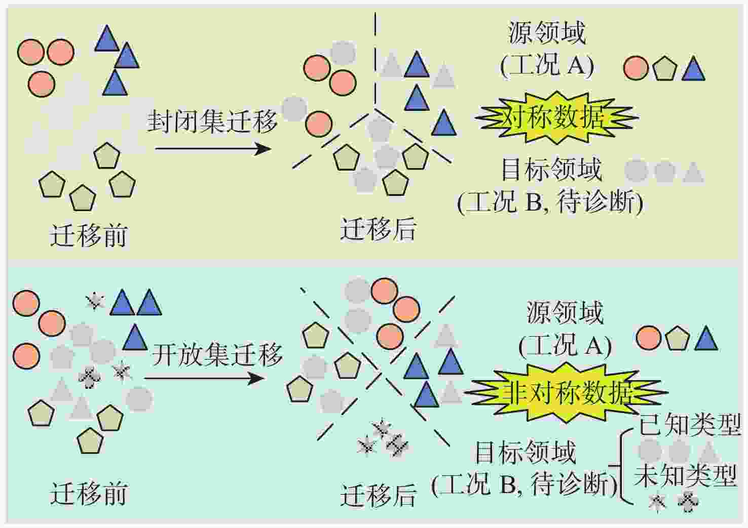 齿轮箱部件 故障模式 是否正常 故障1 故障2 故障3 齿轮 32T 正常 裂纹 正常 正常 96T 正常 正常 正常 正常 48T 正常 偏心 偏心 正常 80T 正常 正常 断齿 正常 轴 输入 正常 正常 正常 不平衡 输出 正常 正常 正常 正常 轴承 轴承1 正常 正常 滚动体 正常 轴承2 正常 正常 正常 滚动体 轴承3 正常 正常 正常 外圈 轴承4 正常 正常 正常 正常 轴承5 正常 正常 正常 正常 轴承6 正常 正常 正常 正常 表 2 基于DANN的开放集故障诊断任务设置及诊断结果