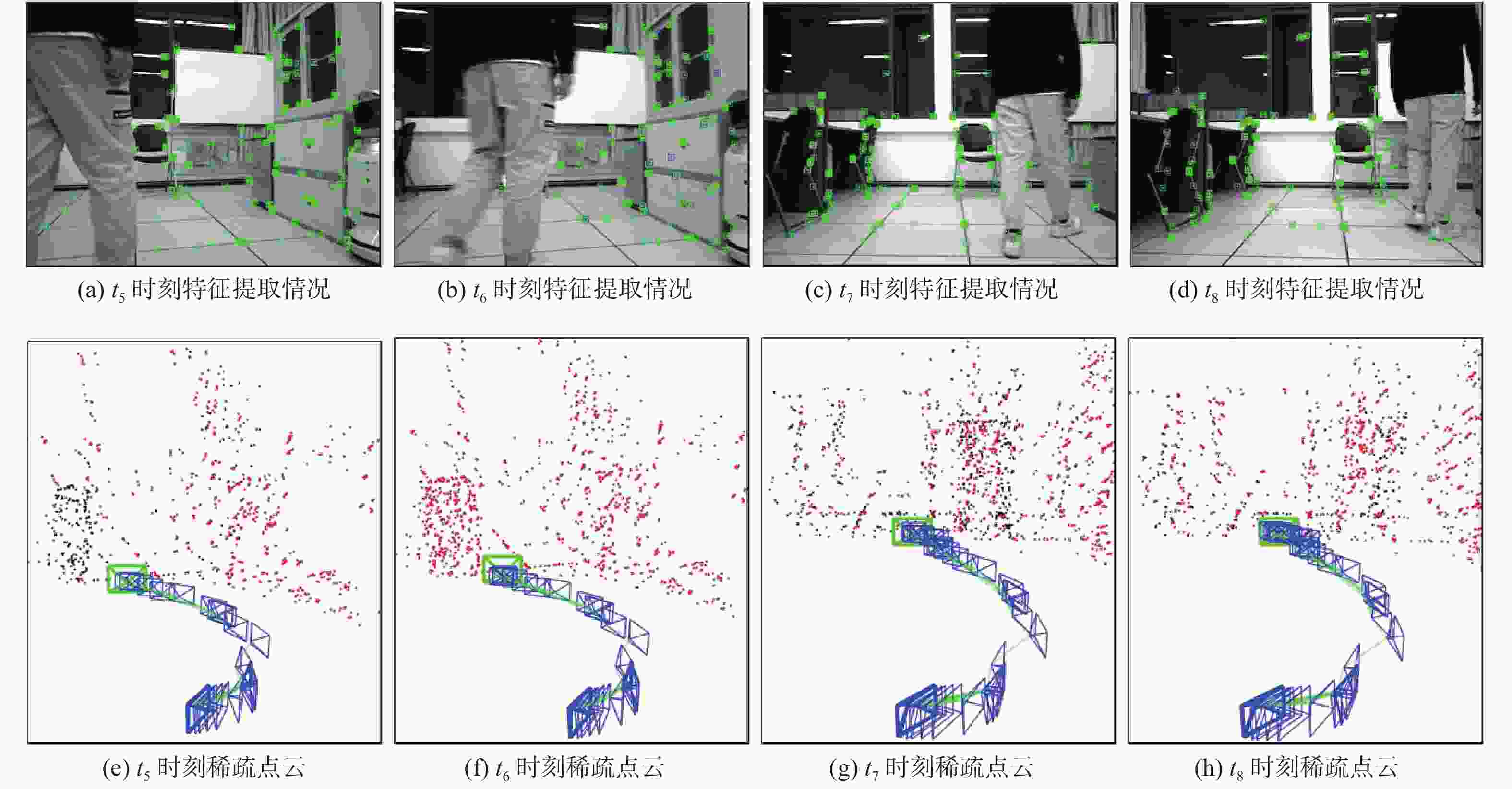 针对动态场景中动态物体会导致机器人在进行位姿估计时引入大量动态误差的问题,提出一种利用特征点间几何约束来剔除动态特征点的移动机器人3D 同步定位与地图构建(SLAM)算法。利用当前帧的ORB特征点与上一帧特征点生成的地图点进行投影匹配,通过引入Delaunay三角剖分法构建能够表示2帧间、匹配地图点间几何关系的三角网。利用相邻2帧地图点的几何关系变化检测出动态特征点,考虑到静态特征点可能被误检测为动态特征点而导致特征点缺失的情况,在相邻2帧匹配时提取更多的特征点以实现静态特征点的补偿,进而剔除动态特征点,实现对移动机器人位姿的精确估计。在此基础上,通过引入滑动窗口提取关键帧并完成闭环检测,从而构建出精确的3D稠密地图。在多组公开数据集上进行仿真实验及室内动态场景下的实验,结果表明,所提算法能够有效剔除动态特征点,提高移动机器人在动态场景中位姿估计的精度和地图的一致性。