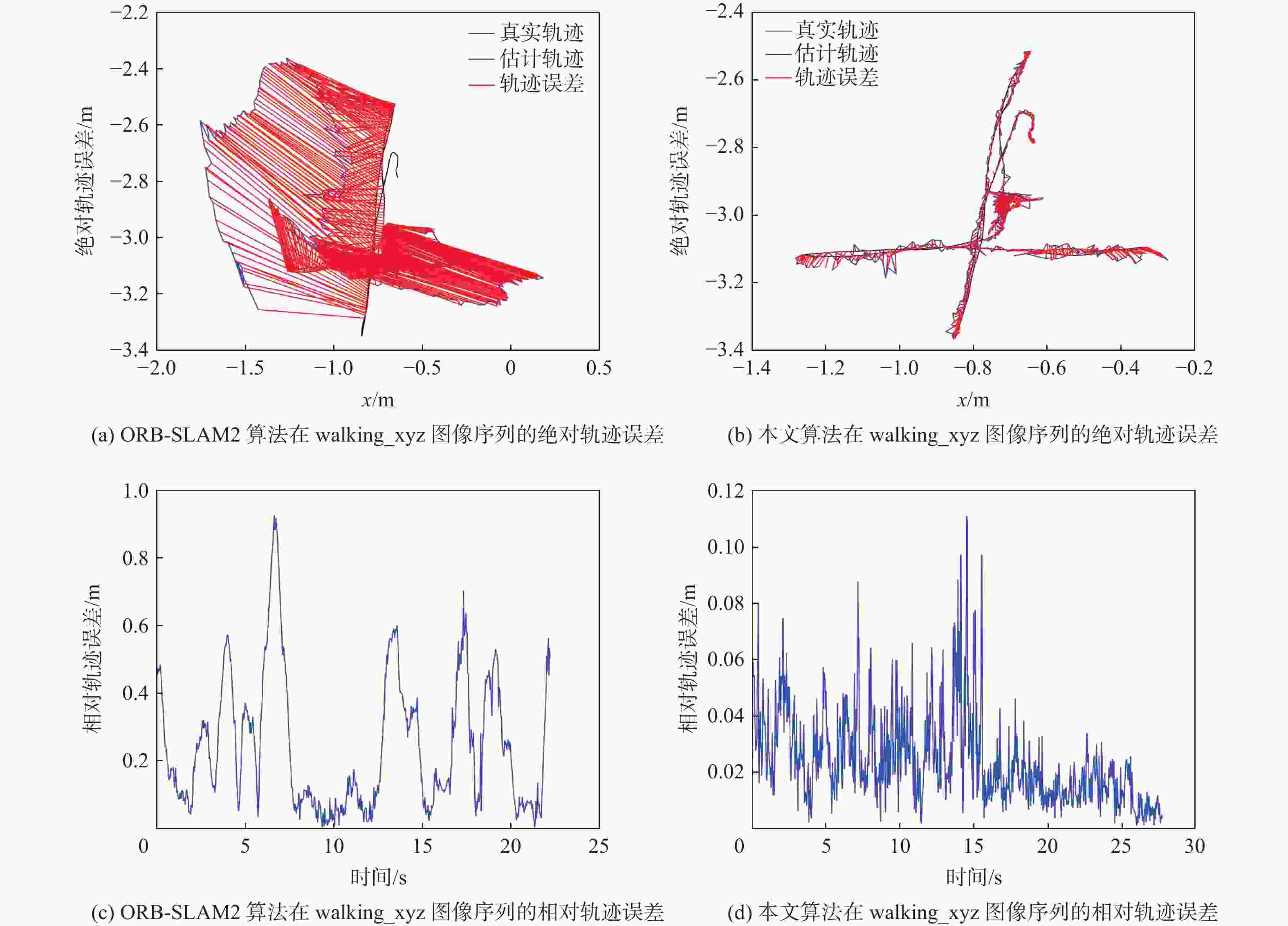 m 图像序列 绝对轨迹误差 ORB-SLAM2 半直接法 DVO+MR Detect-SLAM 本文算法 walking_static 0.4300 0.0080 0.0656 0.0079 walking_xyz 0.6202 0.0371 0.0932 0.0241 0.0231 walking_rpy 0.6689 0.1333 0.2959 0.3174 walking_halfsphere 0.3231 0.0409 0.1252 0.0514 -