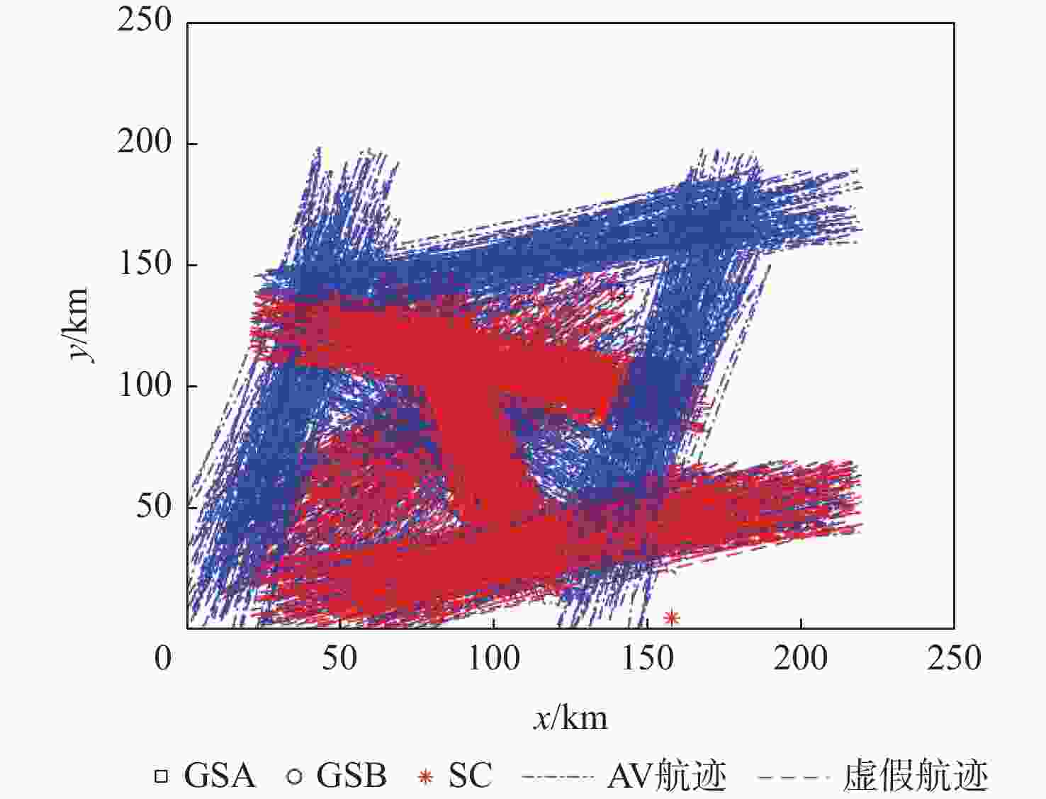 参数 数值 地面站A的位置坐标/km (140,140,0) 地面站B的位置坐标/km (40,40,0) 静止欺骗源SC的位置坐标/km (157.68,4.67,0) 航空器AV的航迹 随机生成900条航迹 时间测量误差的标准差/s 6.4×10−9 地面站时间同步误差/s 2×10−8 ADS-B水平位置误差的标准差/km 4×10−3 ADS-B垂直位置误差的标准差/km 6.6×10−3 虚警概率 0.01 表 2 TDOA与IDOA的检测性能比较