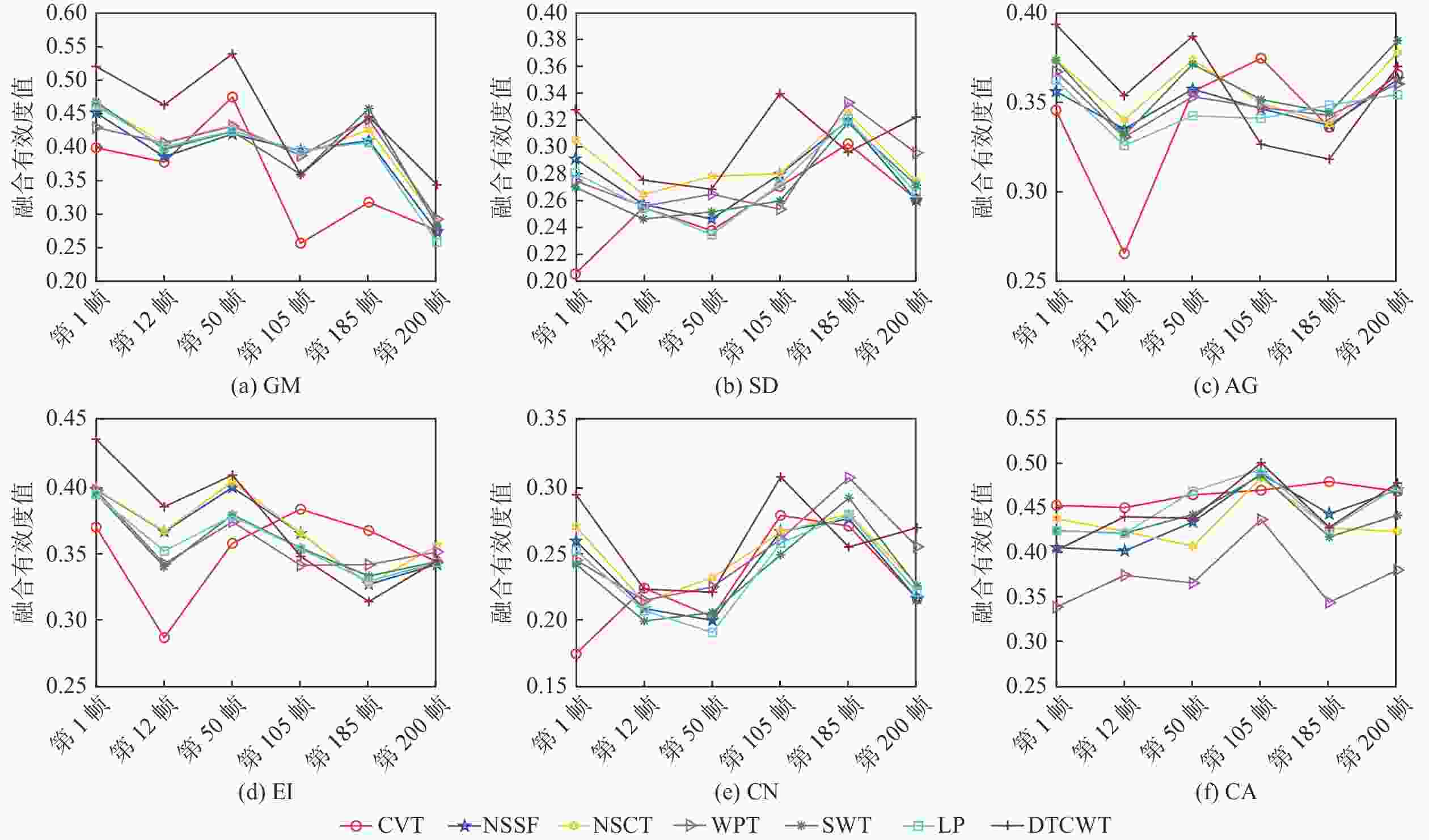 差异特征 视频序列 第1帧 第12帧 第50帧 第105帧 第185帧 第200帧 GM 0.5801 0.2426 0.4845 1.0000 0.3197 0 SD 0.3231 0.1945 0.2304 0.0066 1.0000 0.4437 AG 0.2097 0.0403 0.1344 0 1.0000 0.4429 EI 0.5950 0.3563 0.2882 0.2663 1.0000 0.5973 CN 0.5165 0.2431 0.3735 0 0.5683 0.4481 CA 0.3851 0 0.4701 0.5629 0.6641 0.2062 表 2 各帧对应的最优融合算法变元