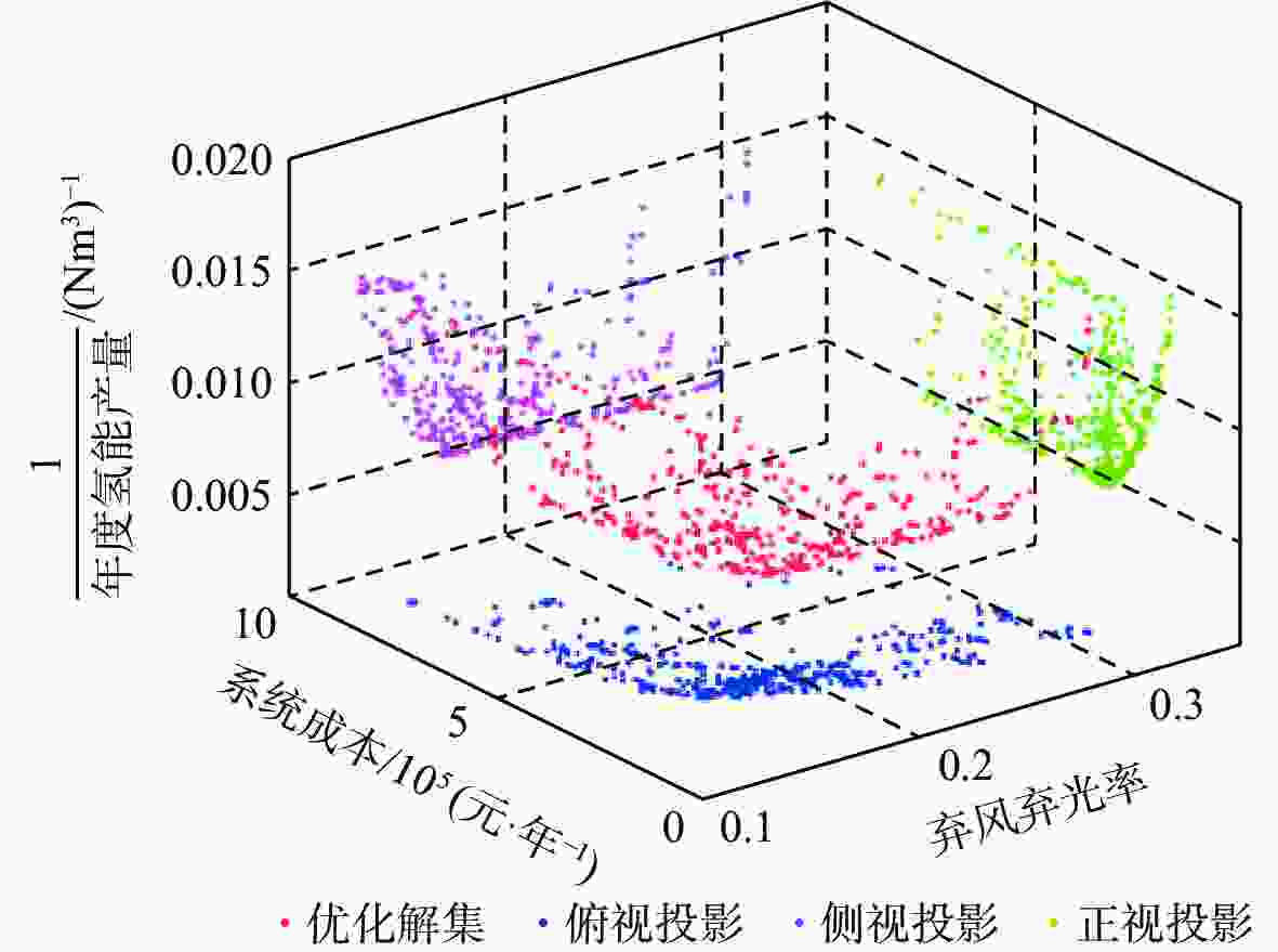 编号 弃风弃光率 系统成本/元 年度氢能产量/Nm3 1 0.134 795453 76.923 2 0.181 346965 200 3 0.277 238842 142.857 4 0.258 339334 250 $\vdots $ 表 3 理想目标函数取值范围