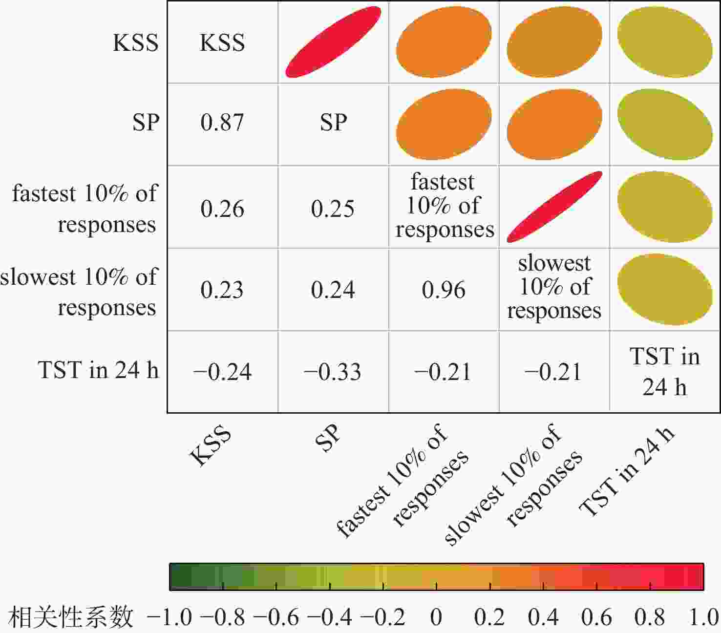 指标 相关系数R 显著性p KSS SP KSS SP KSS 1.000 0.874 0.000 0.000 SP 0.874 1.000 0.000 0.000 表 3 主观自评与客观测试指标间的相关性分析