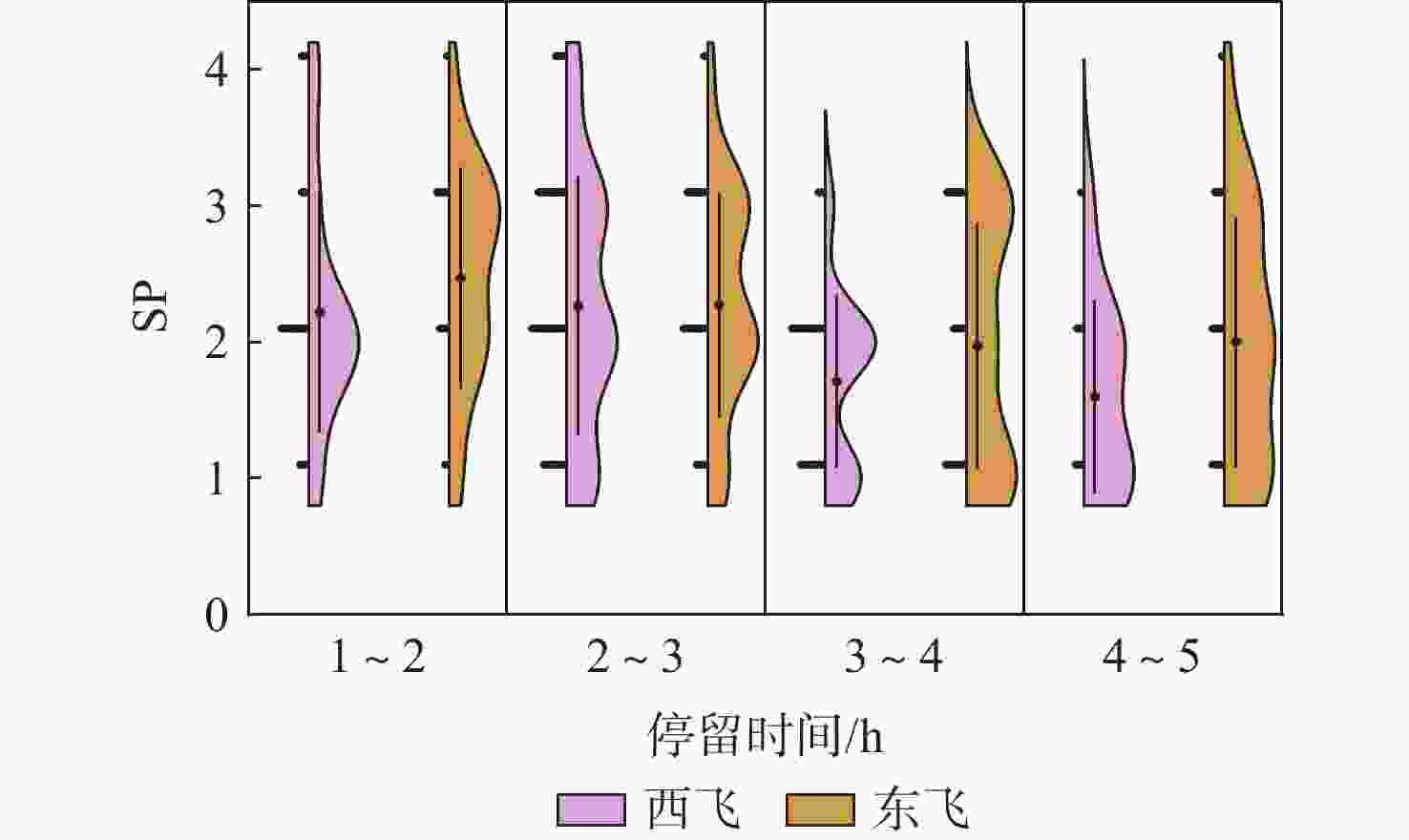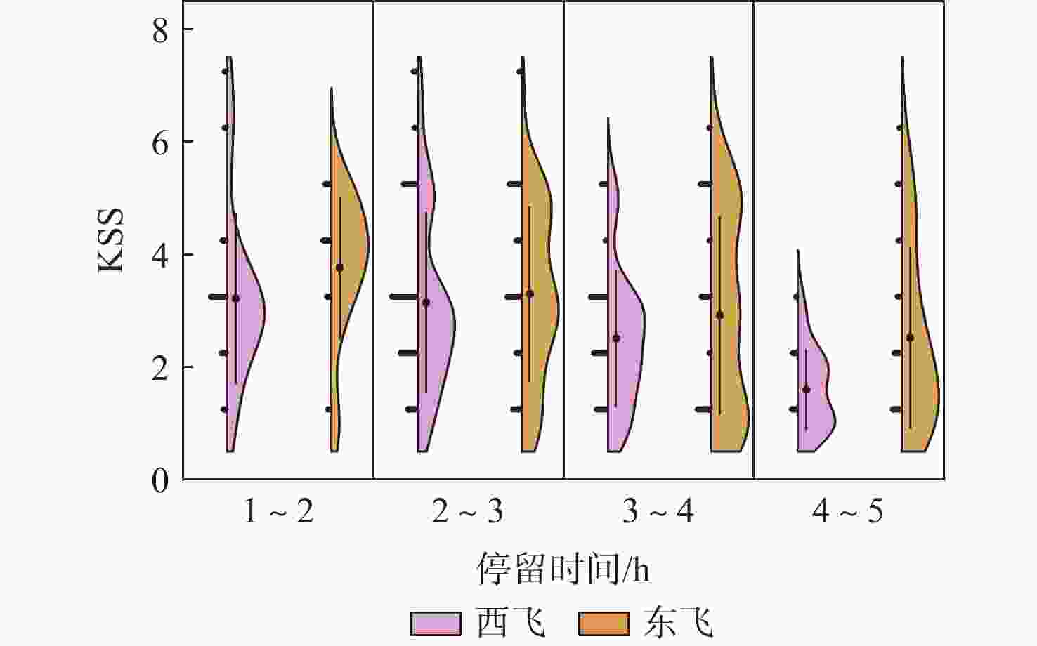航班 停留时间/h 飞行员人次 飞行方向 飞行时间/h 值勤时间/h 跨越时区/h 洛杉矶−北京 1~2 6 西飞 12.81 ± 1.77 13.53 ± 1.61 −16 洛杉矶−北京 2~3 12 西飞 13.60 ± 1.55 13.82 ± 1.59 −16 洛杉矶−北京 3~4 9 西飞 13.17 ± 1.90 13.81 ± 2.19 −16 洛杉矶−北京 4~5 5 西飞 13.04 ± 1.57 14.32 ± 2.27 −16 阿姆斯特丹−北京 1~2 6 东飞 11.54 ± 0.61 11.62 ± 0.68 +7 阿姆斯特丹−北京 2~3 9 东飞 11.46 ± 0.65 12.08 ± 0.69 +7 阿姆斯特丹−北京 3~4 10 东飞 11.40 ± 0.43 11.94 ± 0.53 +7 阿姆斯特丹−北京 4~5 7 东飞 12.15 ± 0.16 13.01 ± 0.35 +7 表 2 KSS与SP相关性分析