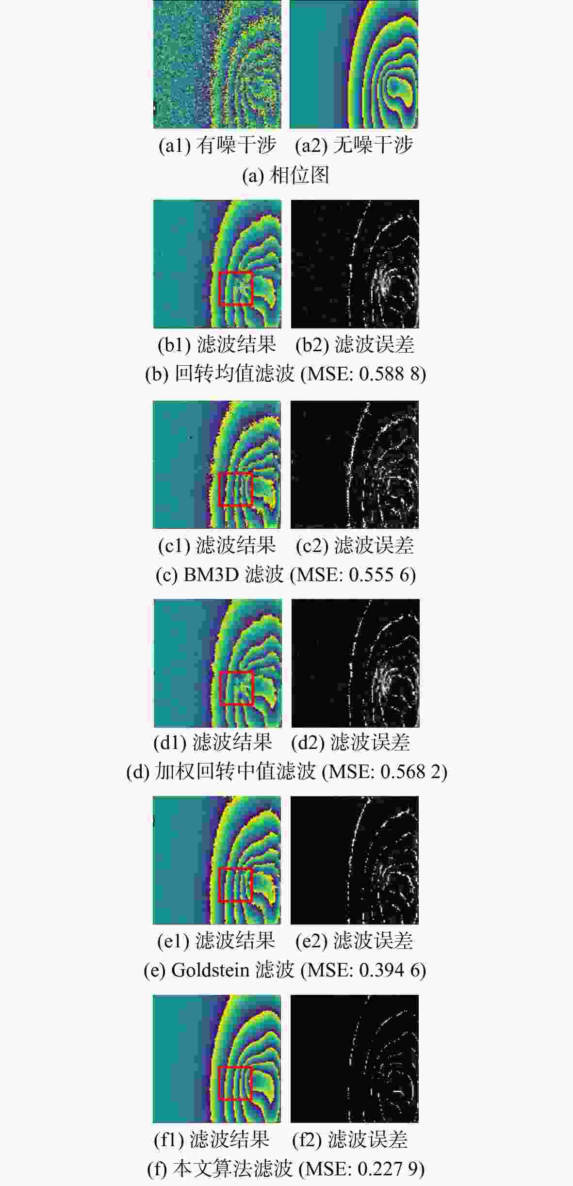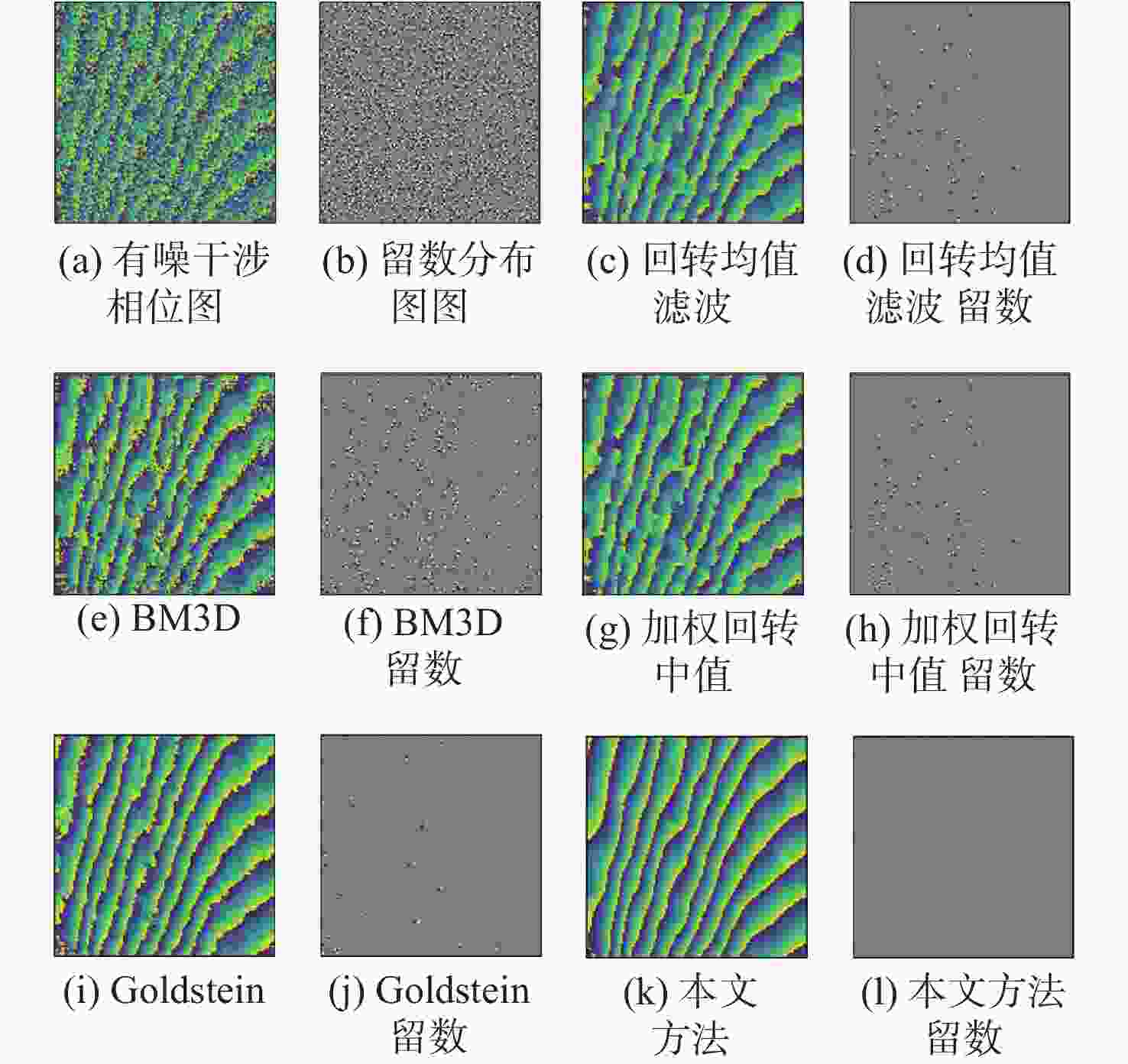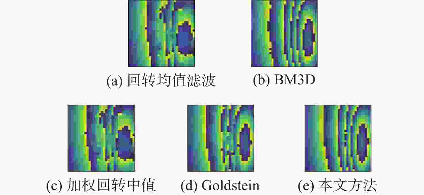 方法 RMSE 留数点 相干系数为0.9 相干系数为0.6 正 负 回转均值滤波 0.5116 0.5888 84 76 BM3D滤波 0.2659 0.5556 307 298 加权回转中值 0.5041 0.5682 87 80 Goldstein滤波 0.3405 0.3946 31 27 本文方法 0.1110 0.1909 8 3 注:RMSE是仿真数据,留数点是实测数据。 -