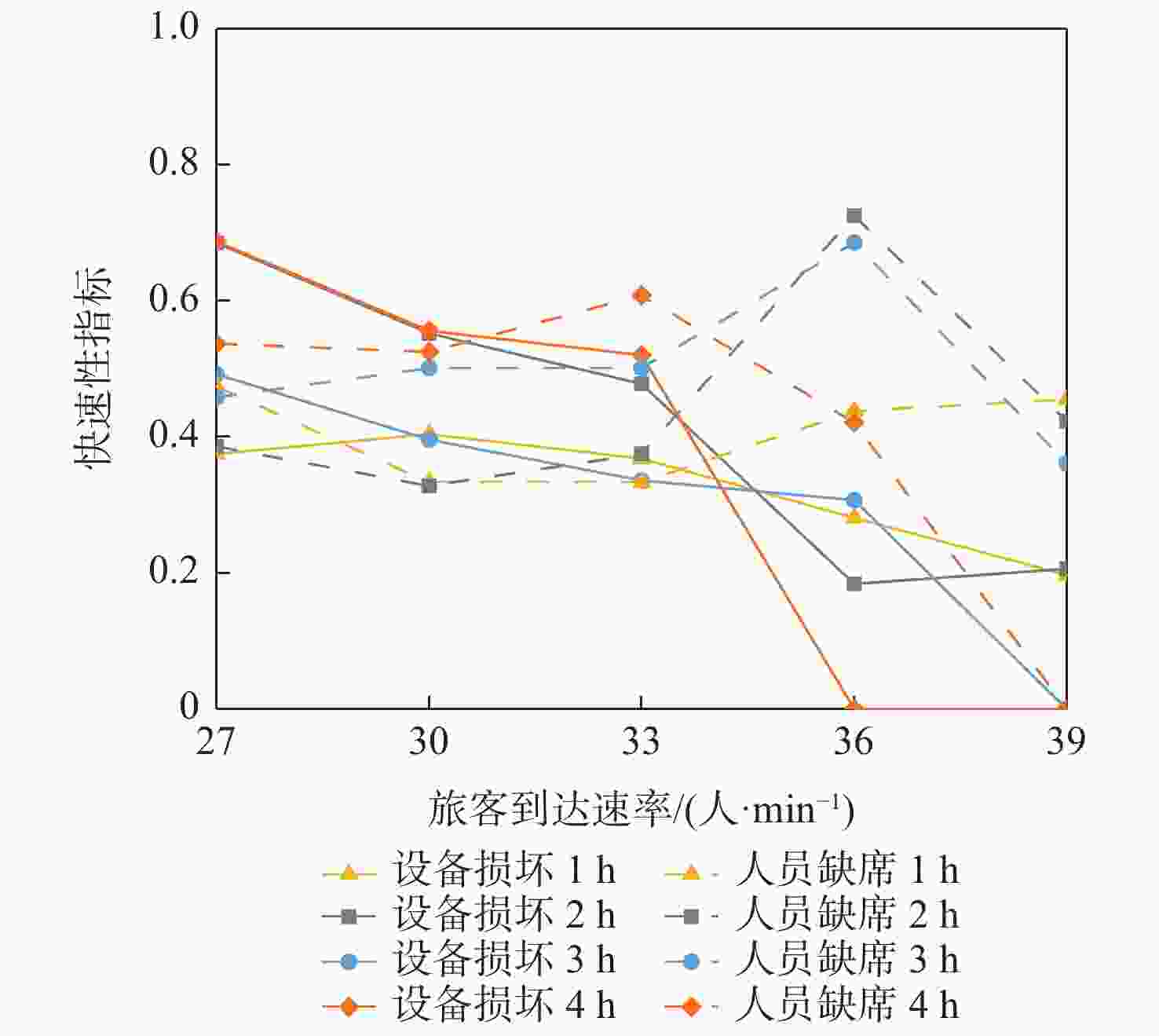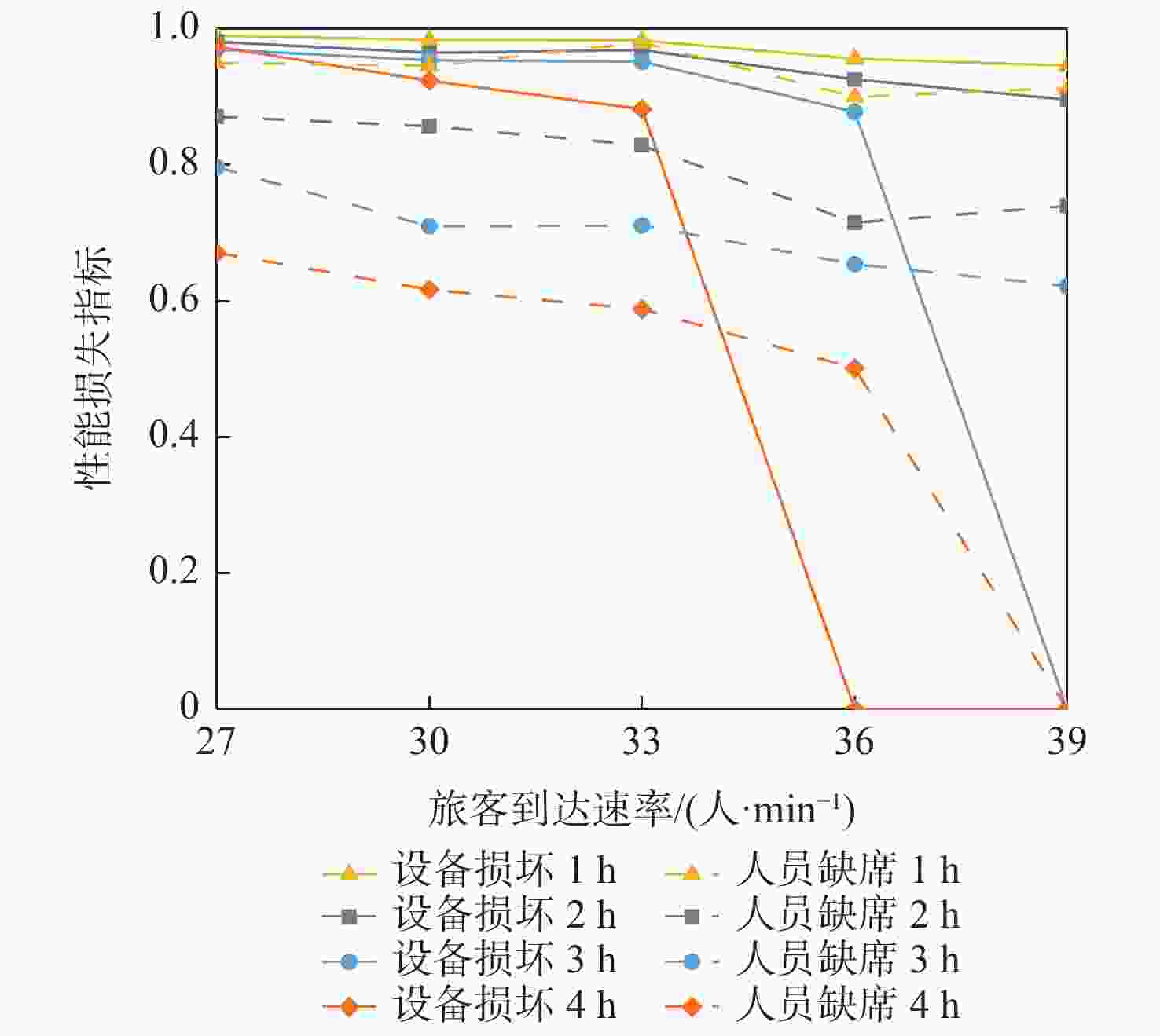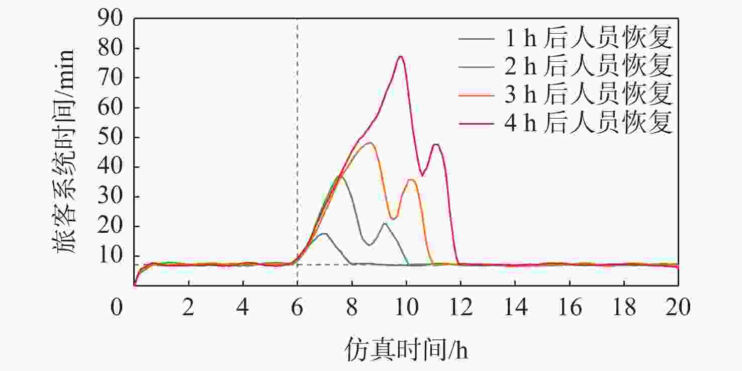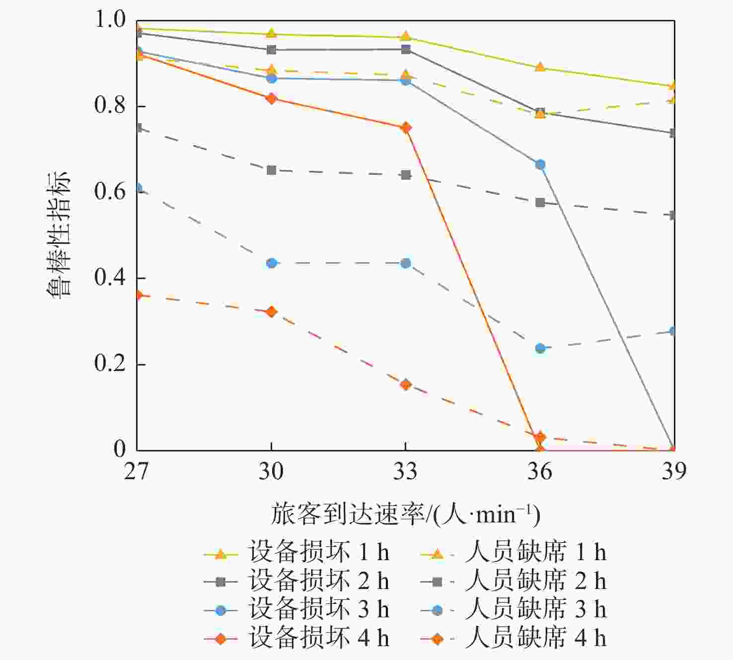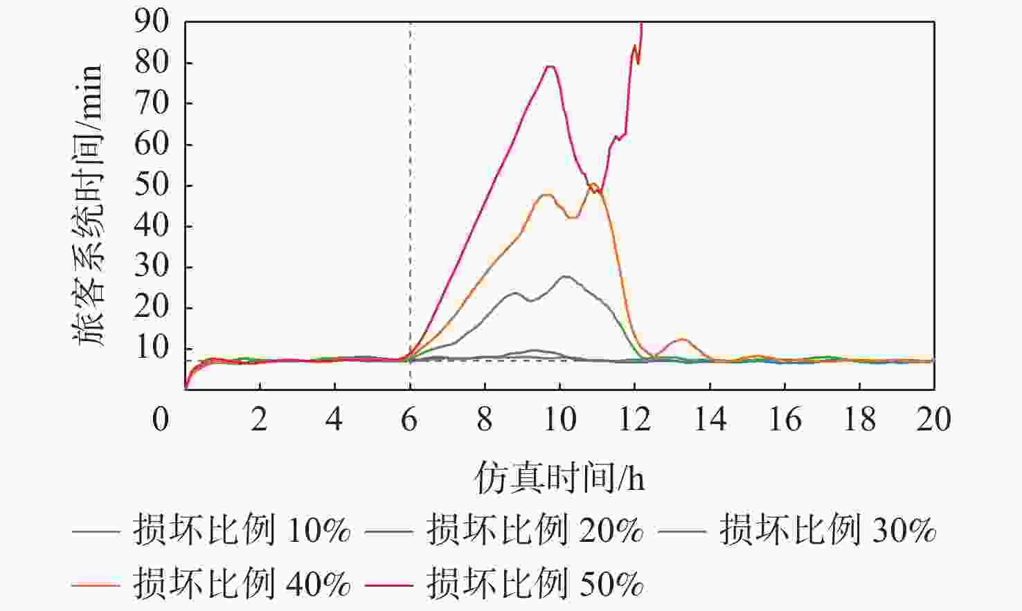 提高航站楼运行韧性是减少偶然事件下人员财产损失、减轻破坏程度、尽快恢复功能的最佳办法。目前,对航站楼缺乏基于运行性能指标时变过程的韧性定量分析理论与技术。基于此,提出综合体现鲁棒性、快速性与系统性能损失的航站楼系统综合韧性指标的航站楼运行韧性理论框架,基于离散事件模拟,得出航站楼运行系统在设备损坏、人员缺席2种扰动情景及不同扰动时间、旅客到达率下的韧性变化规律,并提出提高安检效率及设备冗余率2种韧性提升策略。结果表明:系统鲁棒性指标、性能损失指标均与扰动时间及旅客到达率呈负相关;对于设备损坏和人员缺席2种情景,提升安检效率使系统综合韧性水平分别从原有的0.325、0.054提升至0.834、0.913,提升设备冗余率使系统综合韧性水平从0.22提升至0.638。