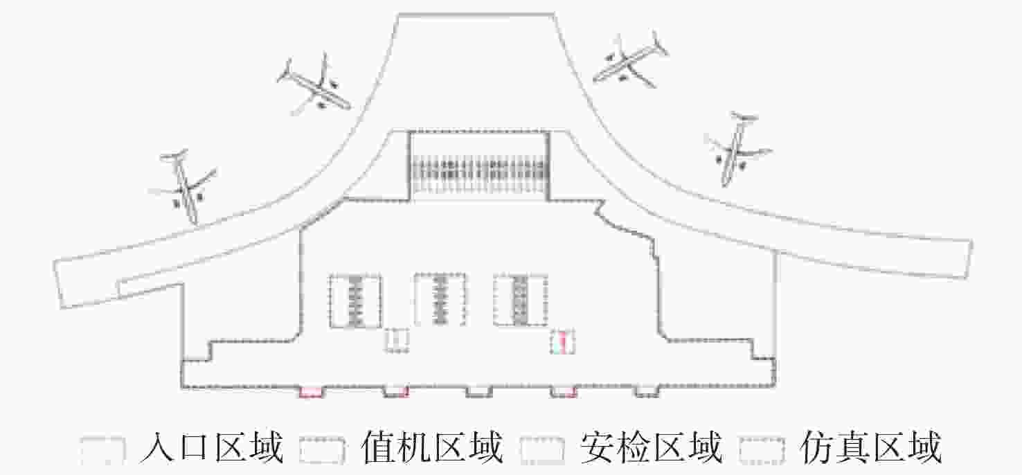 参数 数值 航站楼入口/个 5 自助值机设备/台 28 人工值机设备/台 72 安检通道/条 20 行李安检仪/台 40 仿真区域宽度/m 150 仿真区域长度/m 318 表 2 旅客行为相关参数
