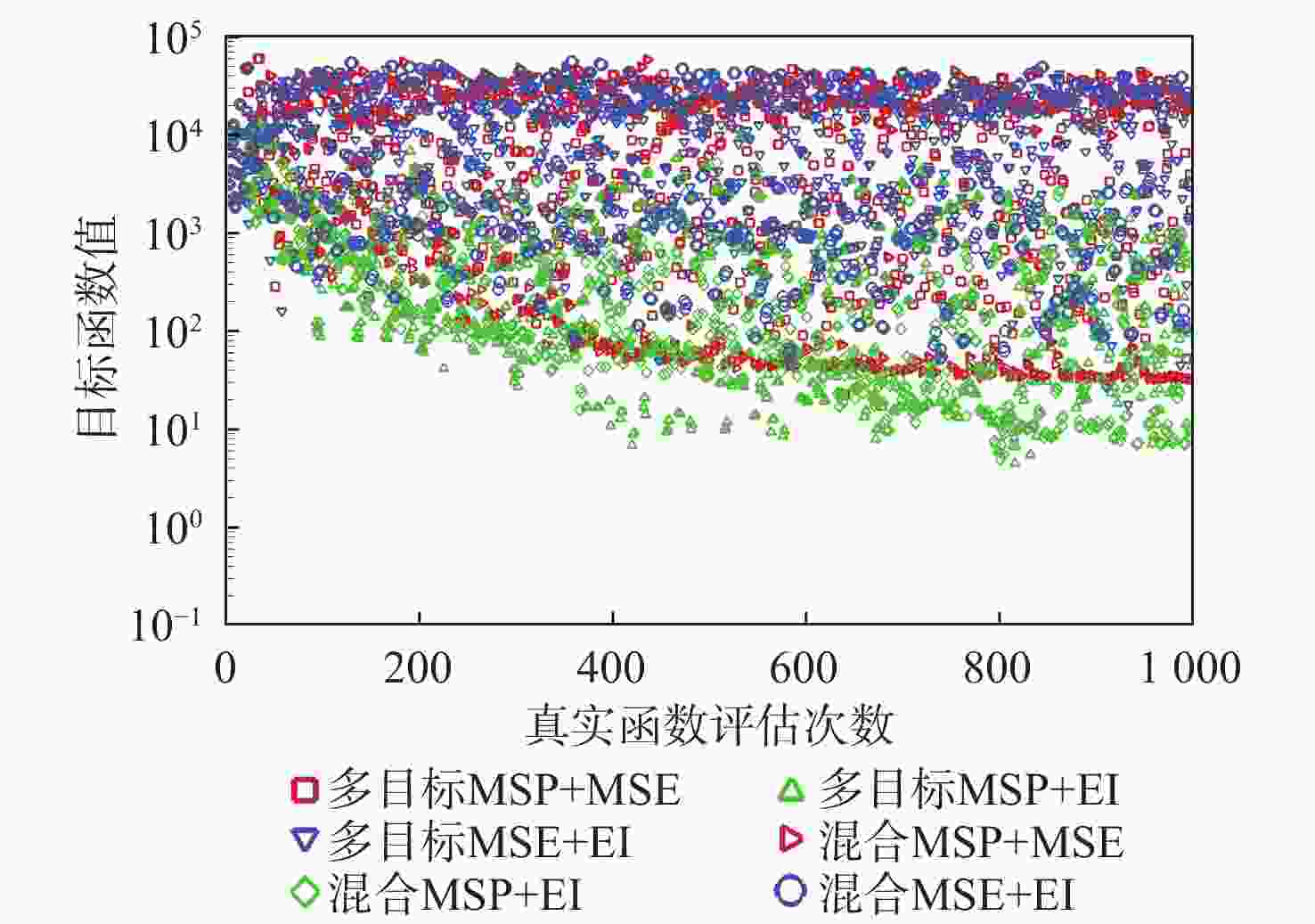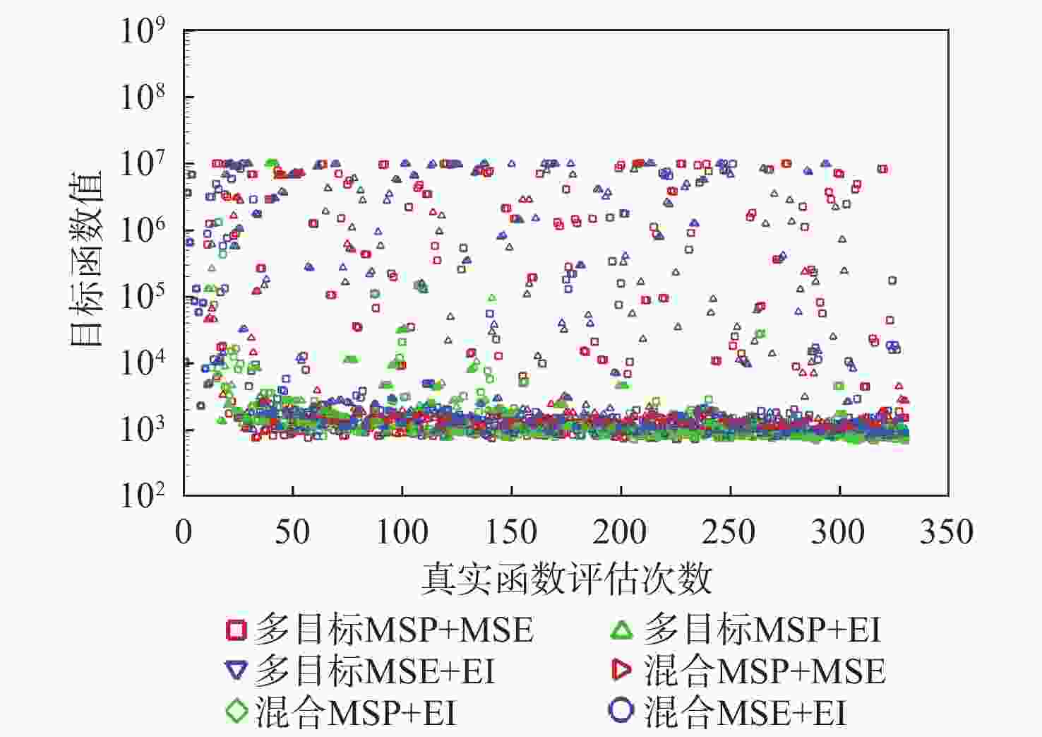 加点方法 最大最优解 最小最优解 平均最优解 方差 多目标MSP+MSE 31.727 22.363 27.279 11.692 多目标MSP+EI 9.278 4.492 6.7265 3.308 多目标MSE+EI 26.879 17.885 22.354 12.197 混合MSP+MSE 42.145 32.427 37.042 12.072 混合MSP+EI 12.658 4.930 9.065 7.995 混合MSE+EI 58.527 48.084 53.356 14.805 表 5 G9函数优化结果对比