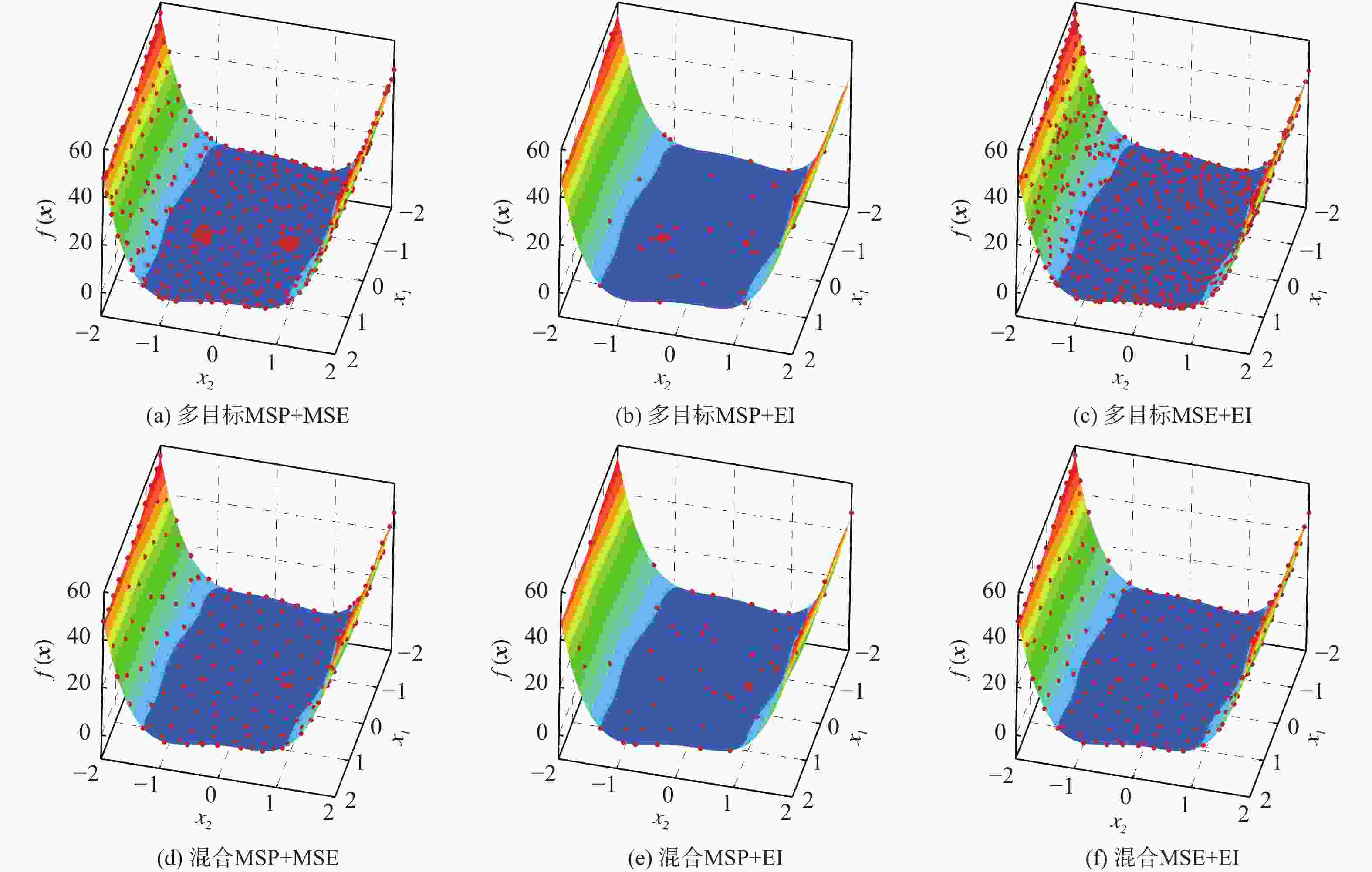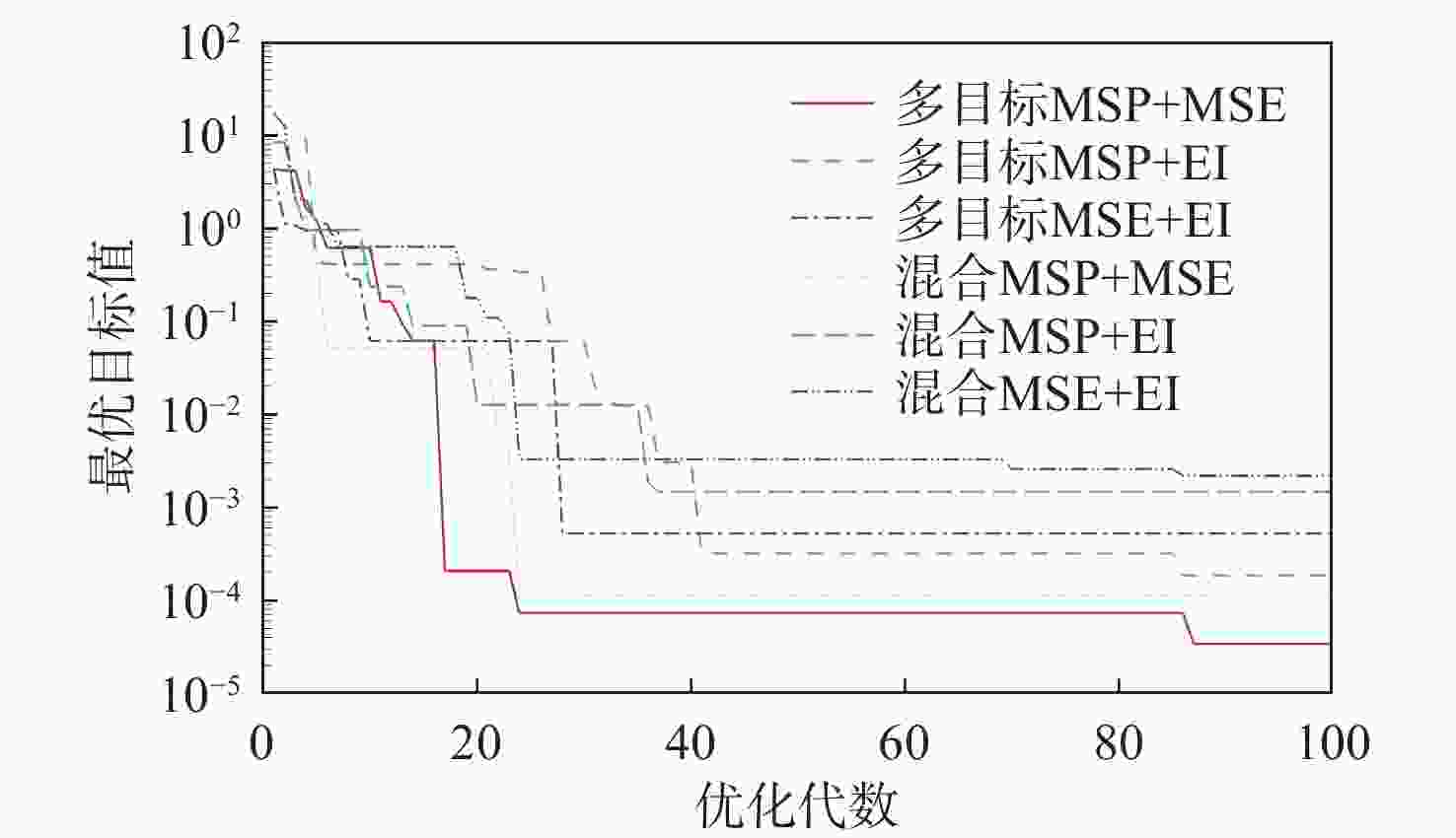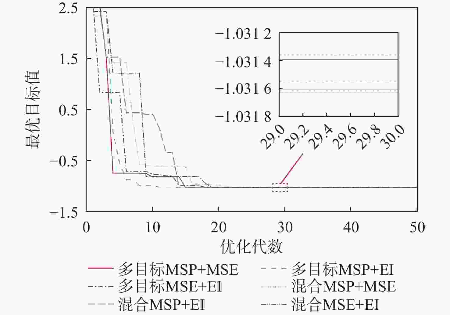 加点方法 最大最优解 最小最优解 平均最优解 方差 多目标MSP+MSE −1.031585 −1.031608 −1.031586 7.919×10−11 多目标MSP+EI −1.031620 −1.031628 −1.031624 8.500×10−12 多目标MSE+EI −1.031565 −1.031616 −1.031593 3.525×10−10 混合MSP+MSE −1.031546 −1.031587 −1.031562 2.527×10−10 混合MSP+EI −1.031606 −1.031617 −1.031612 1.219×10−11 混合MSE+EI −1.031502 −1.031547 −1.031525 3.977×10−10 表 2 GN函数优化结果对比