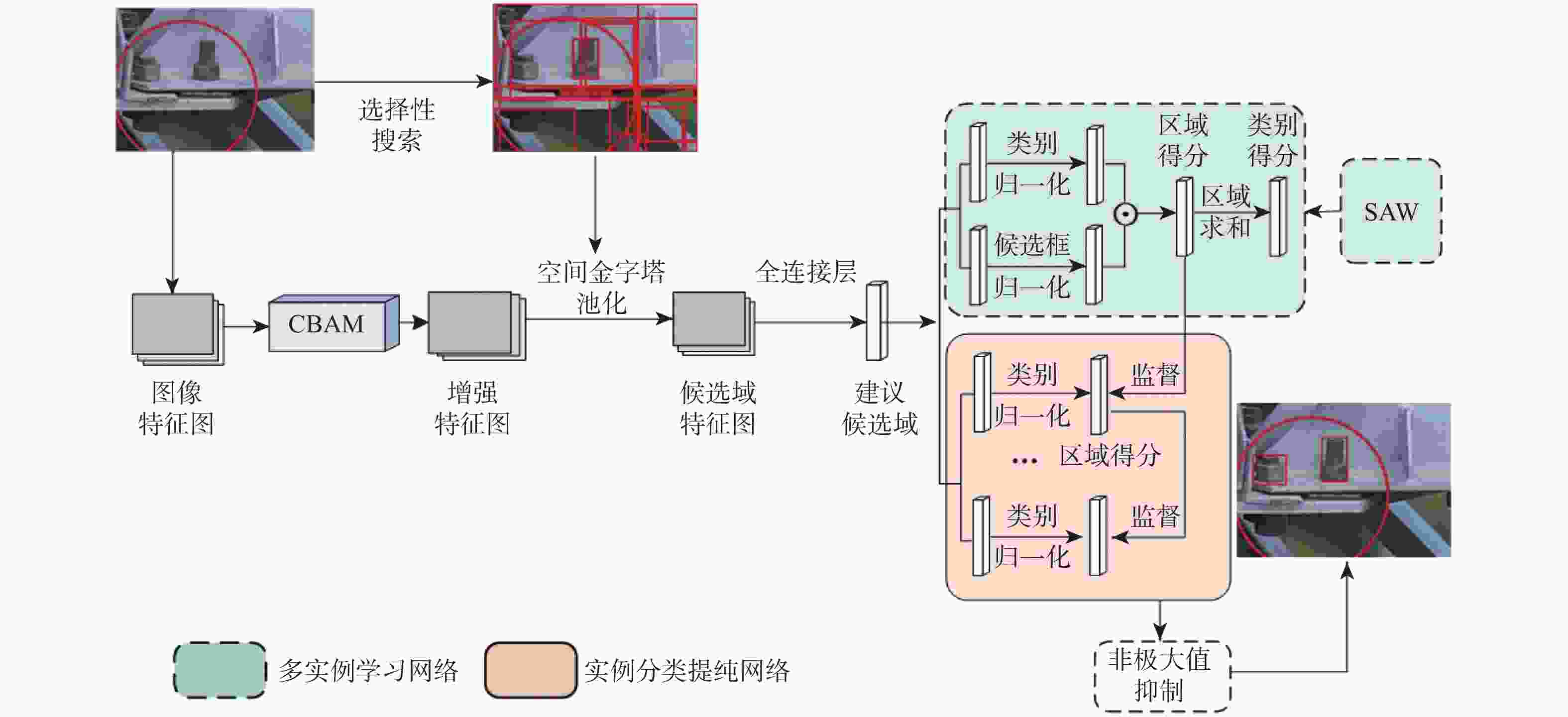 螺栓作为输电线路中不可或缺的紧固件,其缺销必然会引起重大的安全隐患。针对螺栓目标较小、标注难度大的问题,提出了一种基于SAW-PCL的输电线路缺销螺栓弱监督检测方法。该方法通过图像级标注信息即可定位到螺栓目标。在主网络中引入卷积块注意模块(CBAM),抑制无用的背景特征,提取螺栓精细特征,提高螺栓的检测能力。针对弱监督检测中缺销螺栓的检测精度远低于正常螺栓及不平衡性问题,提出自适应加权损失函数(SAW),动态调节模型对不同类别样本的学习程度,均衡不同类别之间的检测精度,并定义了平均类间检测精度差(ADPD)来评价不平衡性。构建的自适应加权损失函数可以提升缺销螺栓的检测精度,对正常螺栓和缺销螺栓的检测精度有一定的均衡能力,定义的ADPD可以评价模型检测性能的平衡度。在自建数据集V1上的实验结果表明:改进方法的平均准确率均值(mAP)提高了19.7%,ADPD值降低了21.8,在mAP和ADPD双重指标评估下的模型表现出了更好的缺销螺栓检测能力。