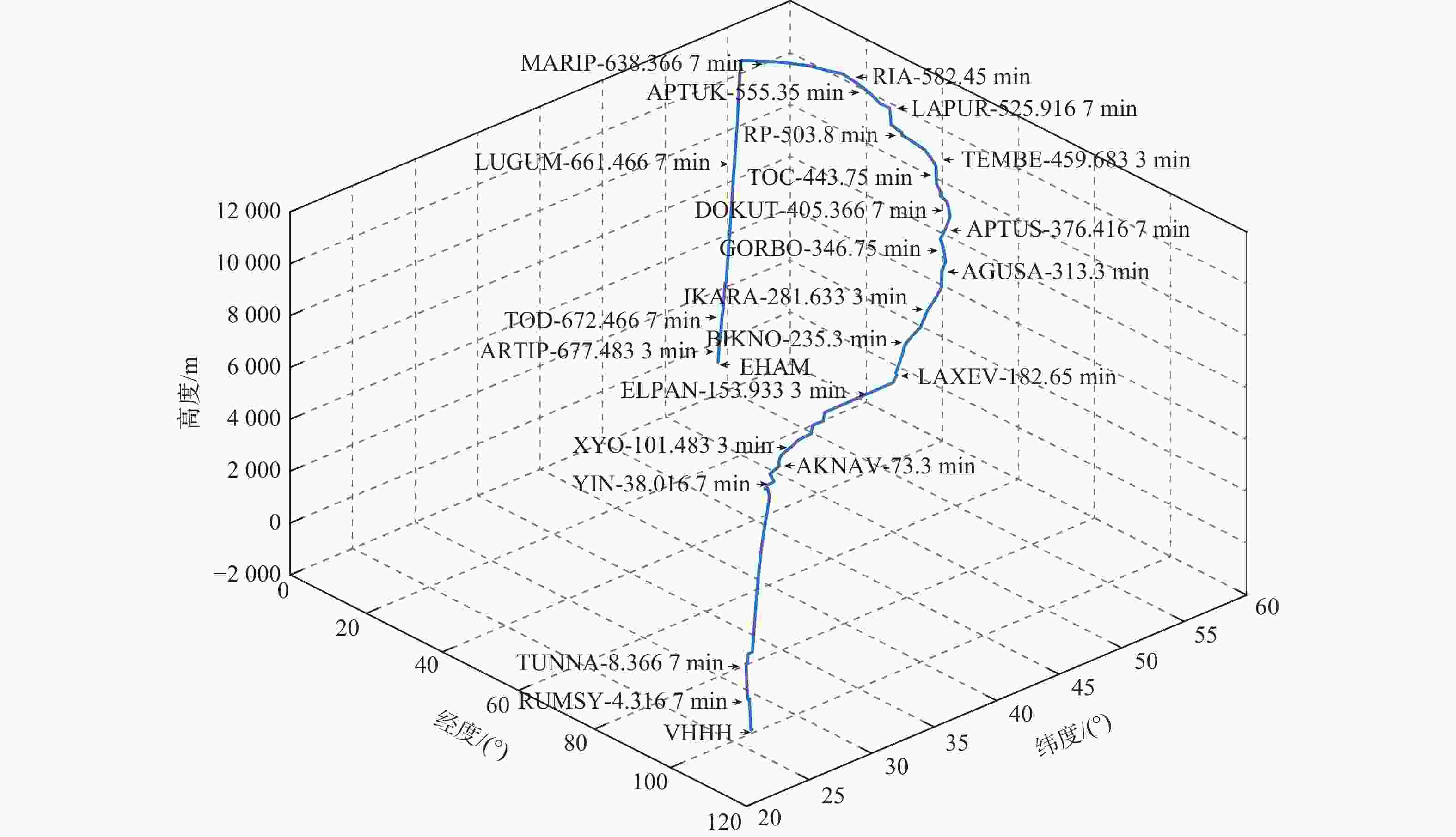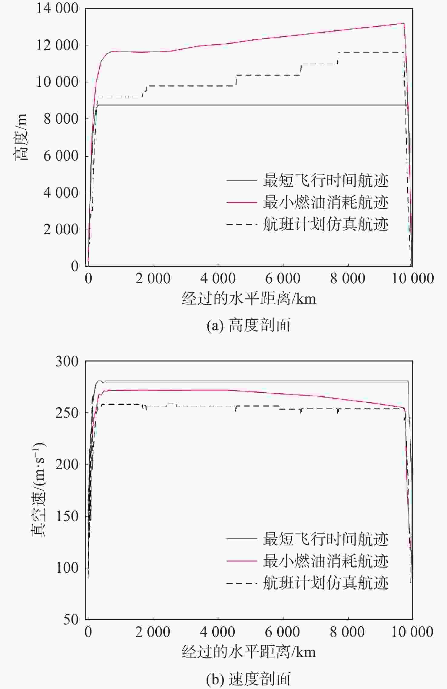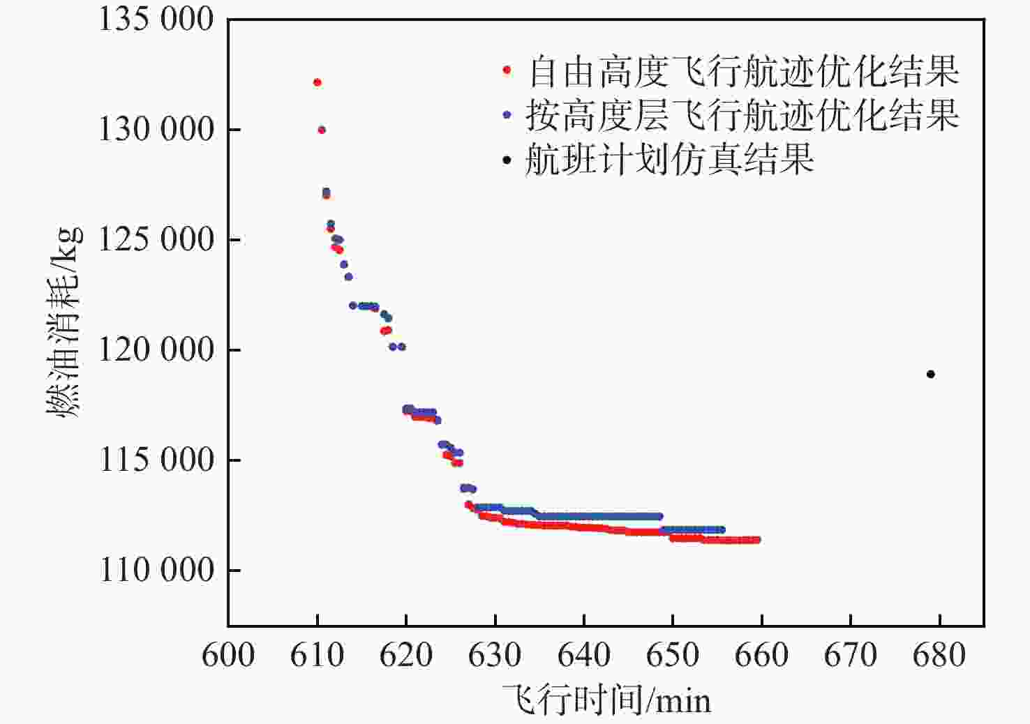 航迹 飞行时间/min 燃油消耗/kg 自由高度飞行最短飞行时间航迹 610 132 145 自由高度飞行最小燃油消耗航迹 669.5 111 396 按高度层飞行最短飞行时间航迹 611 127 197 按高度层飞行最小燃油消耗航迹 655.5 111 858 航班计划仿真航迹 679 118 920 -