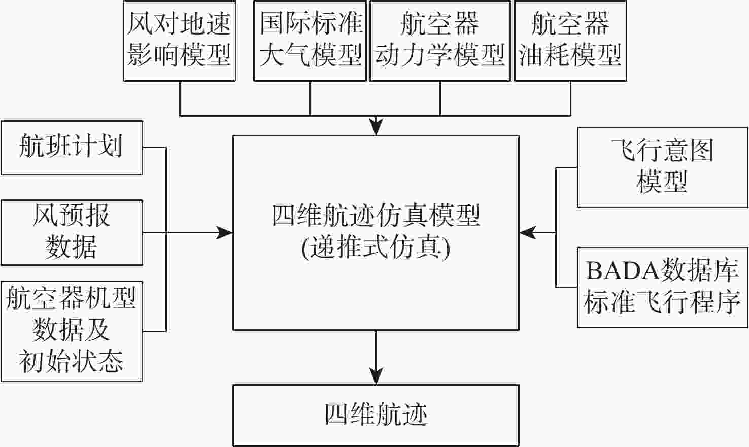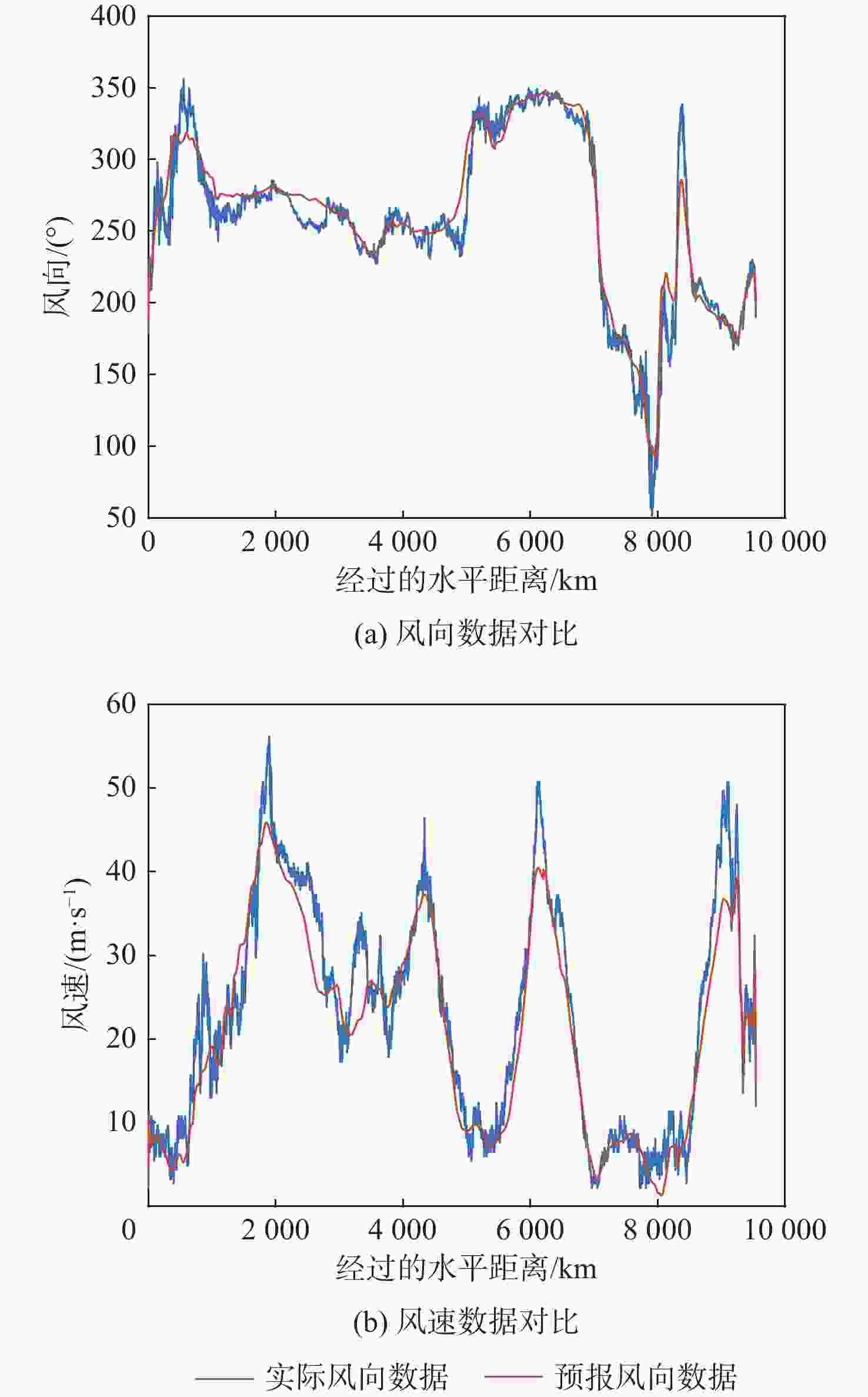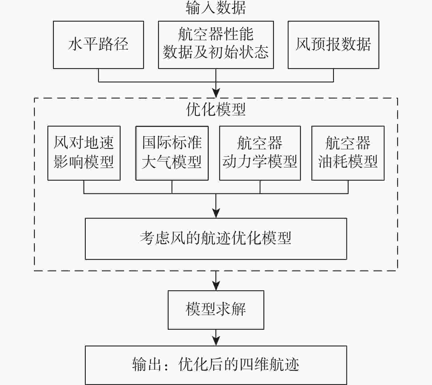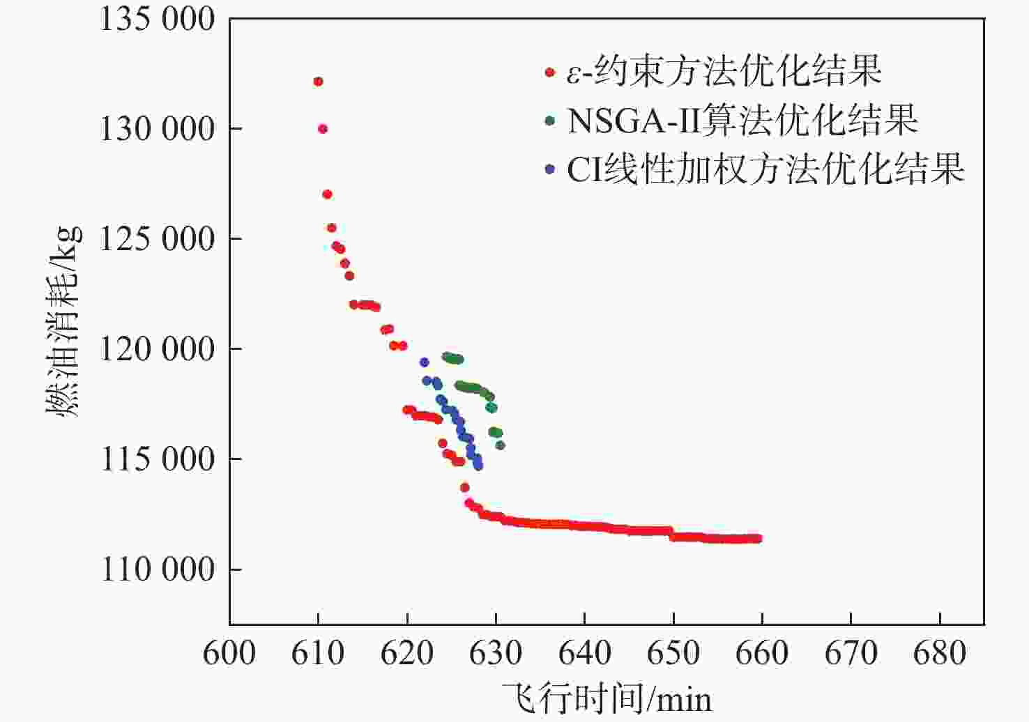 ε -约束方法的模型求解方法,并针对按高度层飞行场景下的航迹优化提出两阶段求解方法;建立了四维航迹仿真模型用于对轨迹优化效果的仿真验证;选用长航线实际飞行计划数据作为算例进行算法性能分析,并区分自由高度飞行和按高度层飞行2种场景进行航迹优化效果验证。实验结果表明:所提模型和所提方法相比其他2种常用算法能获得更优的Pareto前沿解,按高度层飞行场景下采用所提方法能获得更优的前沿解;自由高度飞行和按高度层飞行2种场景下求得的前沿解中最小燃油耗航迹分别比飞行计划仿真航迹的油耗降低了6.33%和5.94%,最短飞行时间航迹分别比飞行计划仿真航迹的飞行时间降低了10.16%和10.01%。Abstract:The constraints of the 4D trajectory optimization problem under wind influence are complex, and the multi-objective 4D trajectory optimization model is difficult to solve. To this end, the modeling and solution of the multi-objective optimization problem of the vertical profile of the trajectory under a fixed horizontal flight path considering wind influence were studied based on the optimal control method. Firstly, the optimal trajectory control model was established with the objectives of minimizing flight time and flight fuel consumption. Then, a model solution method combining trapezoidal points with $\varepsilon \text{-} {\mathrm{constraint}} $ was designed, and a two-stage solution method was proposed especially for trajectory optimization under the flight scenario by altitude layer. Then, a 4D trajectory simulation model was established to verify the effect of trajectory optimization. Finally, the actual flight plan data of the long flight route was used as an example to analyze the performance of the algorithm, and two scenarios of flight at free altitude and flight by altitude layer were used to verify the effect of trajectory optimization. The experimental results show that the proposed model and algorithm can obtain better Pareto frontier solutions than the other two commonly used algorithms, and the two-stage solution method can obtain better frontier solutions in the flight scenario by altitude layer. In the frontier solutions obtained in the scenarios of flight at free altitude and flight by altitude layer, the lowest flight fuel consumption trajectories are reduced by 6.33% and 5.94%, respectively, compared with those of the flight plan simulation trajectories. The shortest flight time trajectory is 10.16% and 10.01% lower than that of the flight plan simulation trajectory.
