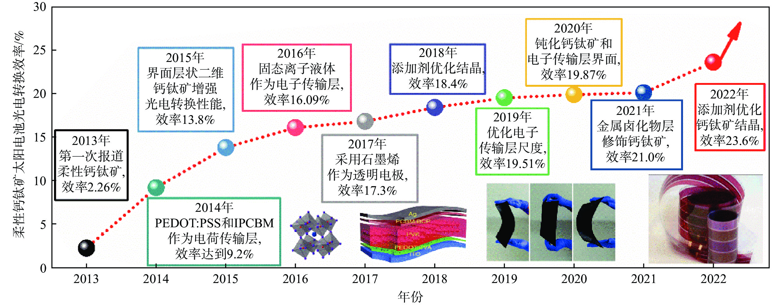 近年来,有机无机杂化钙钛矿太阳电池(PSC)凭借其优异的光电转换效率、低成本、物料使用低、可柔性加工等特性引起了广泛关注,其中,柔性钙钛矿太阳电池(F-PSC)以其灵活弯折特性、质量轻、光电转换效率高、成本低等特点成为柔性太阳电池中的热点。基于此,针对钙钛矿光伏柔性化技术发展进展,系统阐述了柔性钙钛矿太阳电池中的核心材料体系、关键工艺研究的进展与突破,重点针对器件光电转换效率偏低、耐弯折性不足、低温制备核心层、新型透明导电电极及大面积制备技术等核心技术进展和需求,推动高效稳定柔性钙钛矿光伏技术向实际应用迈进。