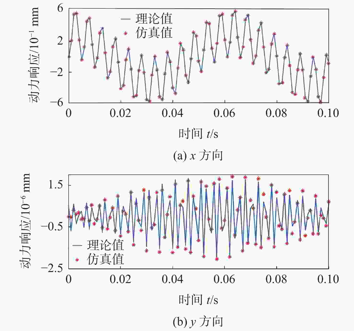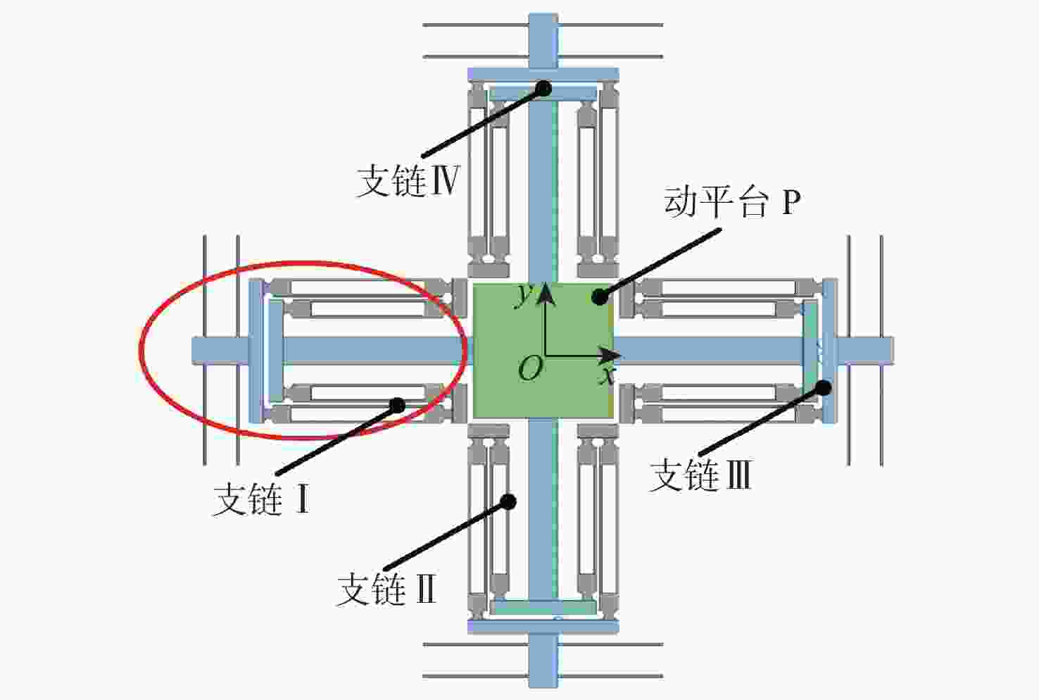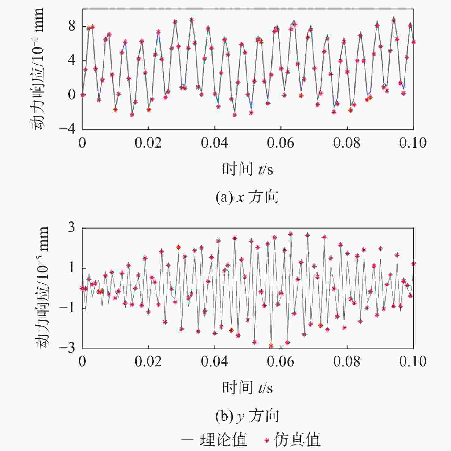 XY 柔性微定位平台并推导出其支链及平台整体的传递矩阵;基于振动理论推导了平台主要特征单元的传递矩阵;最后,为验证理论模型的有效性,分别基于传递矩阵法、有限元法(FEM)及等效质量法(EMM)开展了对该平台固有频率和瞬时动力响应的研究。结果表明:基于传递矩阵法程式化地构建传递矩阵即可分析平台动力学特性,无须建立烦琐的动力学方程;相较于等效质量法,传递矩阵法可计算平台的高阶固有频率;平台固有频率理论值同仿真值最大相对误差仅为2.4%,动力响应理论值与仿真值基本吻合,证明了基于传递矩阵法所建模型的有效性。Abstract:With the development of precision micro-positioning technology, the research on dynamic characteristics of flexible micro-positioning platforms is necessary. As an effective method to analyze the dynamics of multi-body systems, the transfer matrix method (TMM) has the advantages of convenient modeling and high calculation accuracy. Therefore, a dynamics model of the micro-positioning platform was established based on TMM to analyze its dynamic characteristics. The basic idea of TMM was introduced, and the transfer equation of flexible mechanism was established. Its instantaneous dynamic response under arbitrary excitation was deduced. An