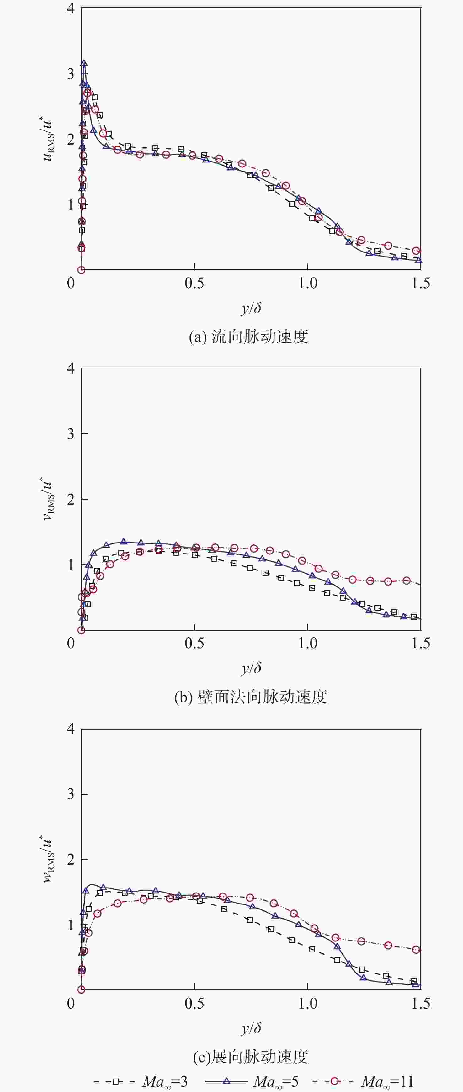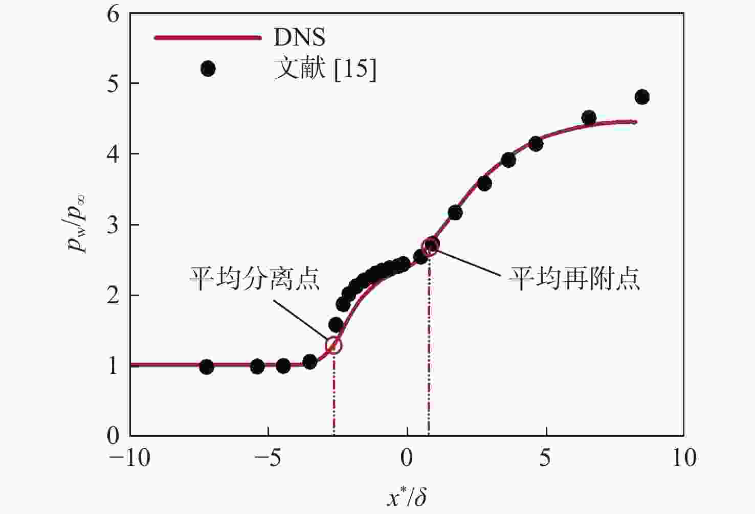 变量 实验测量值 DNS计算结果 Maδ 2.9 2.9 Reθ 2400 2450 δ/mm 6.7 6.7 δ*/mm 2.36 2.6 θ/mm 0.43 0.48 H=δ*/θ 5.49 5.41 Cf 2.17×103 2.20×103 uτ 32.9 30 表 2 不同DNS算例的计算域和网格尺寸