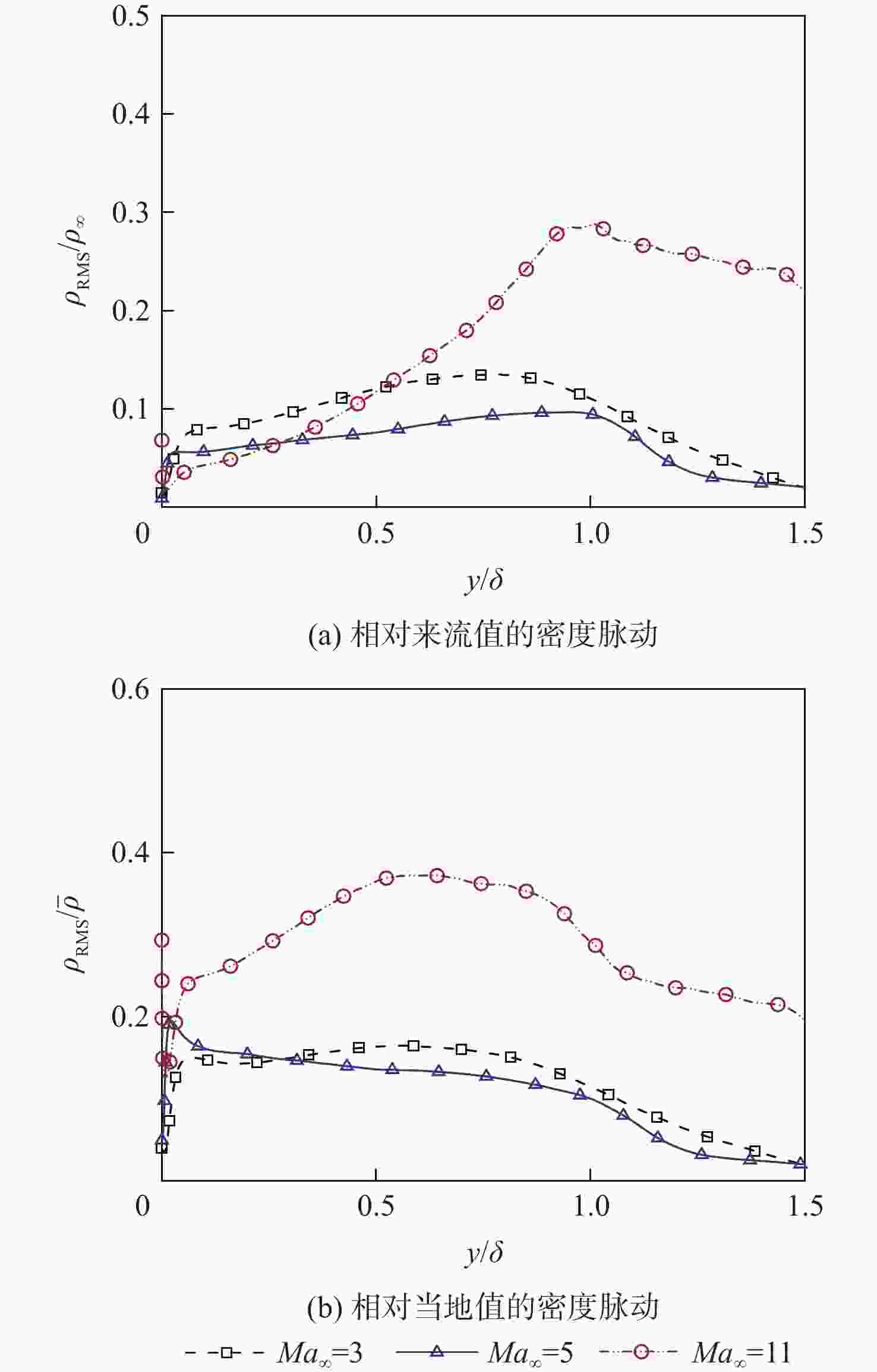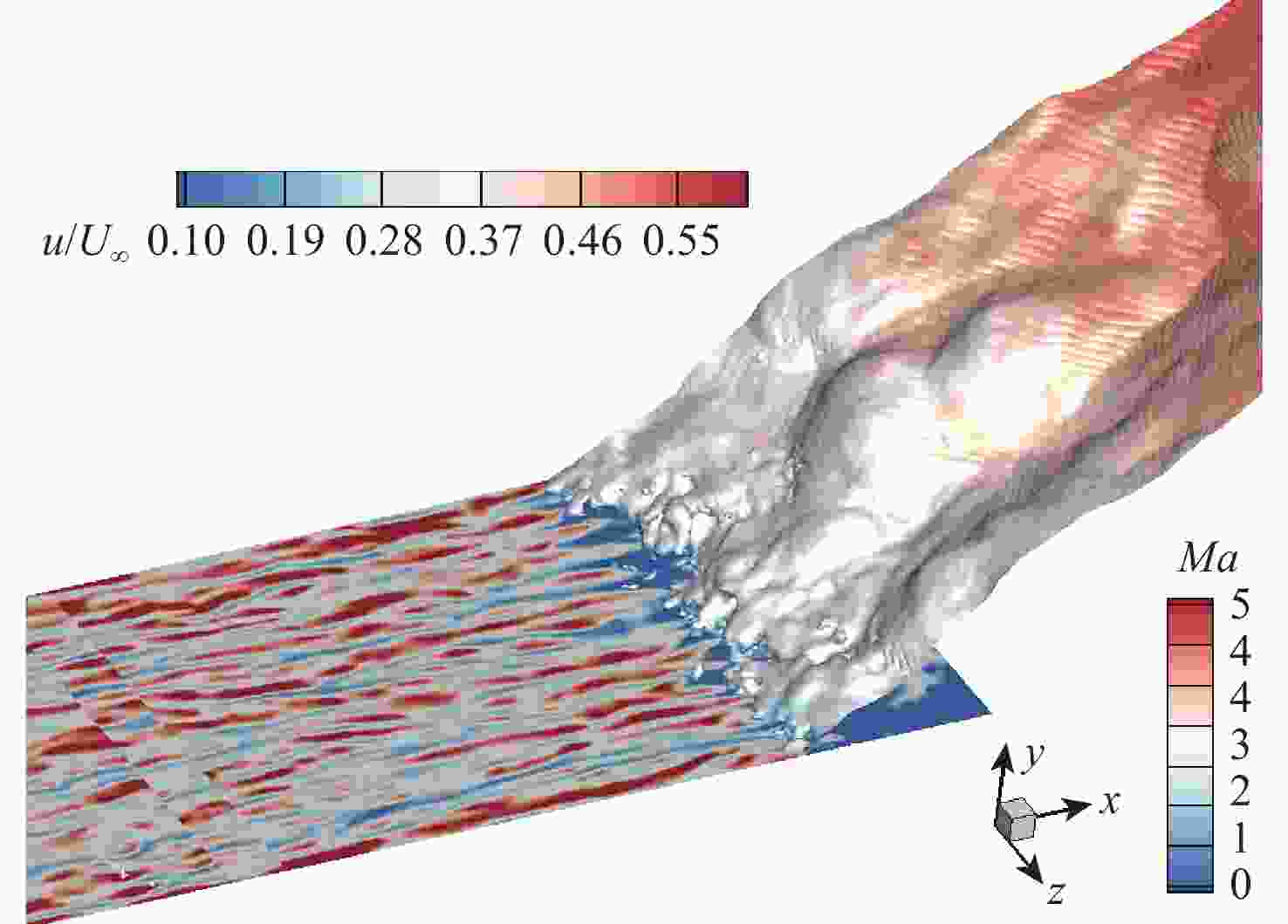 激波与湍流边界层相互干扰(SWTBLI)现象可诱导形成复杂的流场结构和气动力热分布特性,其干扰机制和影响机理至今仍未被充分掌握。为分析超/高超声速SWTBLI流动的机理,开展了来流马赫数为3、5、11条件下压缩拐角流动的直接数值模拟(DNS)研究。结果显示,SWTBLI使干扰区内的速度、压强等物理量的脉动显著增强,且增强幅值随来流马赫数升高而增大;同时,上游边界层中的温度、压强等物理量的脉动也随来流马赫数的增大而增强。在SWTBLI作用下,流动的可压缩效应明显增强,干扰区内压力膨胀项和膨胀耗散项不再可忽略。在高超声速条件下,上游边界层中的压力膨胀项和膨胀耗散项也比较重要。此外,SWTBLI诱导的壁面压强平均值和脉动均方根值的分布存在共性。在所有来流马赫数下,干扰区内的壁面压强脉动相比上游边界层均显著增强,并形成明显的峰值。流动发生显著分离时,将分别形成位于平均分离点和再附点附近的壁面压强脉动峰值。
