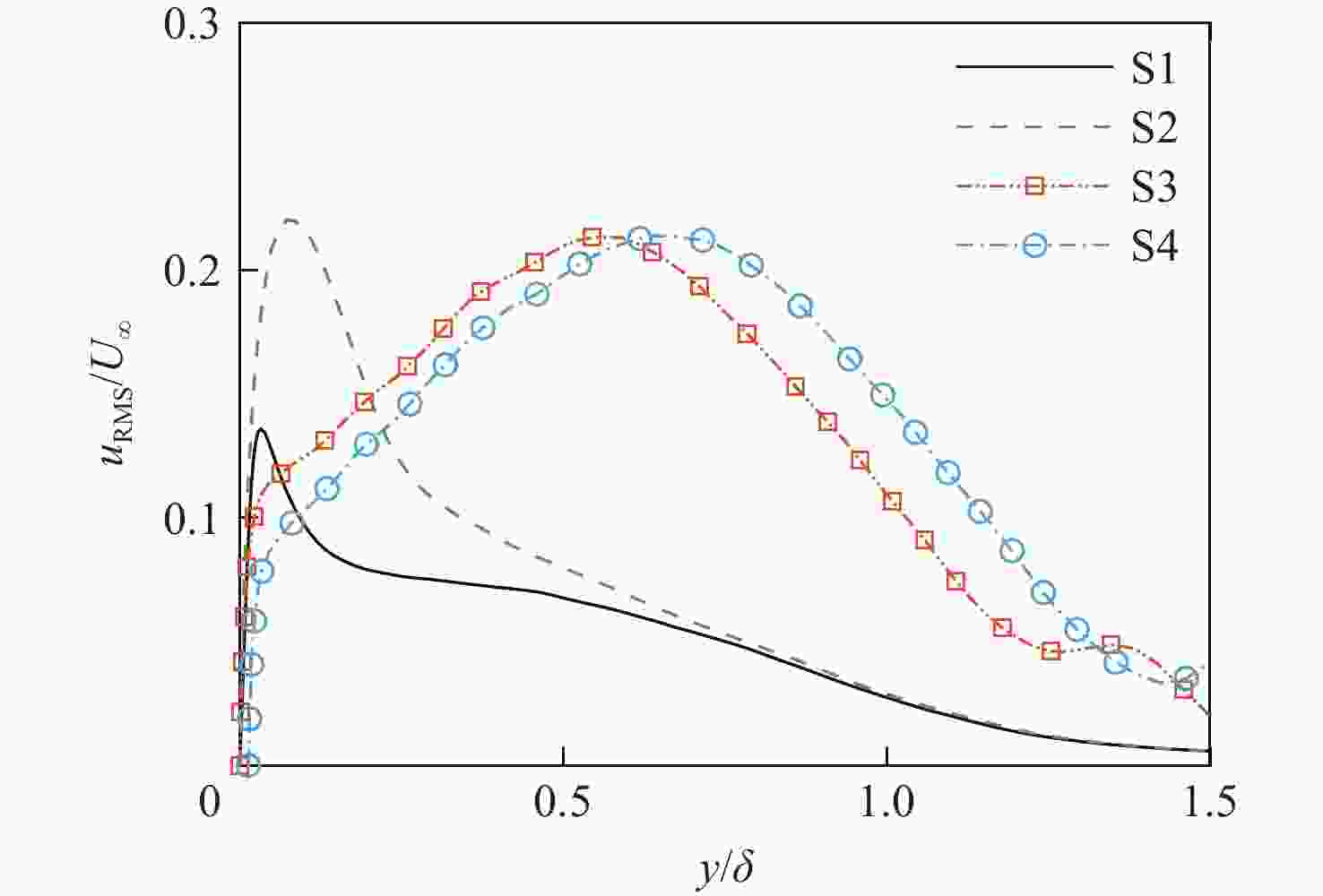 域长度Δx+ Δz+ Δy1 + 3 27δ 6δ 2δ 5~7 6 0.3 5 12δ 3δ 2δ 5~10 8 0.15 11 40δ 4δ 2δ 5~10 8 0.3 表 3 不同算例平均分离区长度和平均分离点、平均再附点位置