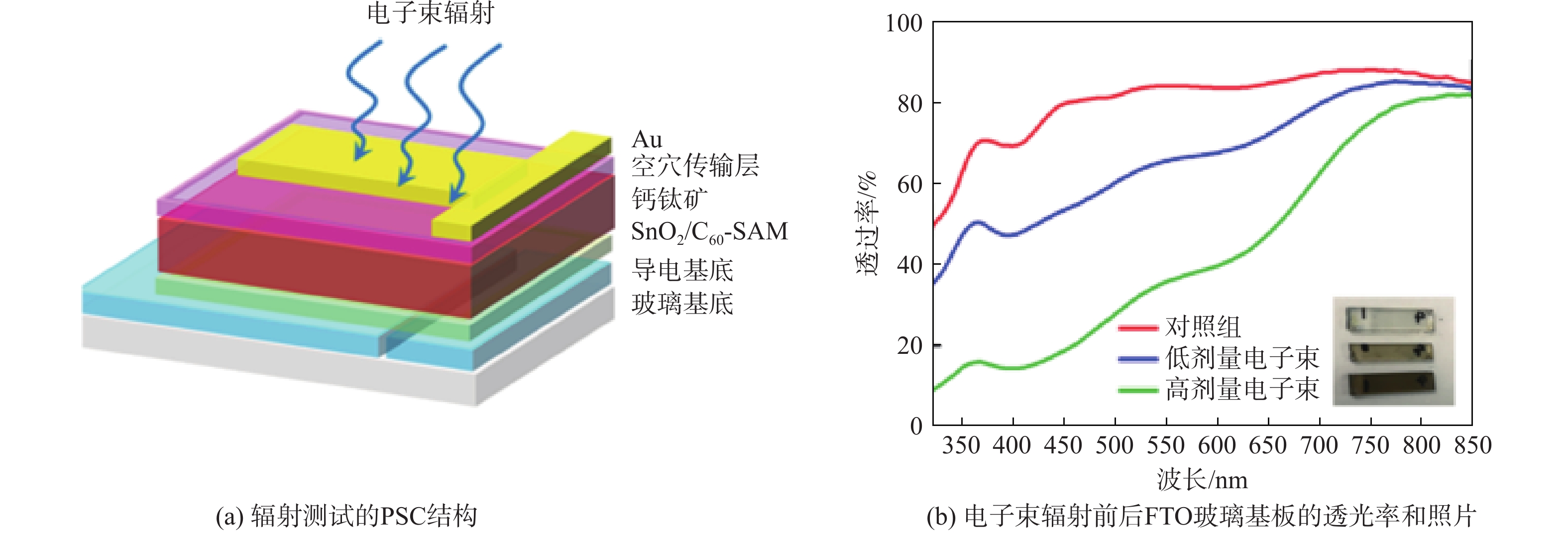 图 21  辐射测试的PSC结构及电子束辐射前后FTO玻璃基板的透光率和照片[68]