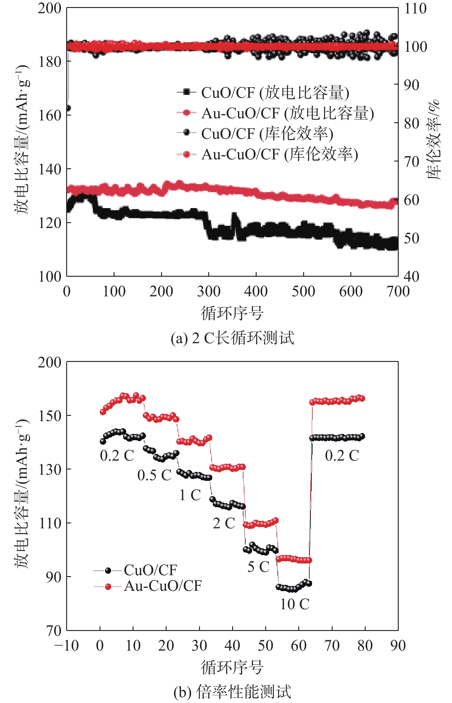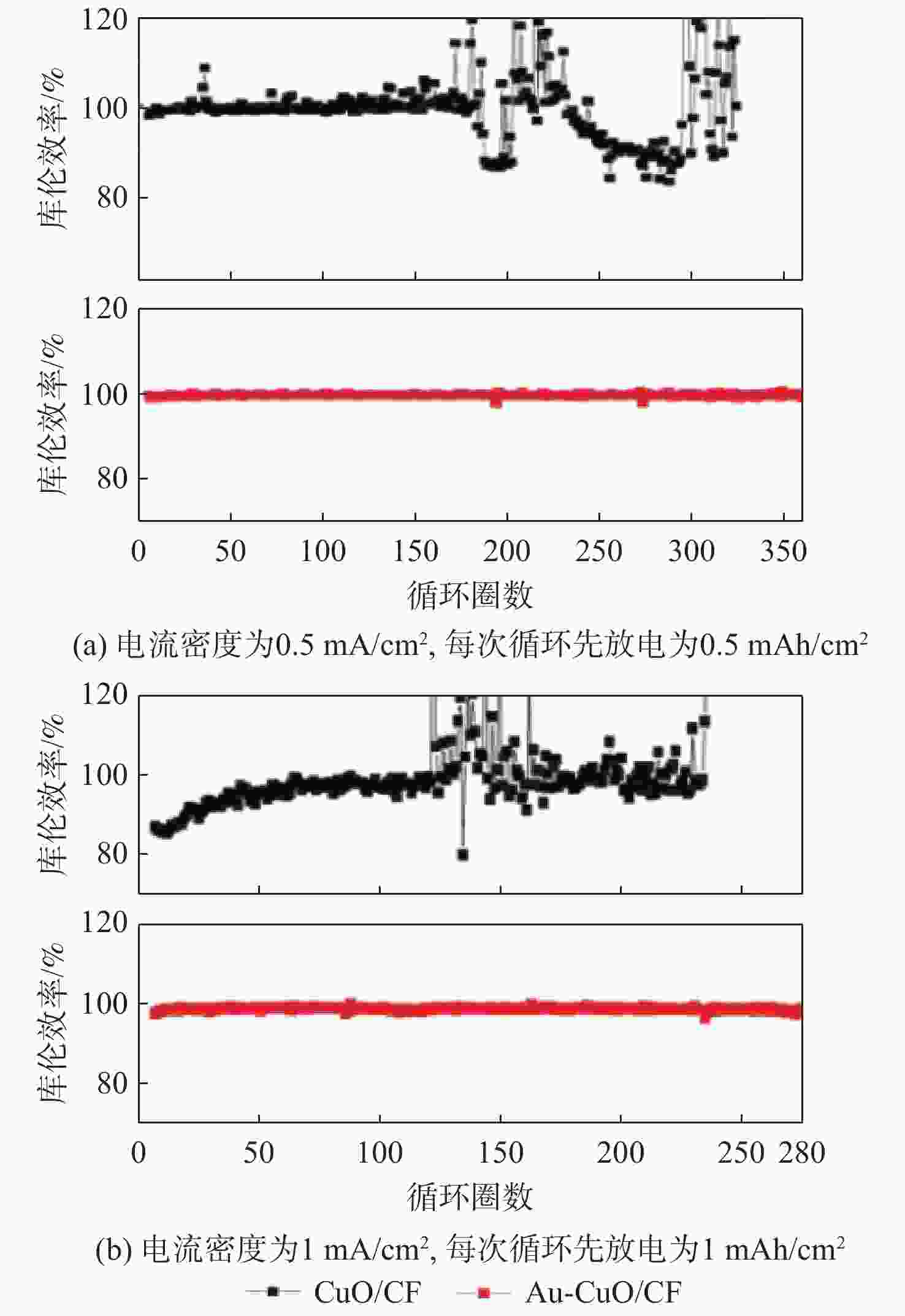 Abstract:With the growing strategic position of near-space vehicles, the demand for energy storage batteries with high power, high specific energy, and long cycle life has also increased. Lithium metal battery with ultra-high theoretical specific energy is a promising candidate for the next-generation energy storage system of near-space vehicles. Lithium metal exhibits extremely low reduction potential and high theoretical capacity, but its application is limited by issues associated with dendrite growth. In this paper, based on oxidation etching and ion exchange mechanism, a three-dimensional (3D) Au-CuO nanowire array current collector on copper foam (CF) (Au-CuO/CF nanoarray 3D current collector) was successfully prepared via the preparation of CuO nanowire array on CF and the introduction of Au as lithophilic sites. This current collector was then applied as a lithium metal battery anode. Compared to the CuO/CF nanoarray 3D current collector, the Au-CuO/CF nanoarray 3D current collector demonstrated significantly improved Coulombic efficiency, cycle life, and cycling stability. When paired with a lithium iron phosphate (LFP) cathode, the full cell achieved a capacity retention of 97.7% after 700 cycles. The Au-CuO/CF nanoarray 3D current collector features simple preparation and excellent electrochemical performance, with the full cell demonstrating outstanding cycling stability and exceptional capacity retention, showing great potential as a next-generation high-energy-density lithium metal battery anode current collector.