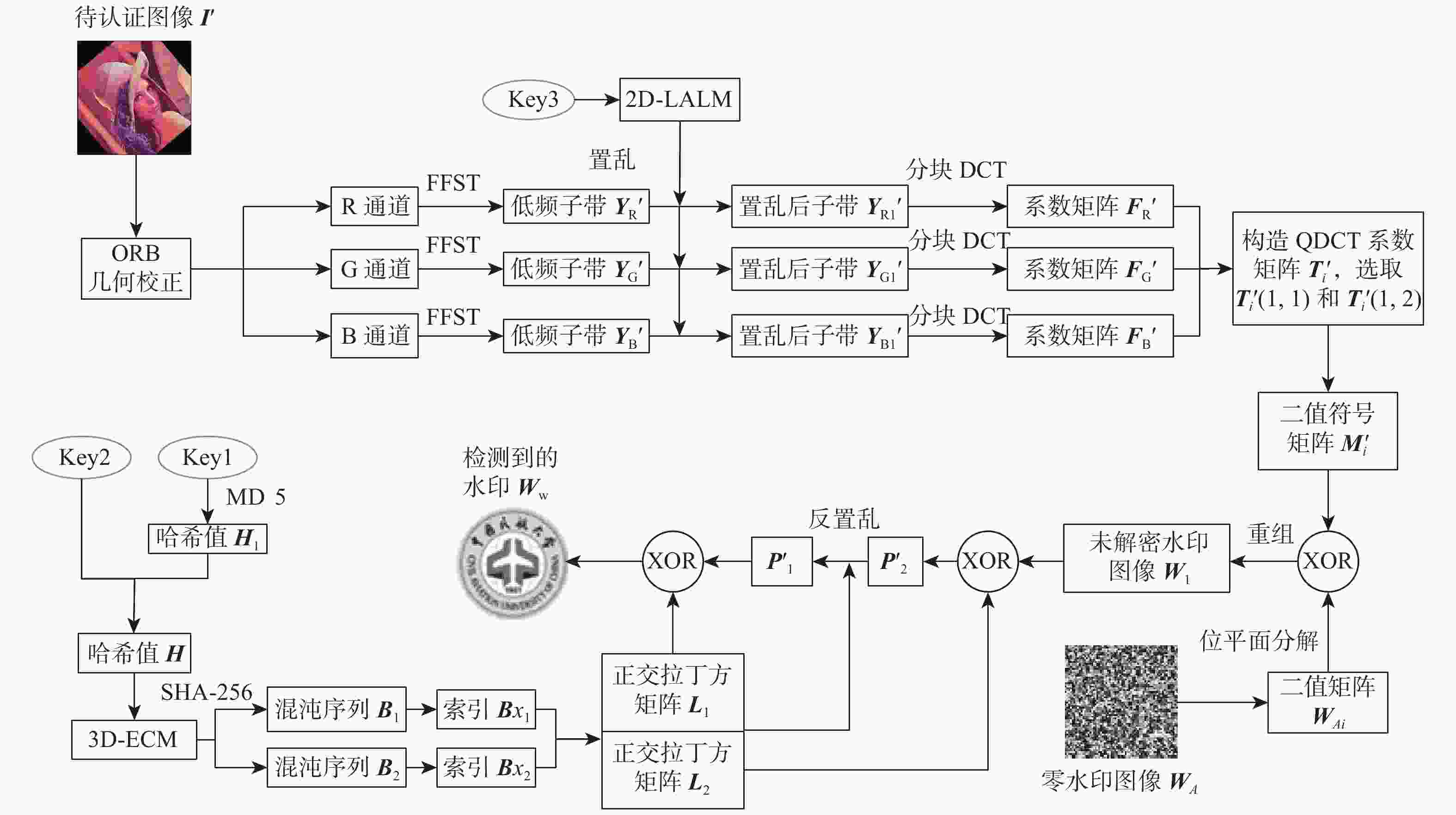 Abstract:In view of the small watermark embedding capacity and poor robustness against geometric attacks in most of the existing zero-watermarking schemes for color images, a robust zero-watermarking algorithm with a large capacity based on combined transform domain and bit-plane decomposition was proposed. Firstly, the R, G, and B channels of a color carrier image were respectively subjected to fast finite shearlet transform (FFST), and each low-frequency sub-band after FFST was processed by non-overlapping blocking and scrambling. The block discrete cosine transform (DCT) coefficients of each sub-band after the scrambling were used to construct the quaternion discrete cosine transform (QDCT) coefficient matrices, and then two low-frequency coefficients were selected from each QDCT coefficient matrix. Eight binary robust feature matrices were constructed according to the sign polarities of the real parts and the imaginary parts from the above two coefficients. Finally, the gray-level watermark image scrambled and encrypted by the orthogonal Latin squares matrices was decomposed by bits. The eight binary bit-planes after decomposition were used for XOR operation with the above binary robust feature matrices and recombined to obtain the final gray-level authentication zero-watermark. In addition, before the watermark detection, the image to be authenticated was geometrically corrected by the oriented FAST and rotated BRIEF (ORB) algorithm. The experimental results show that the proposed algorithm has high watermark embedding capacity and security, and it is highly robust to both conventional geometric and non-geometric attacks.
