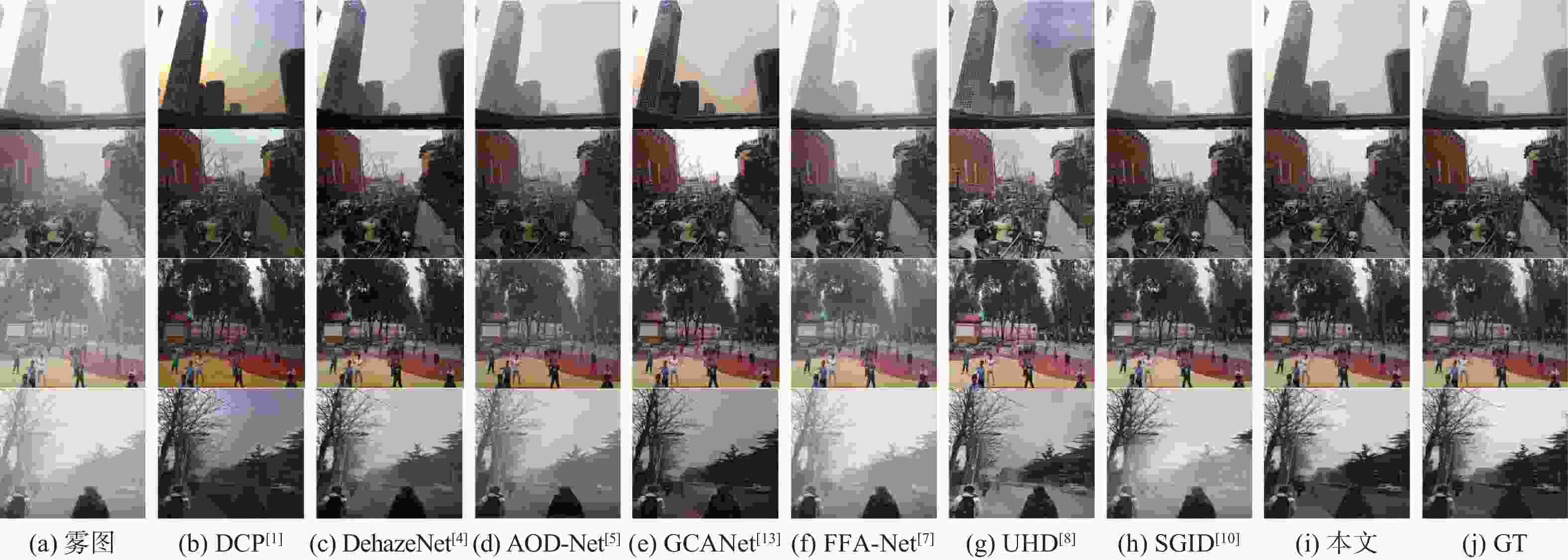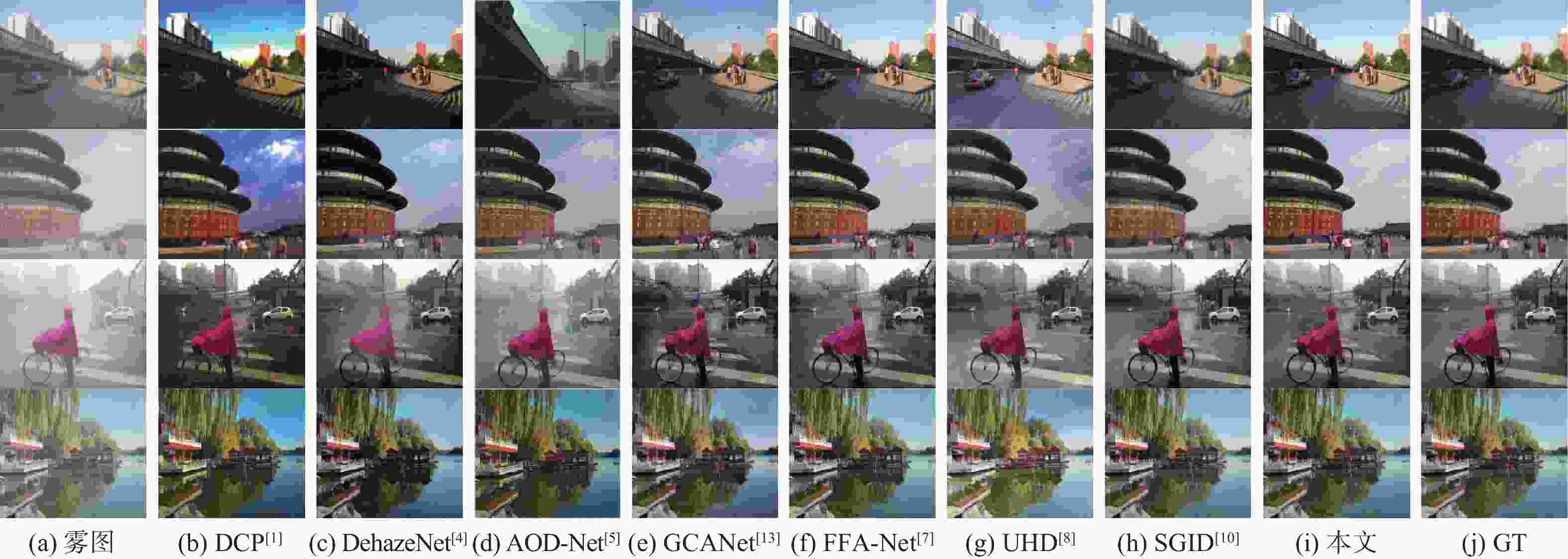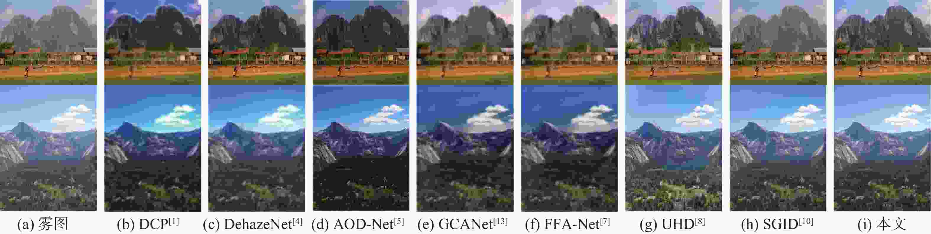 算法 PSNR/dB SSIM SOTS室内 Haze4K SOTS室外 SOTS室内 Haze4K SOTS室外 DCP[1] 16.52 14.21 19.03 0.8186 0.7246 0.8216 DehazeNet[4] 20.13 19.24 22.16 0.8457 0.8428 0.8233 AOD-Net[5] 19.08 17.18 19.15 0.8503 0.8349 0.8458 GCANet[13] 30.20 23.57 30.14 0.9806 0.9492 0.9521 FFA-Net[7] 33.29 24.97 30.79 0.9764 0.9514 0.9342 UHD[8] 21.59 13.28 25.80 0.8679 0.7457 0.9639 SGID[10] 33.45 21.25 29.98 0.9856 0.9291 0.9780 本文 34.14 25.53 31.29 0.9830 0.9624 0.9808 表 2 平均运行时间对比