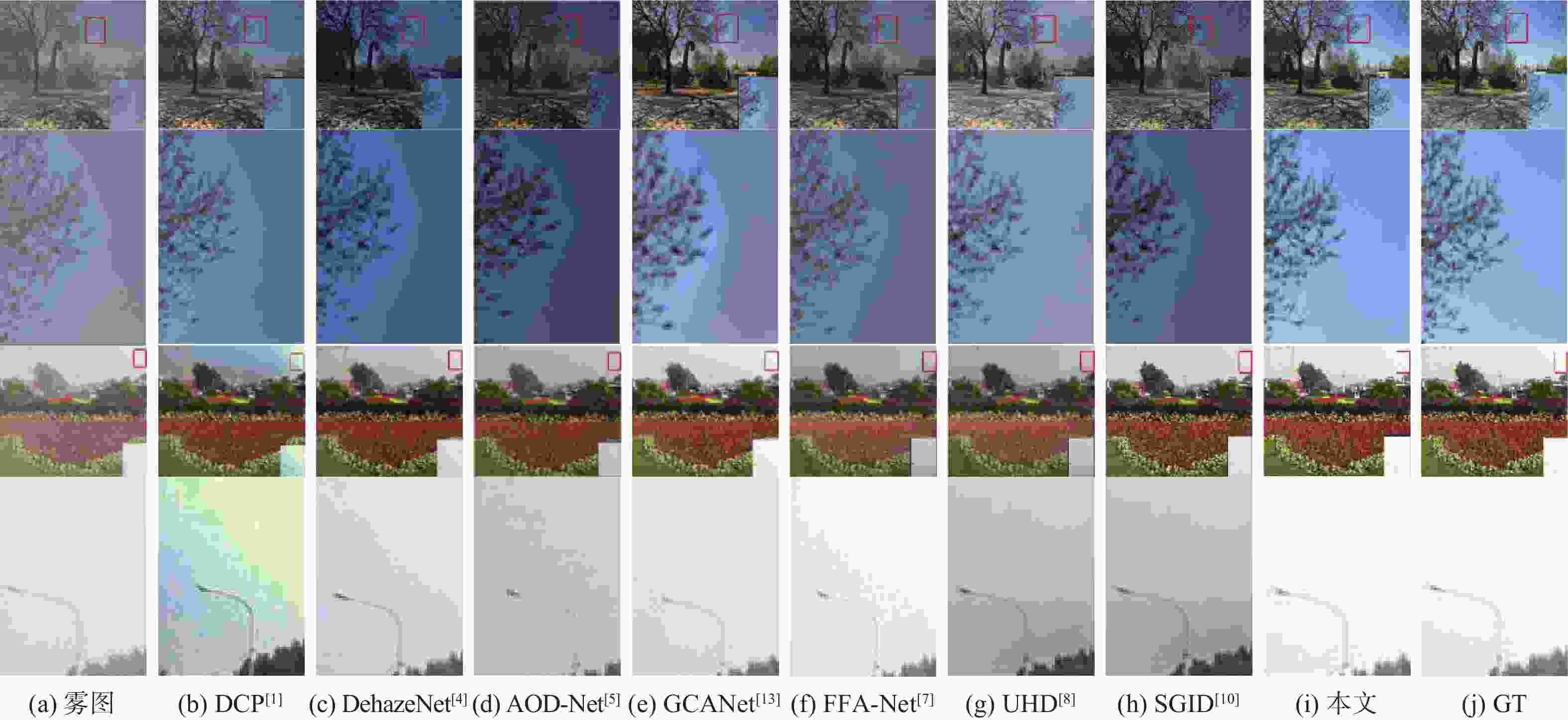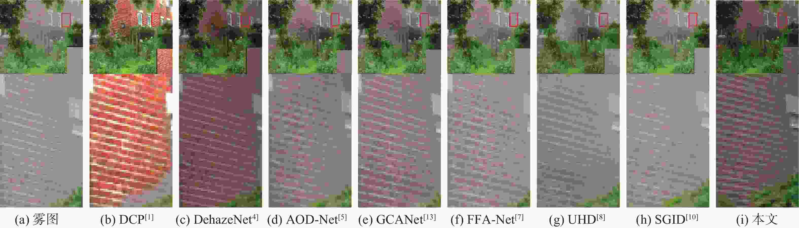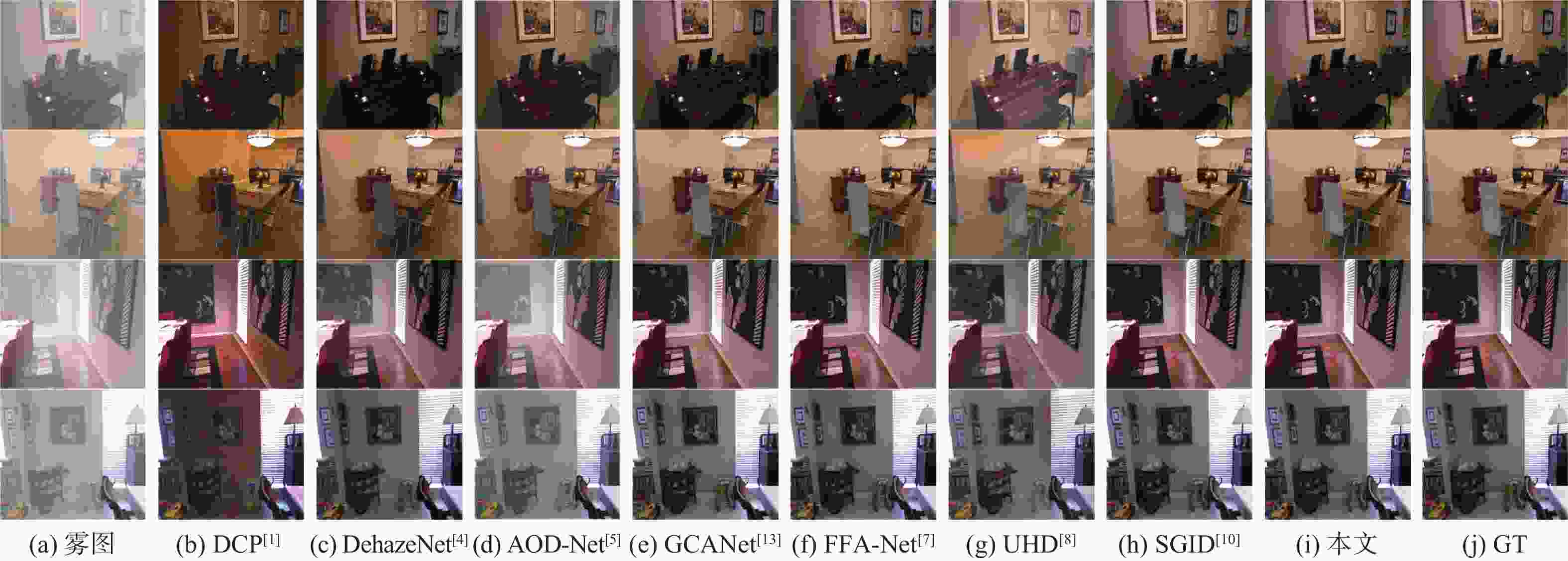 算法 PSNR/dB SSIM SOTS室内 Haze4K SOTS室外 SOTS室内 Haze4K SOTS室外 DCP[1] 16.52 14.21 19.03 0.8186 0.7246 0.8216 DehazeNet[4] 20.13 19.24 22.16 0.8457 0.8428 0.8233 AOD-Net[5] 19.08 17.18 19.15 0.8503 0.8349 0.8458 GCANet[13] 30.20 23.57 30.14 0.9806 0.9492 0.9521 FFA-Net[7] 33.29 24.97 30.79 0.9764 0.9514 0.9342 UHD[8] 21.59 13.28 25.80 0.8679 0.7457 0.9639 SGID[10] 33.45 21.25 29.98 0.9856 0.9291 0.9780 本文 34.14 25.53 31.29 0.9830 0.9624 0.9808 表 2 平均运行时间对比