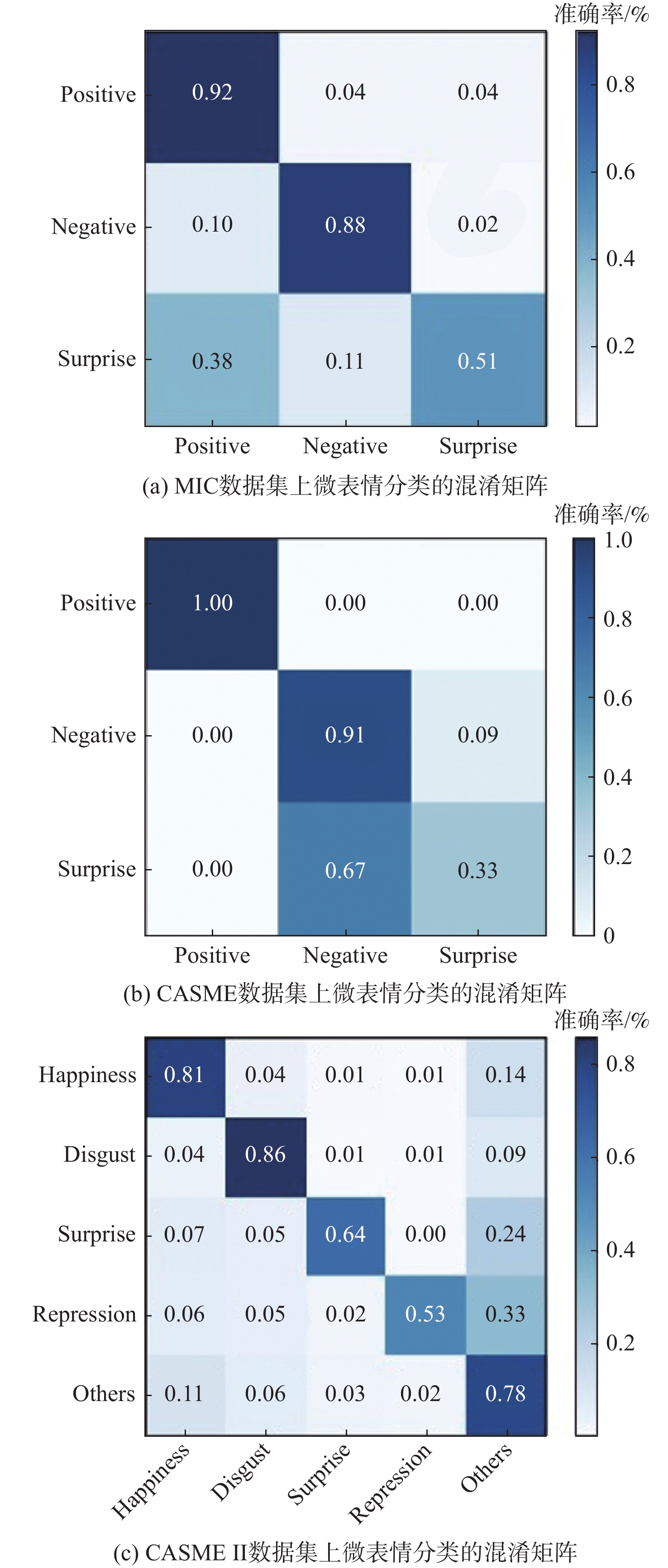 准确率/%MSMMT[37] 78.30 71.31 AMAN[38] 79.87 75.40 KTGSL[39] 72.58 75.64 Later[40] 73.17 70.68 SLSTT-Mean[41] 73.17 73.79 STLBP-IIP[42] 60.37 62.75 DISTLBP-IIP[42] 63.41 64.78 3D-CNNs (with transfer learning)[43] 66.30 65.90 DSSN[44] 63.40 70.78 SSSN[44] 63.41 71.19 AKMNet[35] 72.56 67.06 TSCNN-I[26] 72.74 74.05 KFC-MER[21] 65.85 72.76 FR[17] 57.90 62.85 Knowledge Distillation[45] 76.06 72.61 本文 81.19 74.53 表 3 CASME、CASME II和SMIC数据集上的消融实验