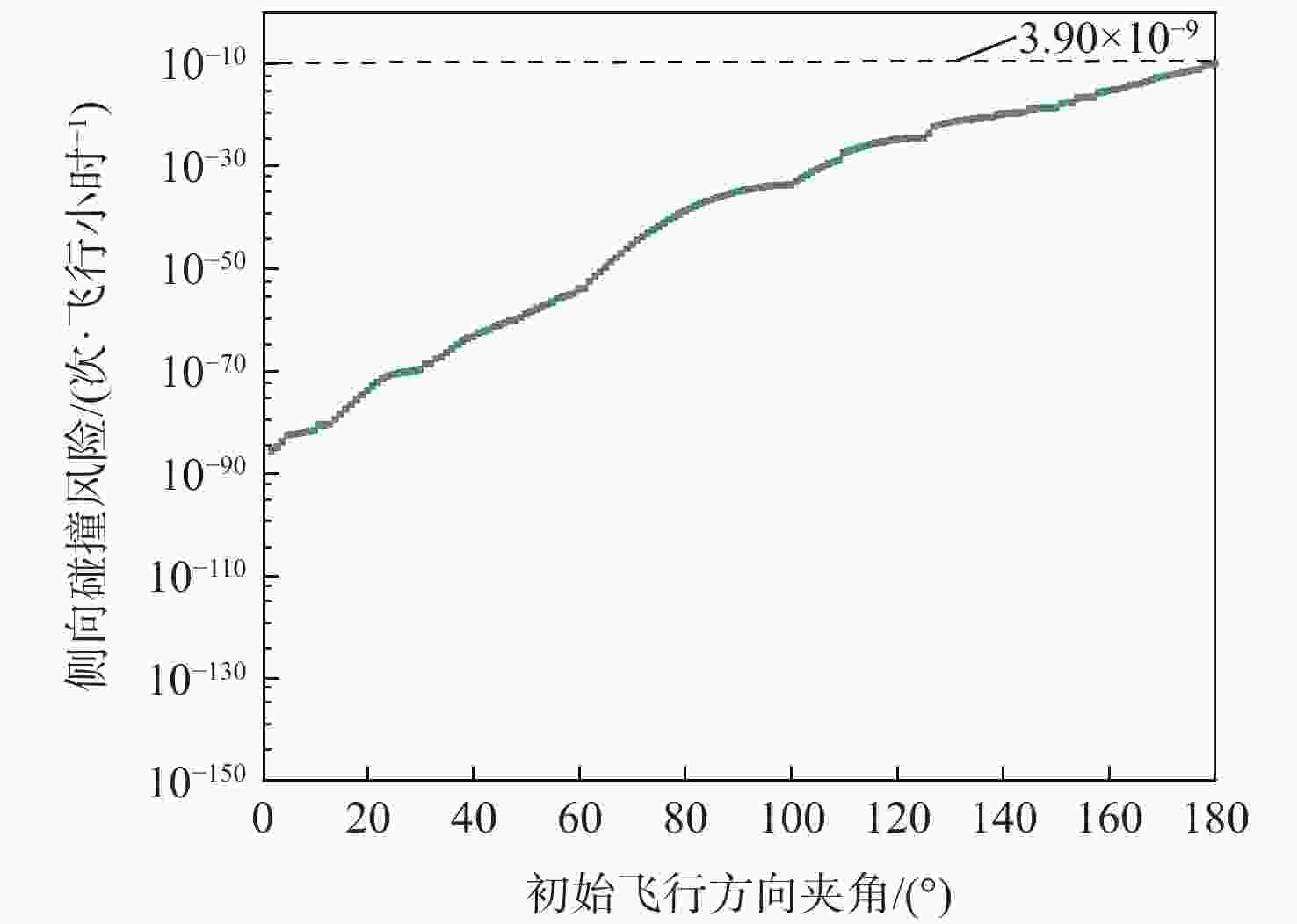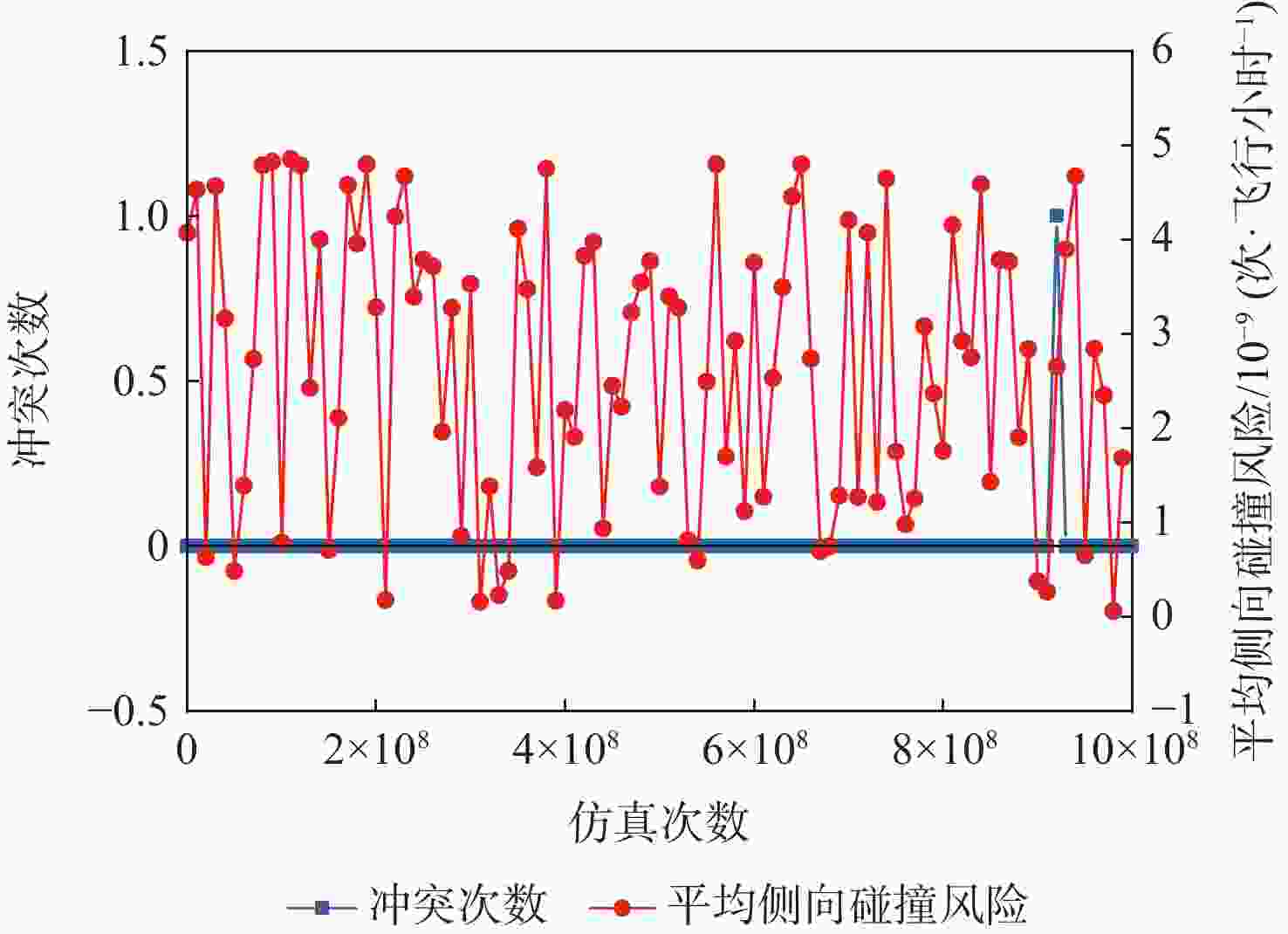 航空器 $ {\lambda _x} $/m $ {\lambda _y} $/m $ {\lambda _{\textit{z}}} $/m $ v $/(m·s−1) $ \beta $/(°) $ {\sigma _{{\mathrm{cns}}}} $ $ {\sigma _{\rm{w}}} $ $ {\mu _{\rm{w}}} $ $ {N_{\mathrm{p}}} $ A380 72.8 79.8 24.1 251 20 64.5 10.8 60.3 16 B737-800 39.5 35.8 12.5 230 20 64.5 11.5 60.3 16 表 2 6个等级航空器间侧向安全间隔标准