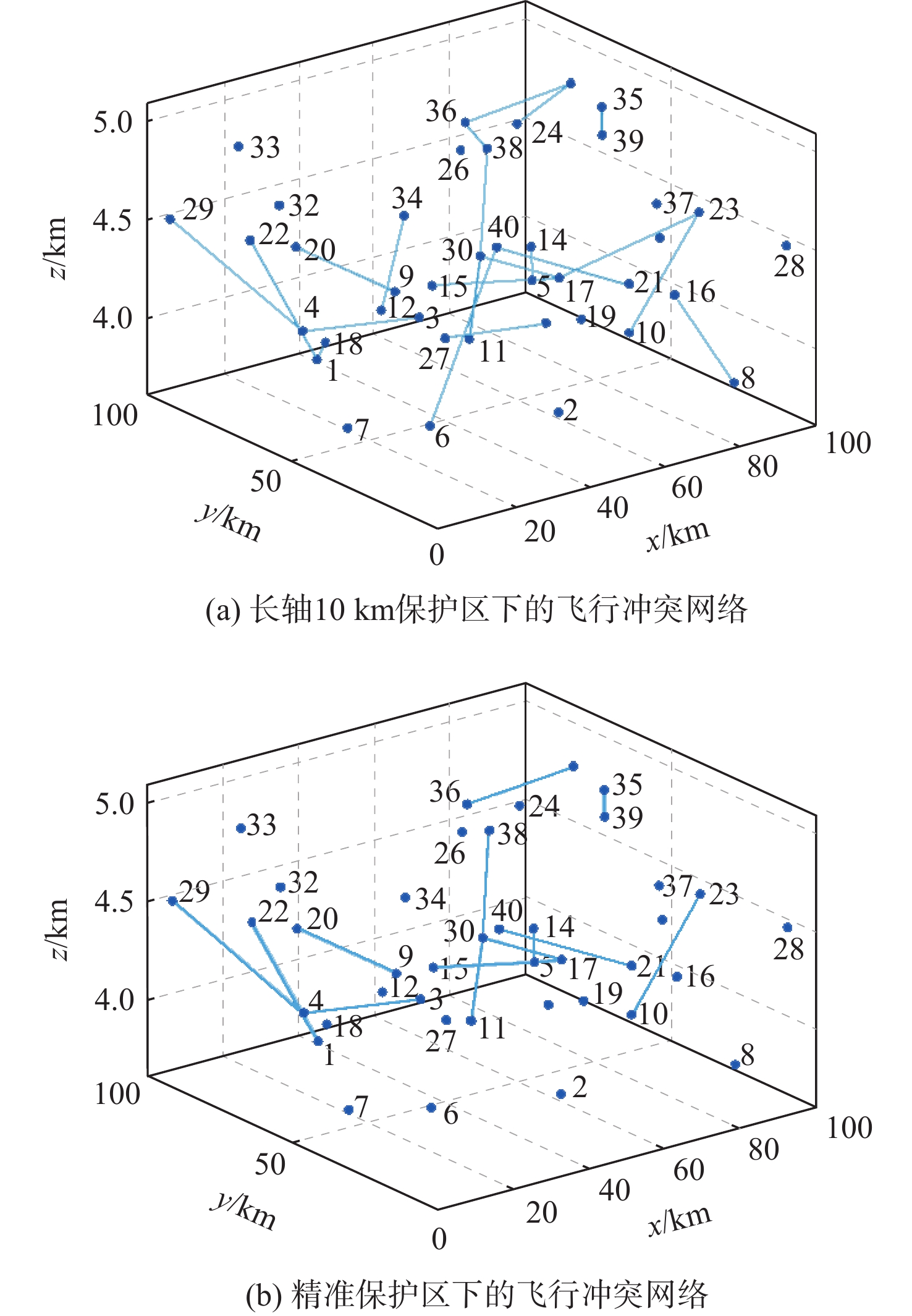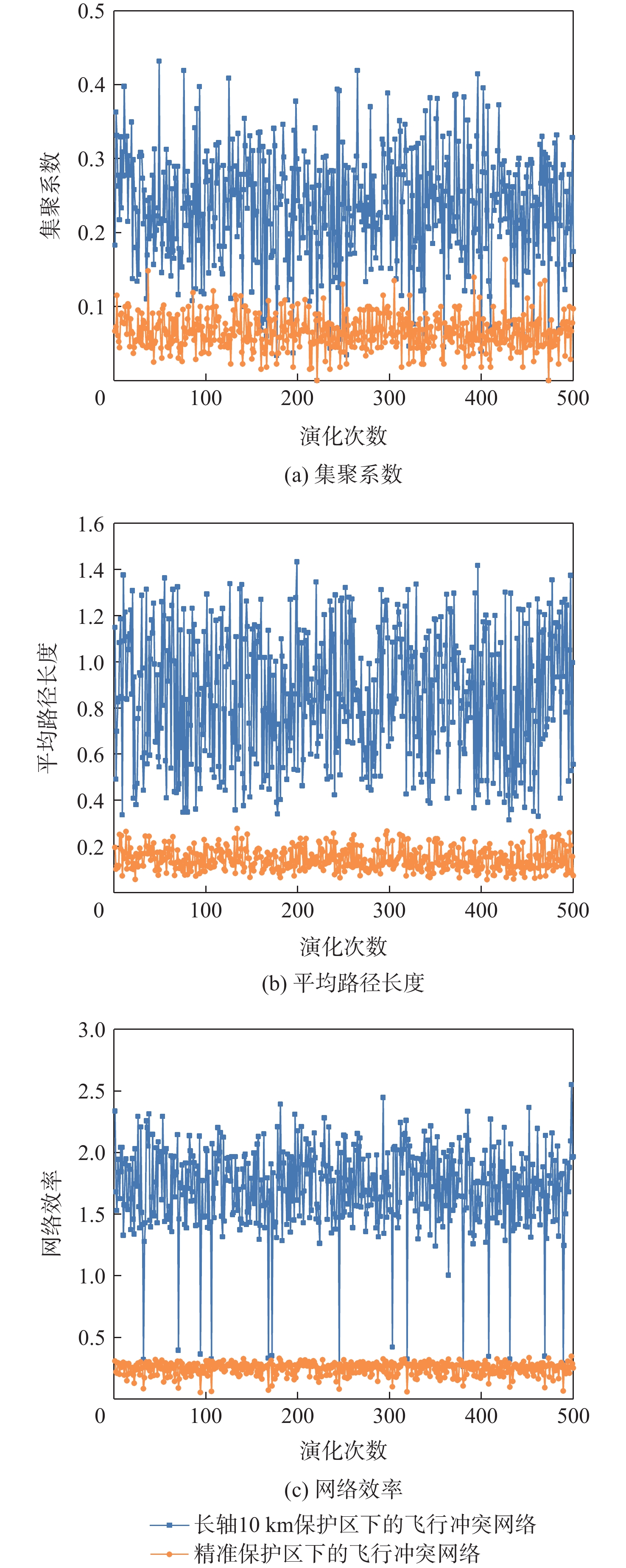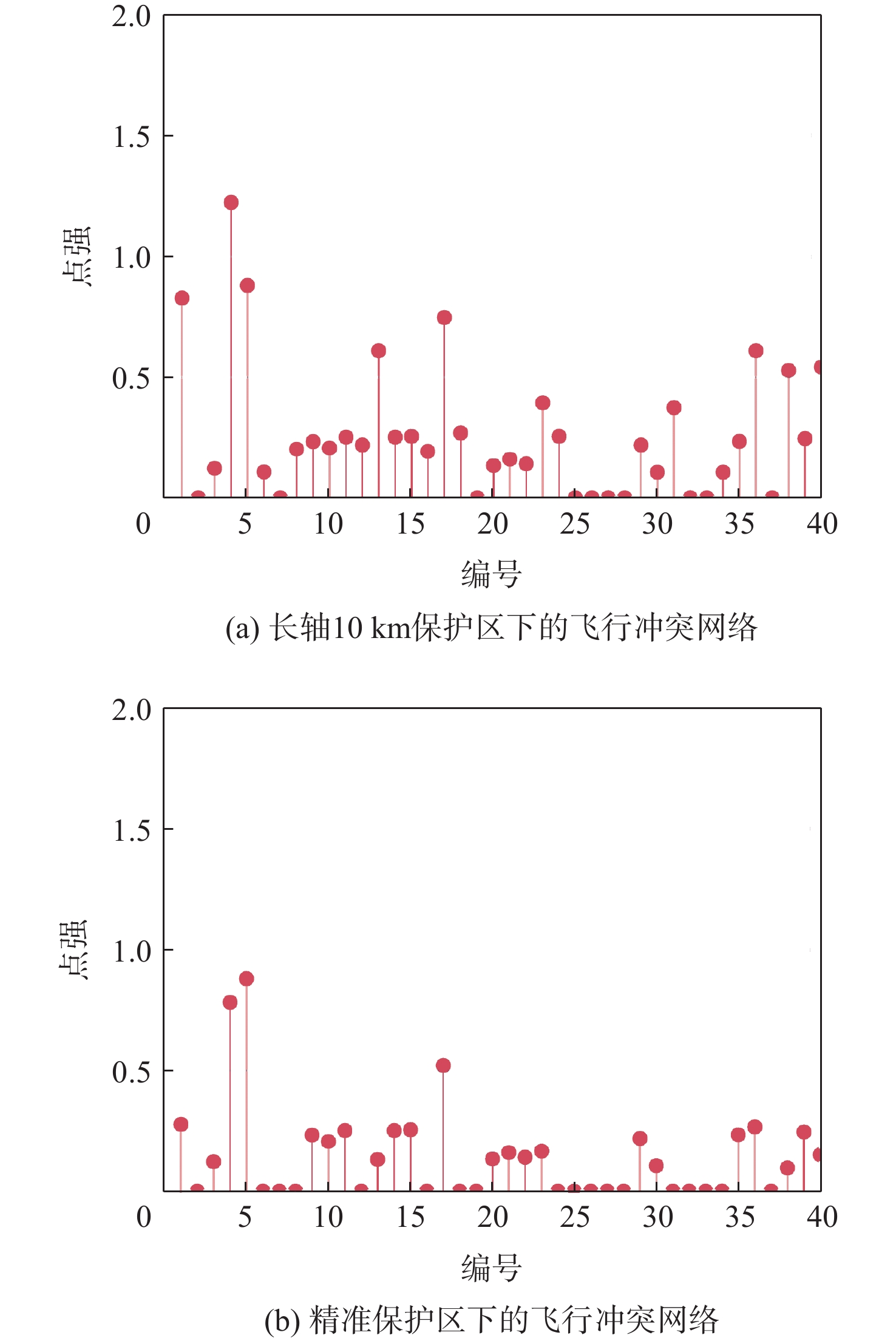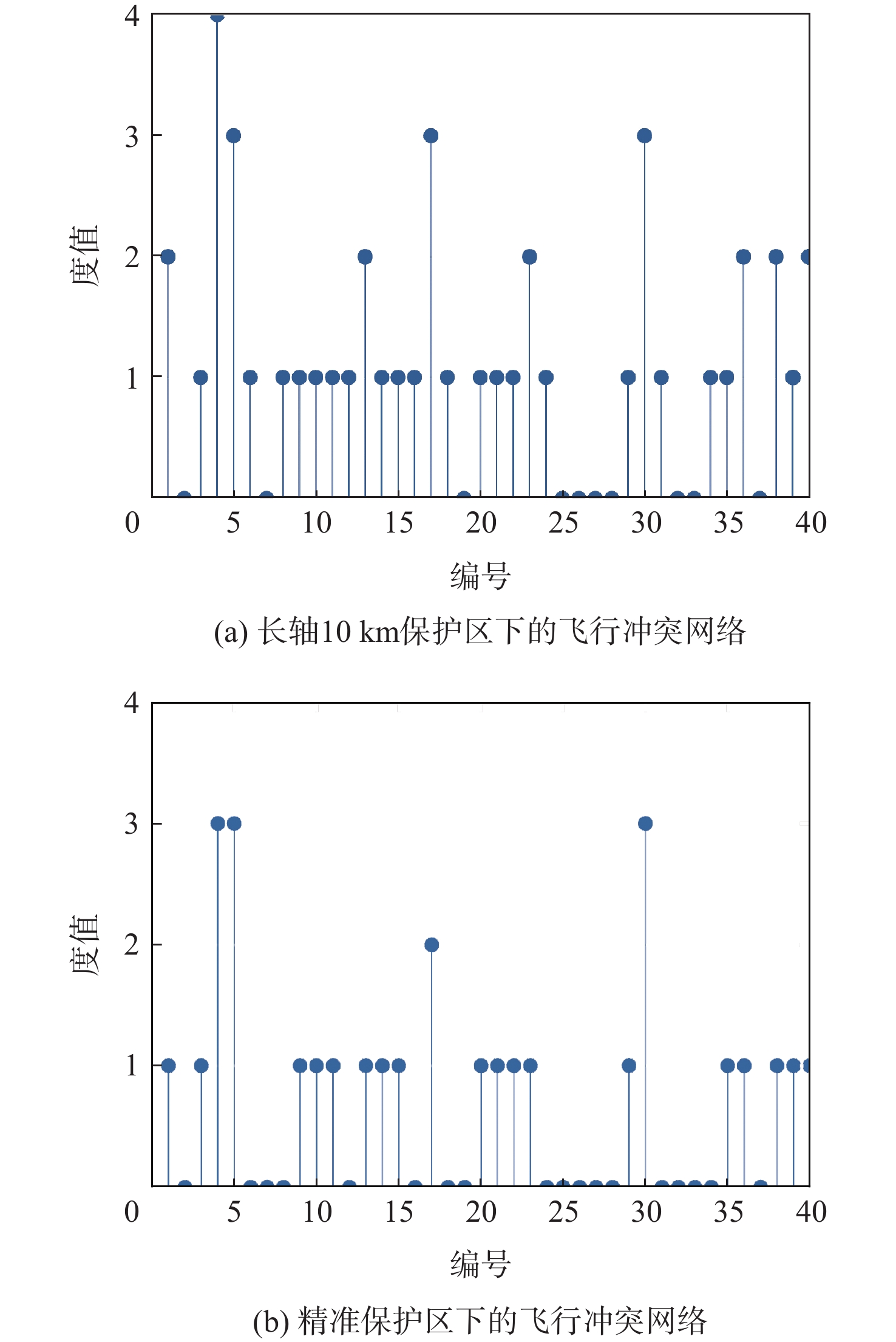 航空器机型 最小水平安全间隔/m A380 B737-800 A320 Cessna172 DA40 A380 6365 6227 6222 4209 4361 B737-800 6227 6025 6017 3884 4032 A320 6222 6017 6006 6161 3875 Cessna172 4209 3884 3875 1571 1713 DA40 4361 4032 4024 1713 1856 表 4 不同时刻的网络指标值