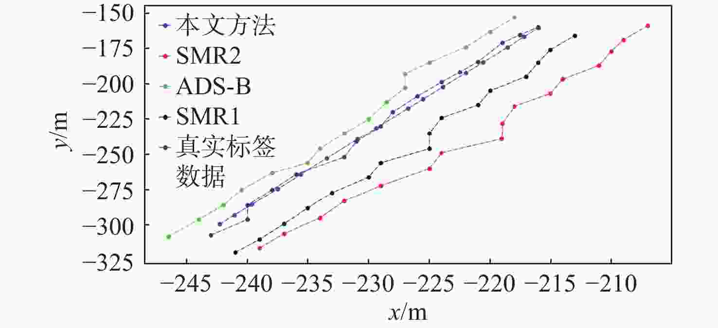 参数类型 参数值 初始化状态协方差矩阵${{\boldsymbol{P}}_0}$ $ \left[ {\begin{array}{*{20}{c}} {{{1.0}}}&{{{0}}}&{{{0}}}&{{{0}}} \\ {{{0}}}&{{{1.0}}}&{{{0}}}&{{{0}}} \\ {{{0}}}&{{{0}}}&{{{1.0}}}&{{{0}}} \\ {{{0}}}&{{{0}}}&{{{0}}}&{{{1.0}}} \end{array}} \right] $ 过程噪声协方差${\boldsymbol{Q}}_0$ $\left[ {\begin{array}{*{20}{c}} {0.000\;1}&{0}&{0}&{0}&{0} \\ {0}&{0.000\;1}&{0}&{0}&{0} \\ {0}&{0}&{0.000\;09}&{0}&{0} \\ {0}&{0}&{0}&{0.001}&{0} \\ {0}&{0}&{0}&{0}&{0.001} \end{array}} \right]$ SMR1的测量协方差矩阵${{\boldsymbol{R}}_1}$ $\left[ {\begin{array}{*{20}{c}} {6.25}&{0}&{0} \\ {0}&{0.001\;6}&{0} \\ {0}&{0}&{6.25} \end{array}} \right]$ SMR2的测量协方差矩阵${{\boldsymbol{R}}_2}$ $\left[ {\begin{array}{*{20}{c}} {4.622\;5}&{0}&{0} \\ {0}&{0.000\;9}&{0} \\ {0}&{0}&{4.625\;5} \end{array}} \right]$ ADS-B的测量协方差矩阵${{\boldsymbol{R}}_3}$ $\left[ {\begin{array}{*{20}{c}} {2.25}&{0} \\ {0}&{2.25} \end{array}} \right]$ 表 4 RNN融合方法参数设置