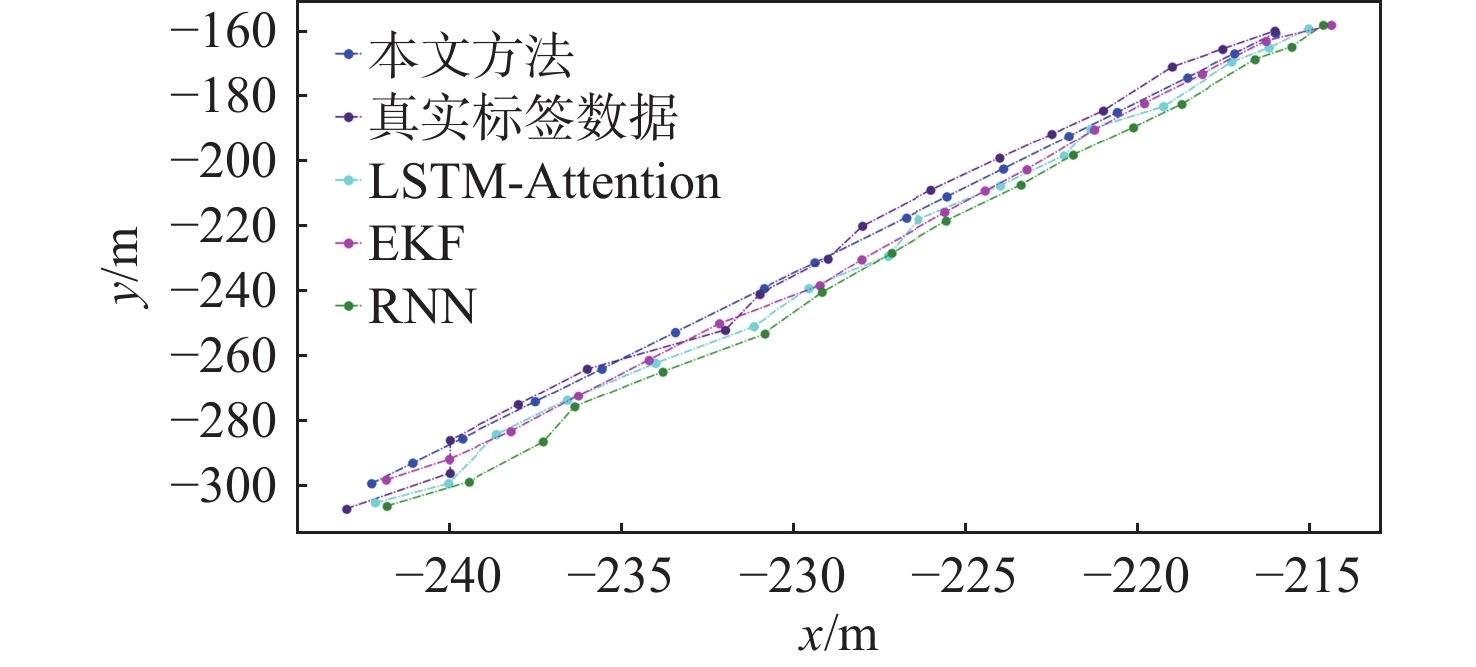 方法 MSE/m RMSE/m MAE/m 本文方法 4.2811 2.0691 2.0595 EKF 9.9745 3.1582 3.2078 LSTM-Attention 4.3775 2.0922 2.1190 RNN 4.9697 2.2293 2.4732 -