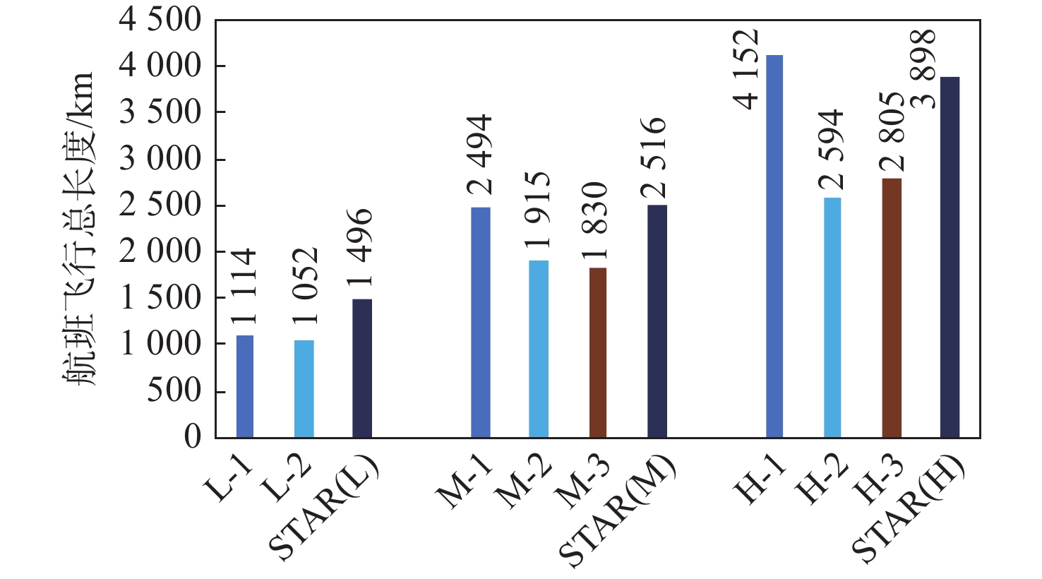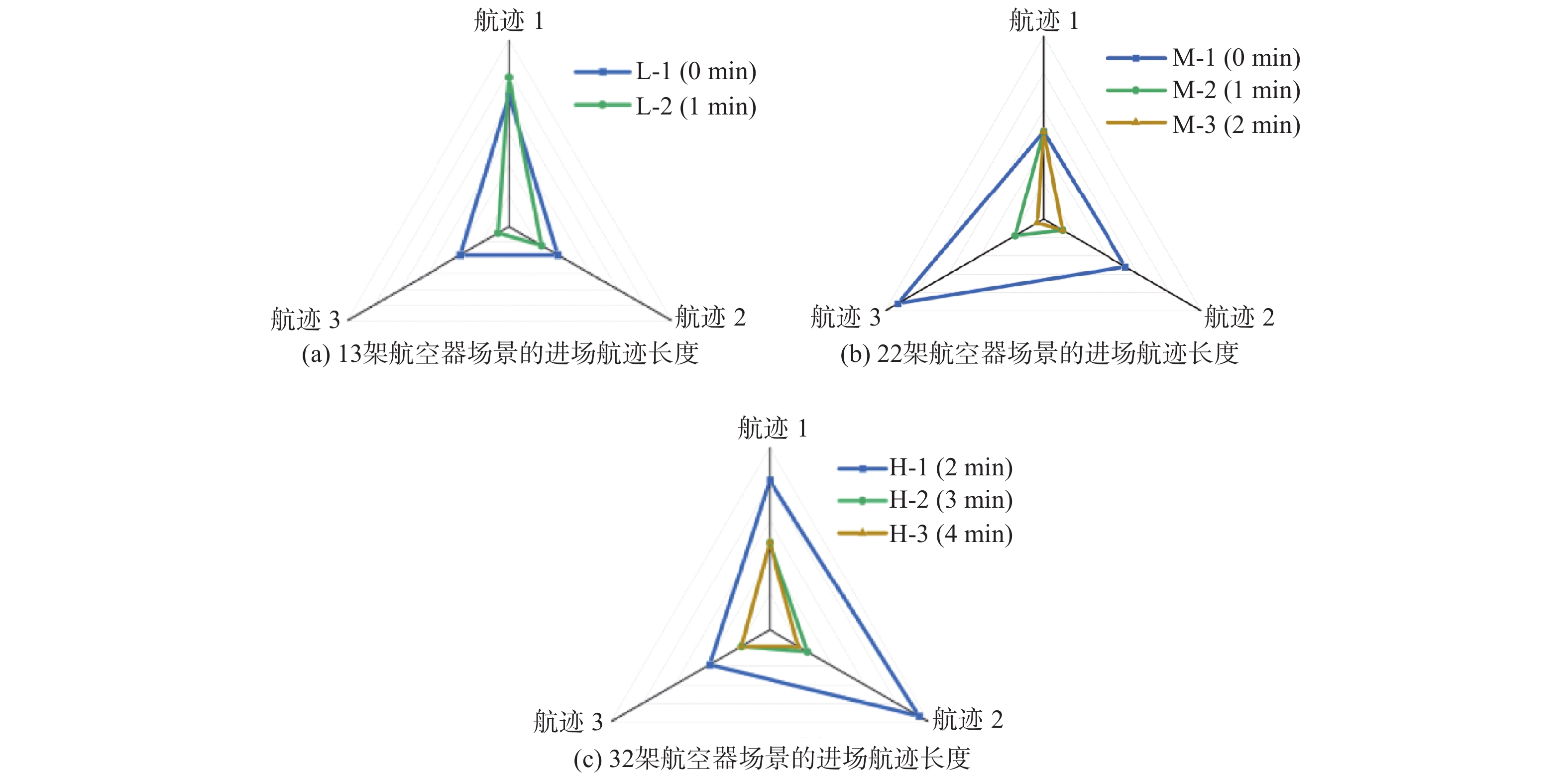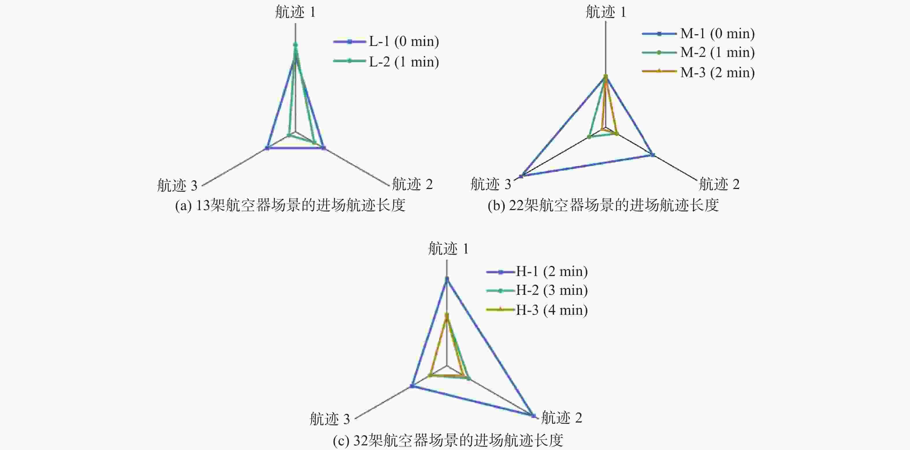 测试案例 密度 航班量 时间窗/min 三入口航班量 L-1 低 13 0 4-5-4 L-2 低 13 1 4-5-4 M-1 中 22 0 8-8-6 M-2 中 22 1 8-8-6 M-3 中 22 2 8-8-6 H-1 高 32 2 10-10-12 H-2 高 32 3 10-10-12 H-3 高 32 4 10-10-12 表 2 优化航迹相对原进场程序的长度变化