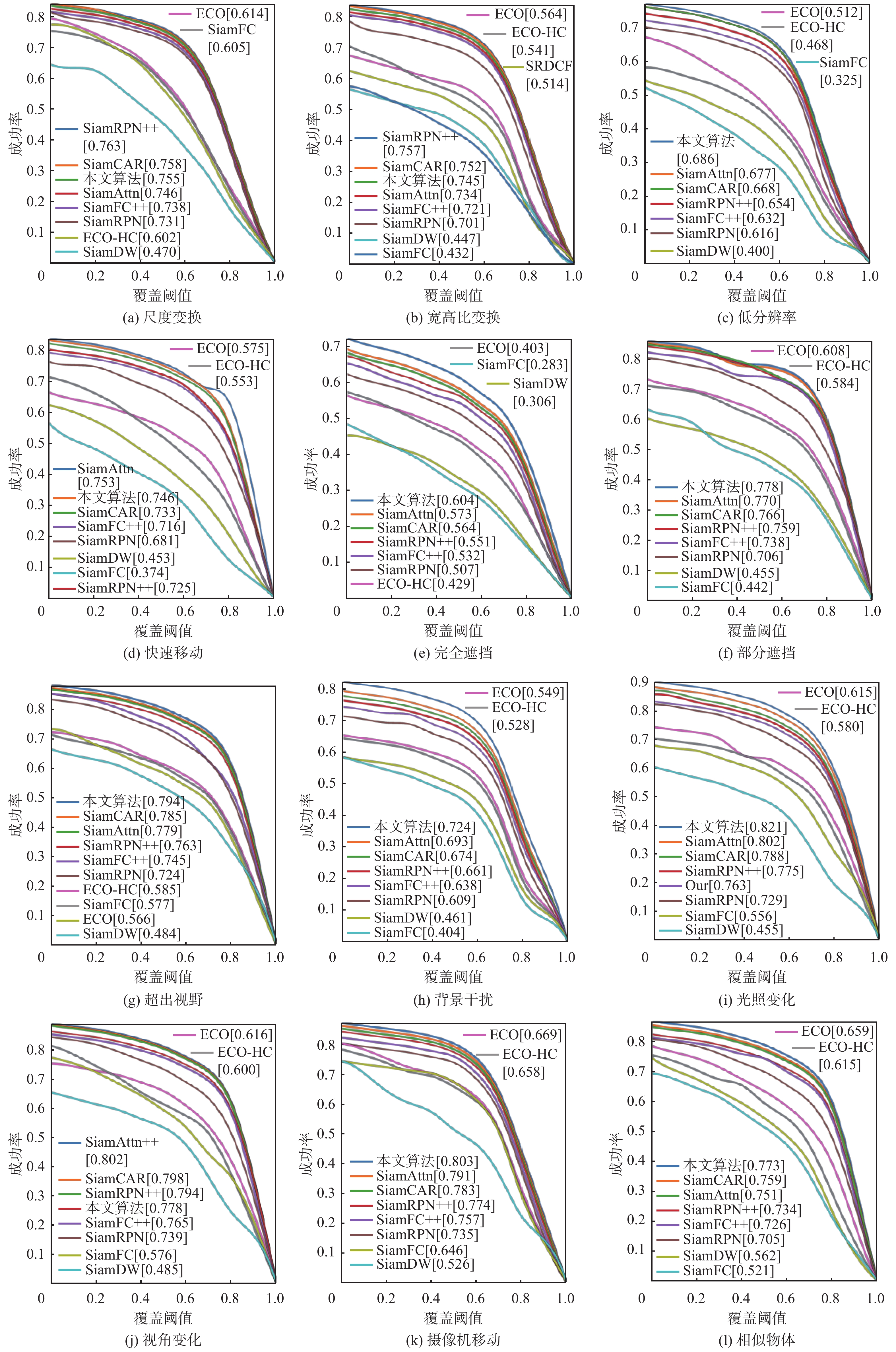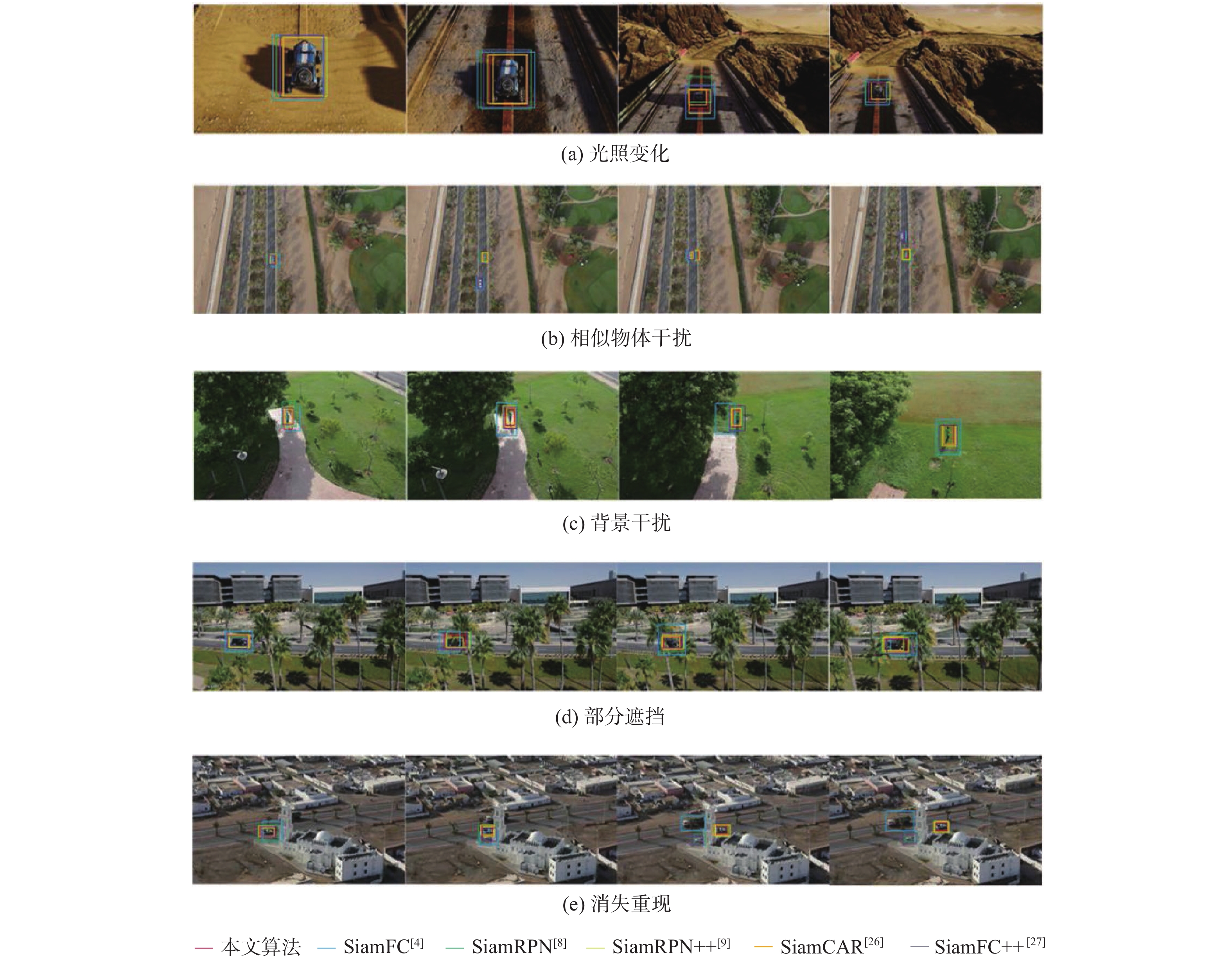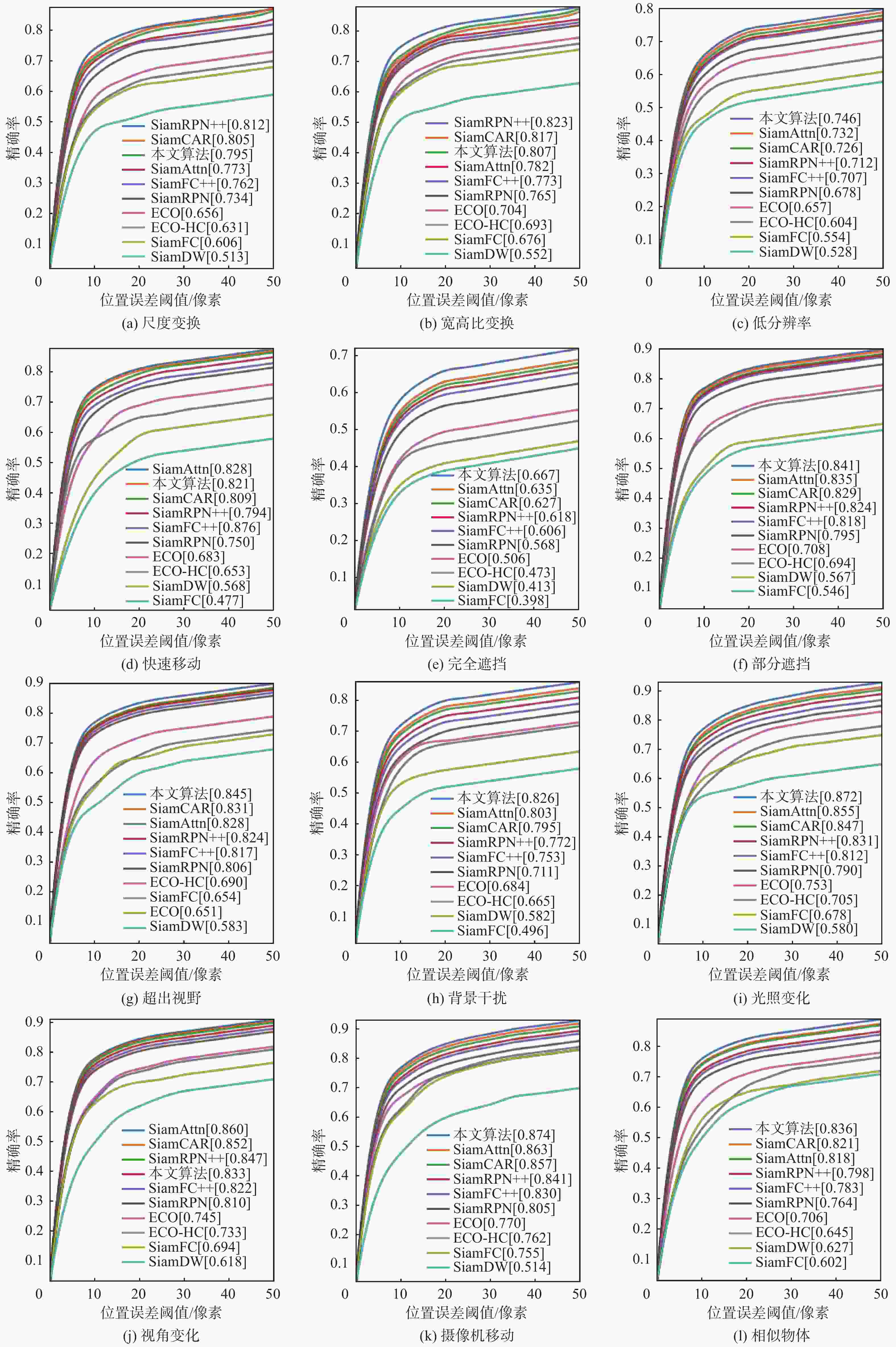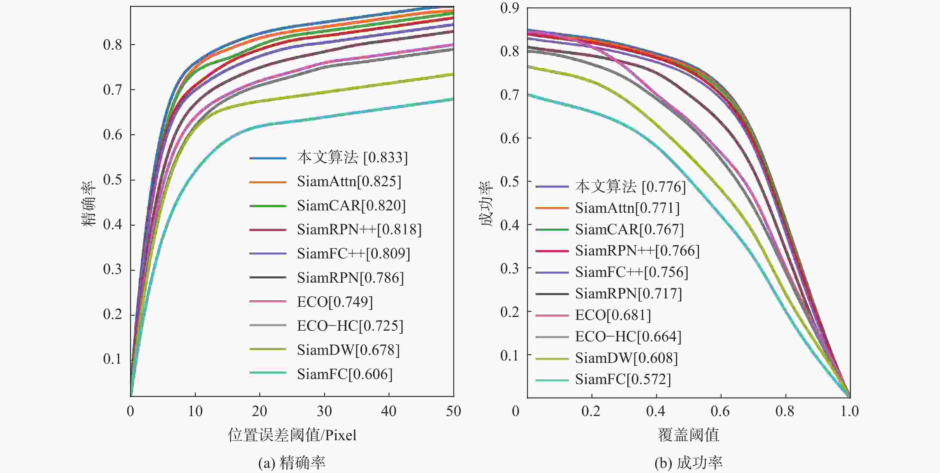 算法 精确率 成功率 Siamese 0.704 0.672 Siamese+FA 0.792 0.734 Siamese+PA 0.769 0.715 本文算法 0.832 0.771 -