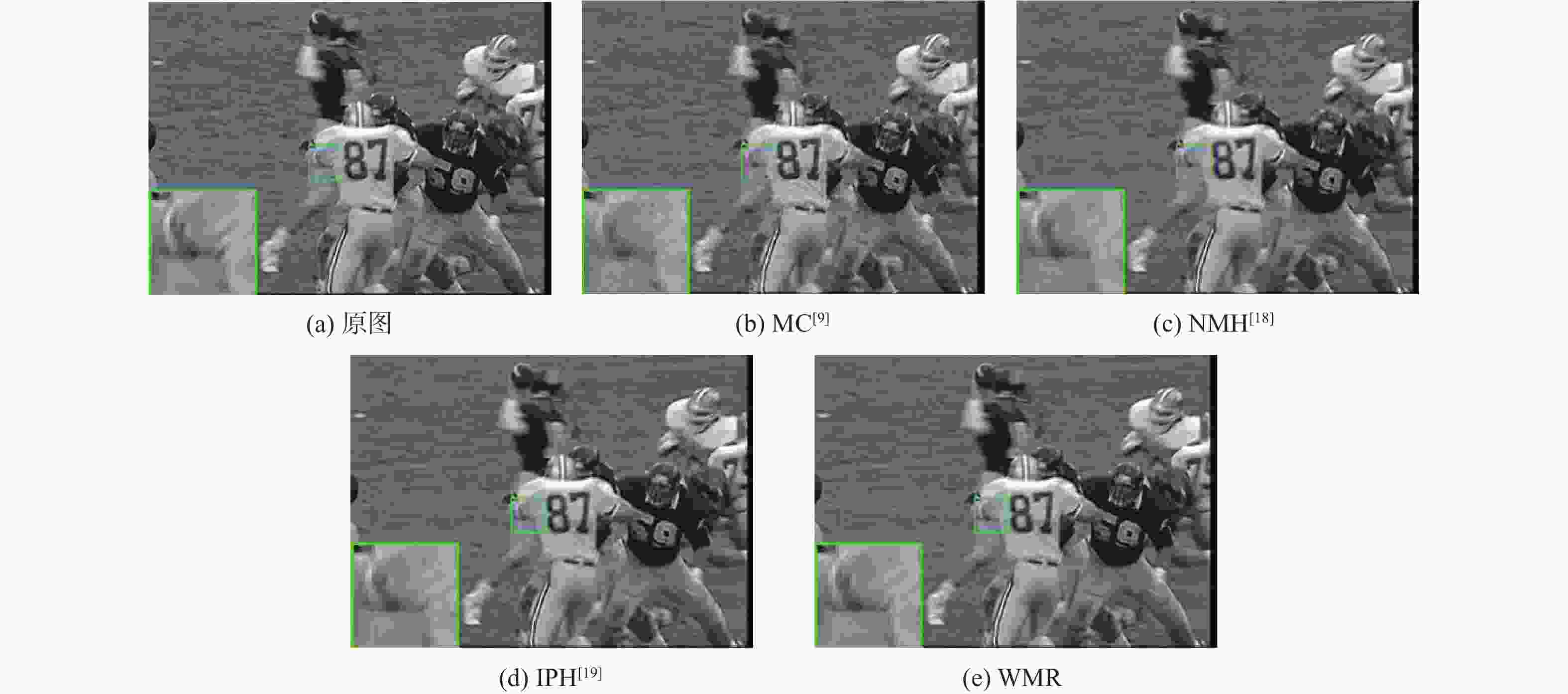 视频 算法 PSNR/dB 采样率为0.10 采样率为0.15 采样率为0.20 采样率为0.25 采样率为0.30 均值 News MC[9] 31.19 32.26 33.38 34.24 34.97 33.21 NMH[18] 33.92 34.86 36.04 36.88 37.24 35.79 IPH[19] 34.12 35.02 36.46 37.32 37.63 36.11 WMR 34.35 35.29 36.72 37.56 37.94 36.37 Foreman MC[9] 31.49 32.57 34.12 34.78 35.79 33.75 NMH[18] 33.52 34.70 36.35 37.04 38.14 35.95 IPH[19] 33.77 34.97 36.65 37.36 38.48 36.25 WMR 34.11 35.42 36.94 37.66 38.76 36.58 Football MC[9] 25.34 27.11 28.63 29.93 31.10 28.42 NMH[18] 27.35 29.16 30.83 32.26 33.45 30.61 IPH[19] 27.61 29.43 31.10 32.57 33.77 30.90 WMR 27.83 29.67 31.35 32.84 34.06 31.15 -