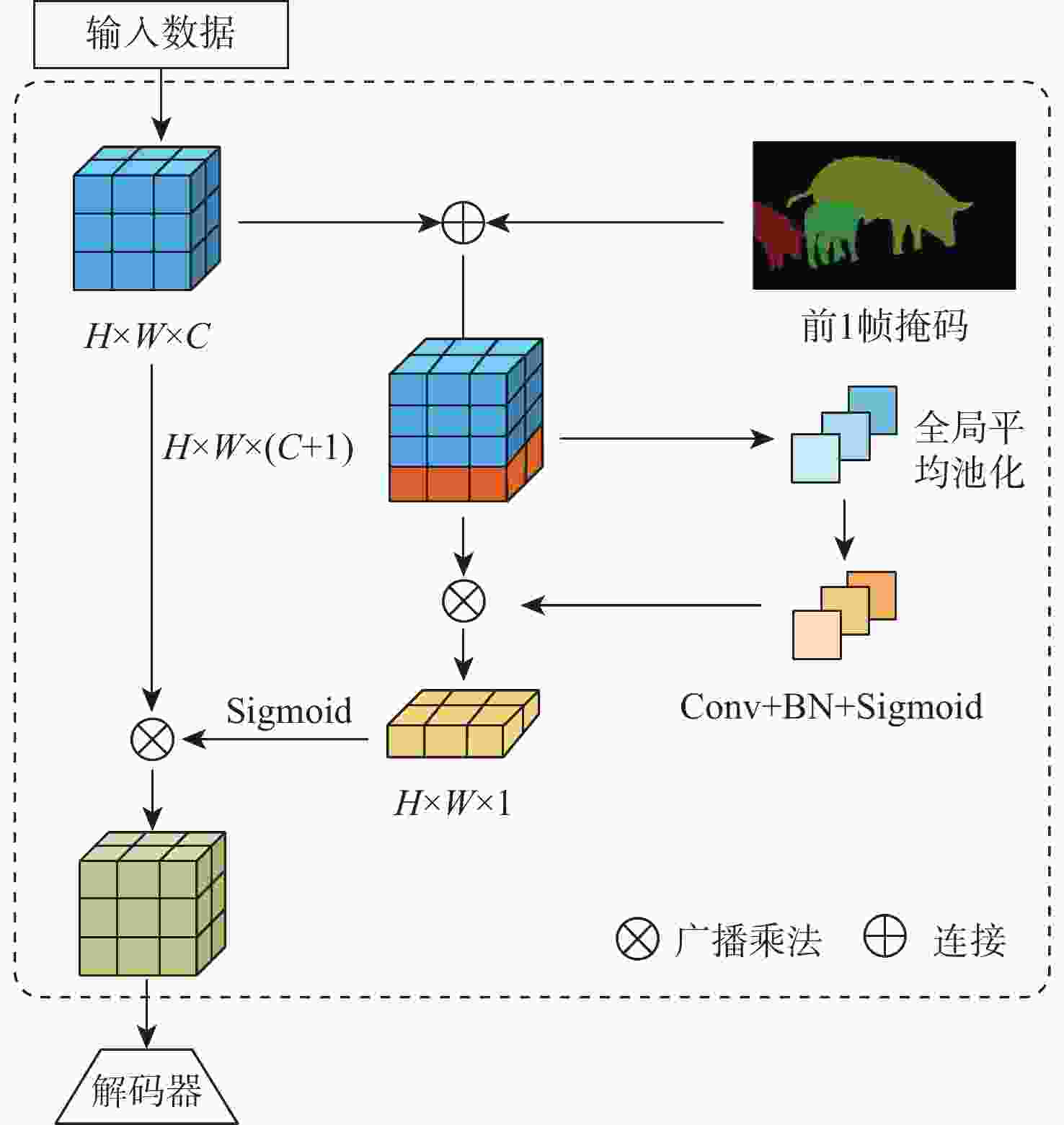 J &F 的精度,在YouTube-VOS 2019验证集达到82.4%J &F 的精度。Abstract:A semi-supervised video object segmentation (VOS) method was proposed to address the issues of increasing memory consumption during inference and the difficulty of training relying solely on low-level pixel features. The method is based on dynamic embedding features and an auxiliary loss function. First, a dynamic embedding feature was employed to establish a constant-sized memory bank. Through spatiotemporal aggregation, historical information was utilized to generate and update dynamic embedding features. Simultaneously, a memory update sensor was employed to adaptively control the update interval of the memory bank, accommodating different motion patterns in various videos. Second, an auxiliary loss function was utilized to provide the network with guidance at the high semantic feature level, enhancing model accuracy and training efficiency by offering diverse guidance across multiple feature levels. Finally, to address the issue of misalignment between similar objects in the foreground and background of videos, a spatial constraint module was designed, which leveraged the temporal continuity of videos to better capture the correlation between the mask from the previous frame and the current frame. Experimental results demonstrate that the proposed method achieves an accuracy of 84.5%