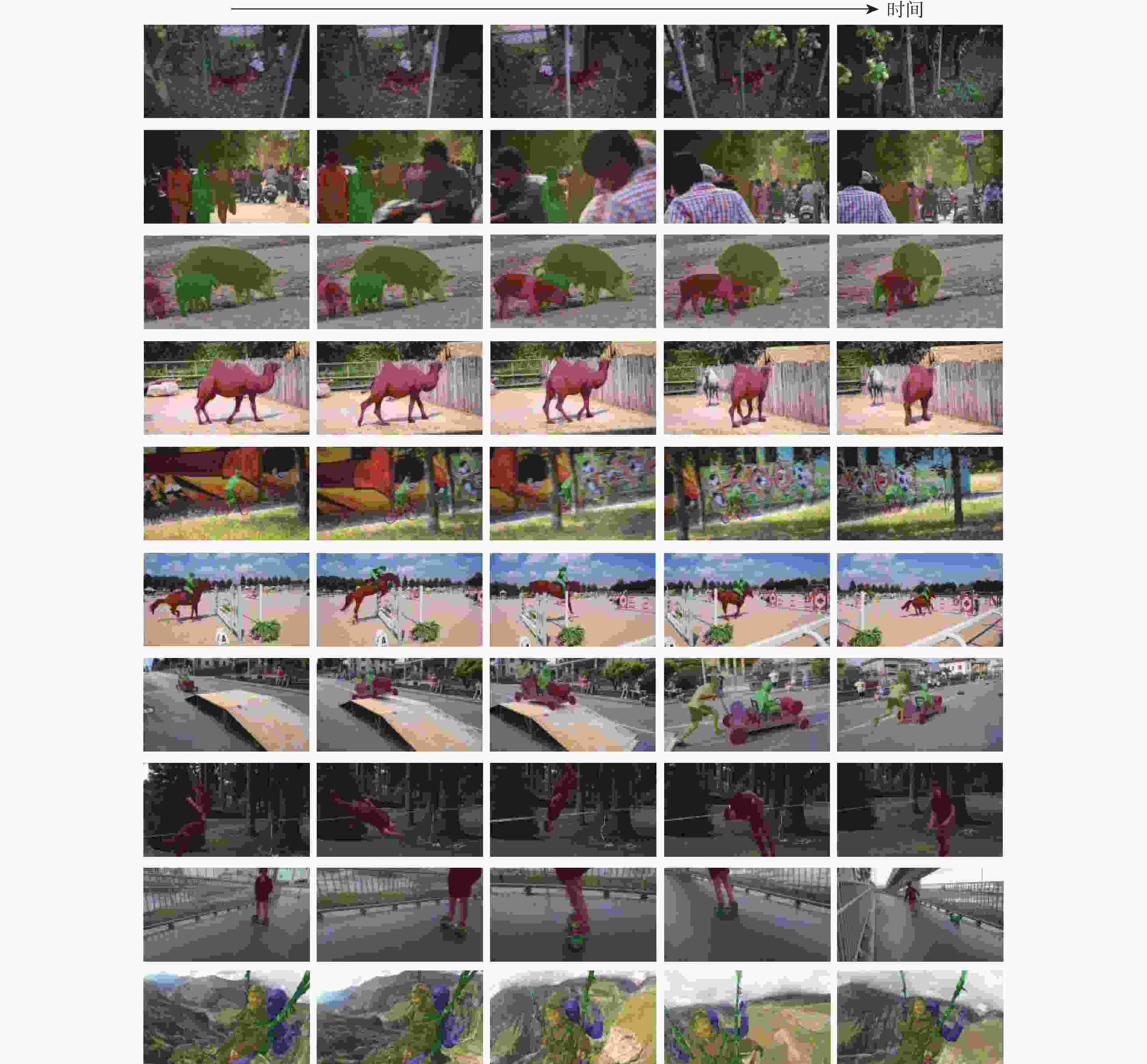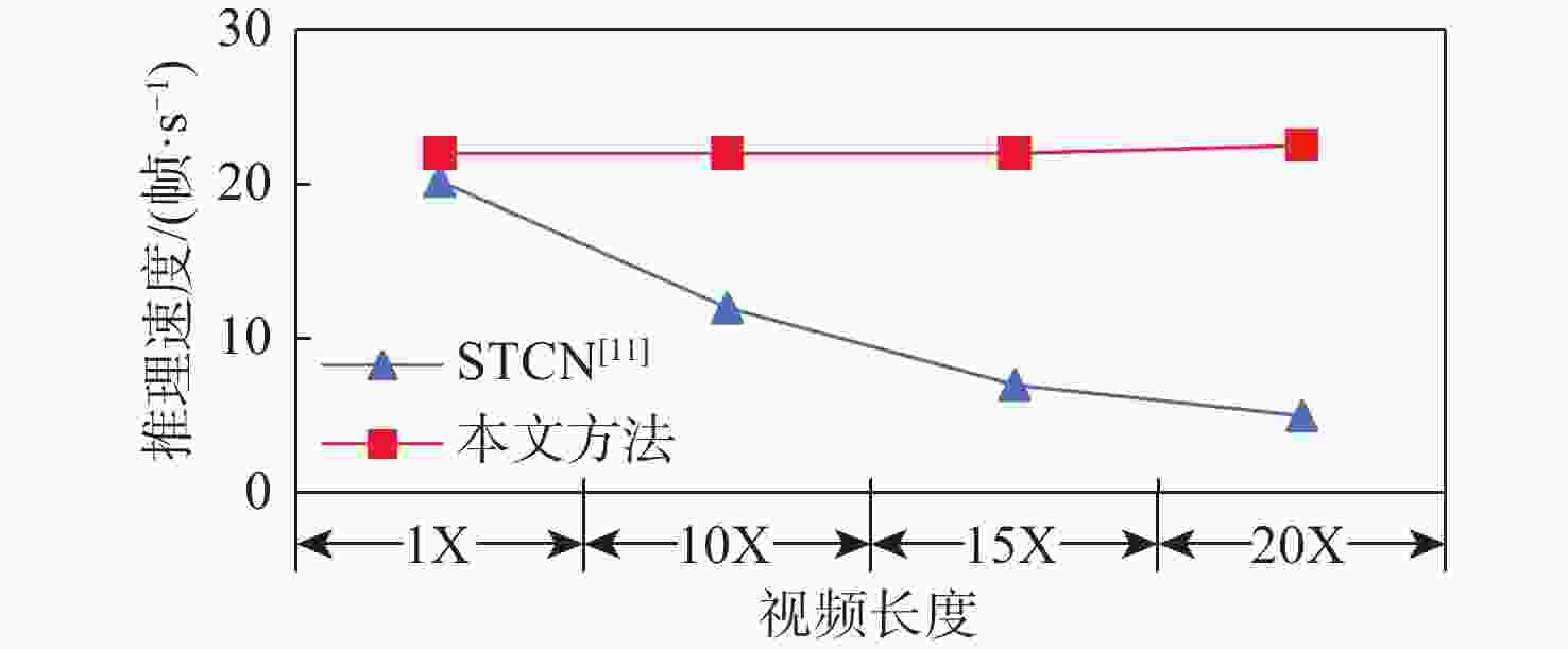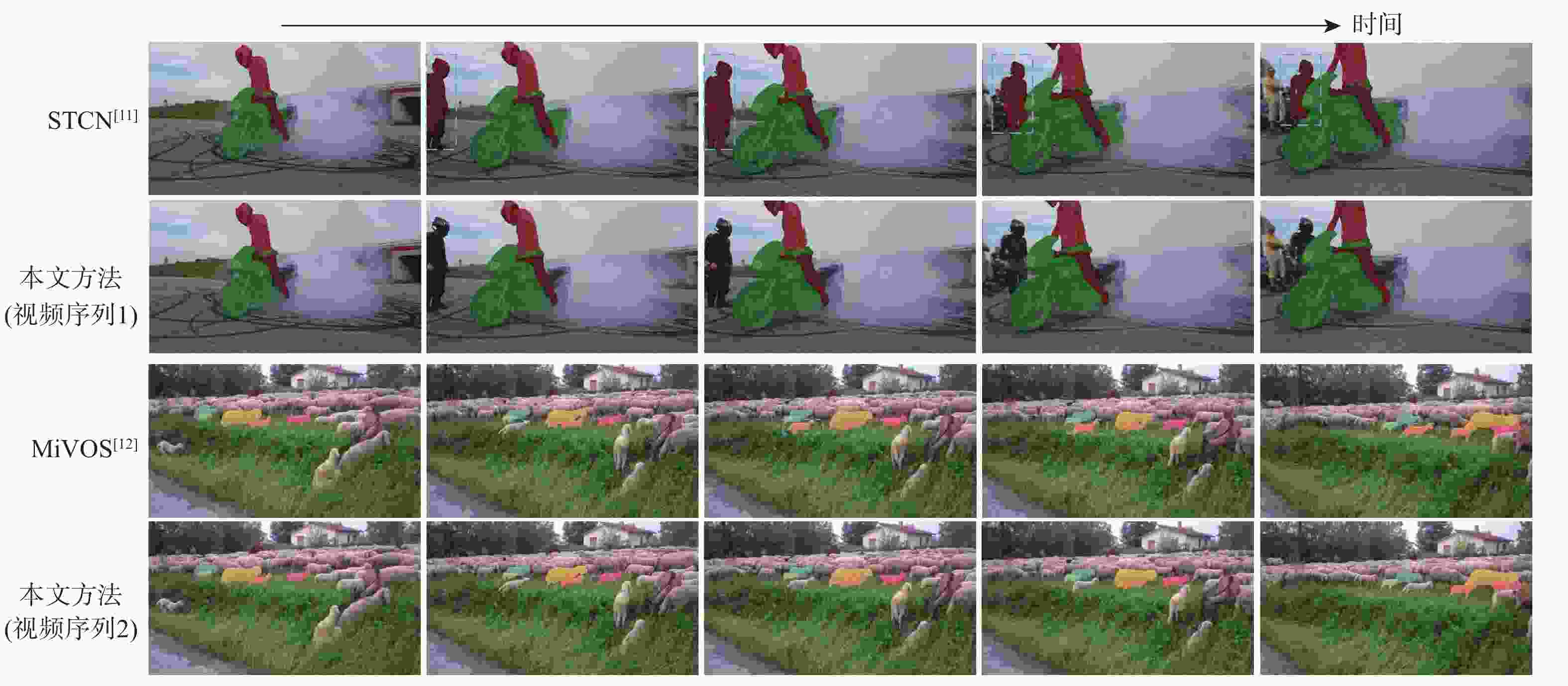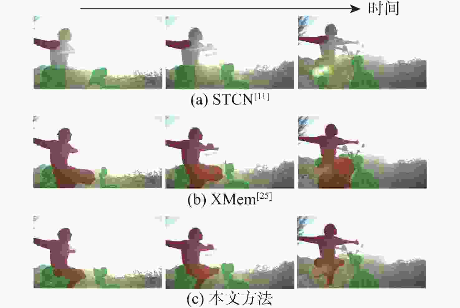 % 方法 600p CC J&F J F KMN[7] √ × 77.2 74.1 80.3 STCN[11] × × 76.1 72.7 79.6 MiVOS[12] × × 76.0 72.6 79.3 QDMN[24] × × 77.7 74.2 81.2 XMem[25] × × 81.0 77.4 84.5 CFBI[4] × √ 74.8 71.1 78.5 文献[23] × √ 75.2 72,0 78.3 CFBI+[5] × √ 75.6 71.6 79.6 RDE[9] × √ 77.4 73.6 81.2 本文 × √ 78.0 74.3 81.6 注: 600p表示使用600分辨率视频进行推理,“√”表示使用,“×”表示不使用。CC表示该方法占用恒定内存,其中“√”表示内存占用保持不变,“×”表示内存占用会逐渐增加。 表 3 YouTube-VOS 2019验证集上的实验结果