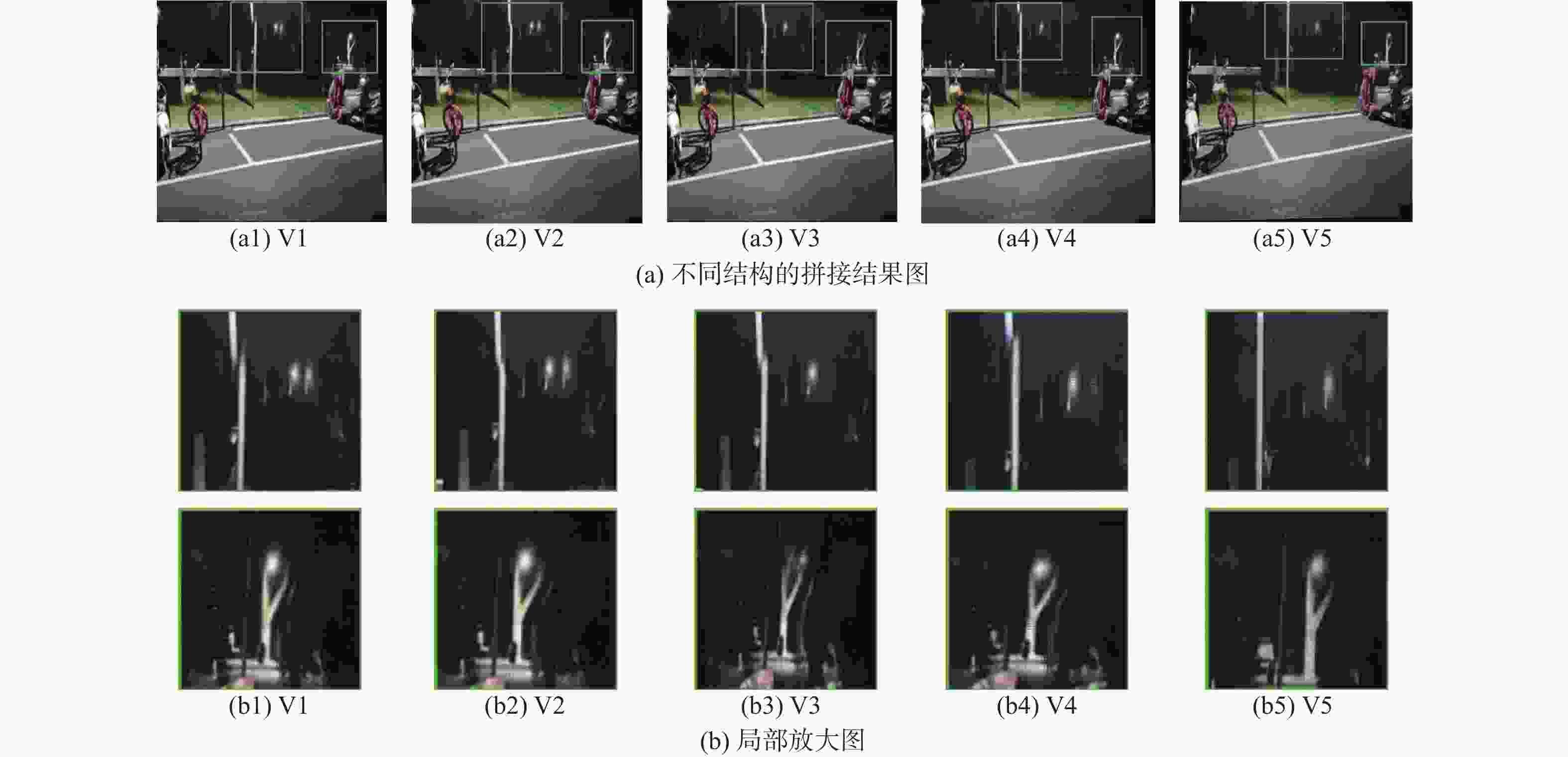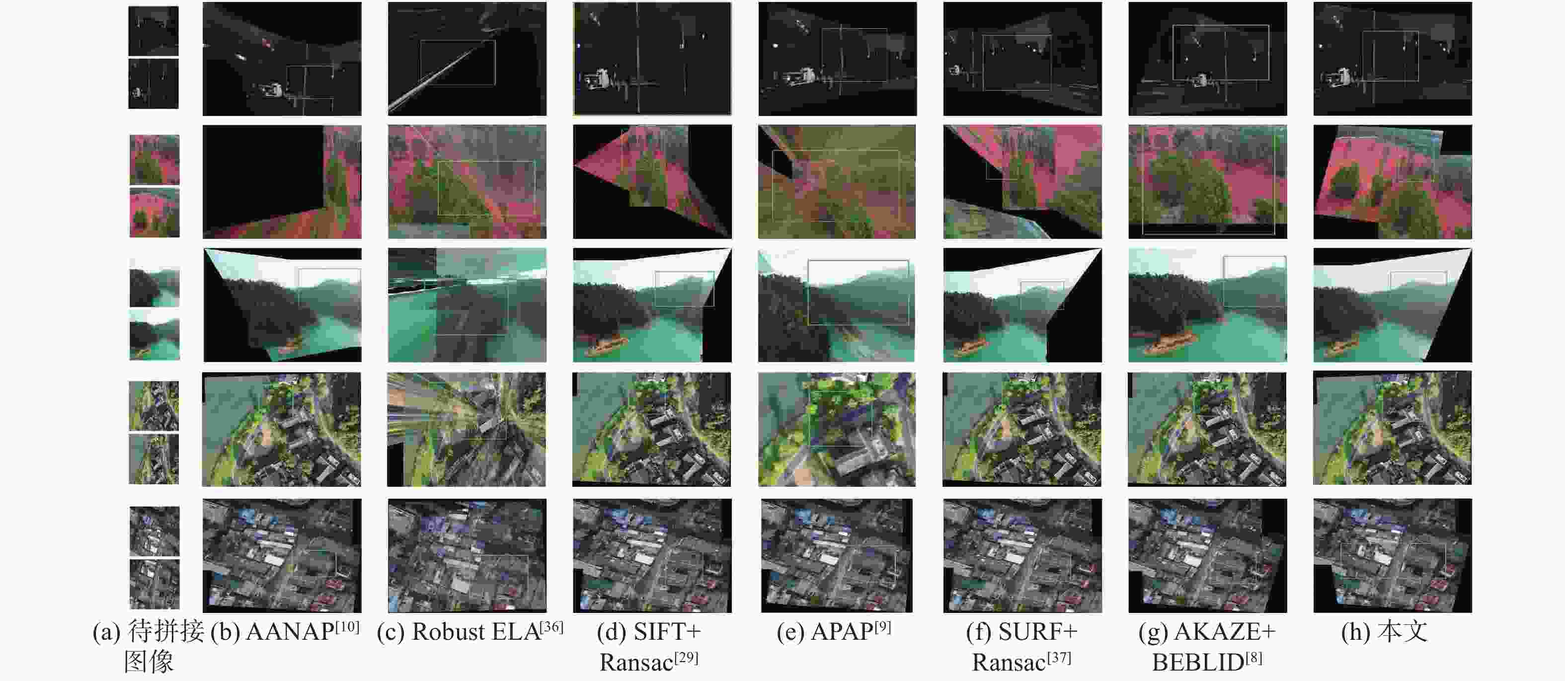 算法 平均PSNR/dB 平均SSIM 平均RMSE 传统单应性估计 X3×3 14.2336 0.2434 16.7963 SIFT+Ransac[29] 23.8325 0.7485 7.2675 AKAZE+BEBLID[8] 22.1323 0.6241 7.4103 ORB+Ransac[30] 21.6325 0.5986 8.8875 深度单应性估计(有监督) DHN[31] 19.9563 0.6131 5.2236 文献[19]算法 23.9723 0.7543 4.9216 DPH-Net[20] 22.8356 0.7412 6.6235 深度单应性估计(无监督) UDHN[32] 21.8526 0.6721 5.1203 UDIS[18] 25.0521 0.8023 4.2651 本文 27.2513 0.8377 3.0136 表 3 不同算法的图像拼接时间比较