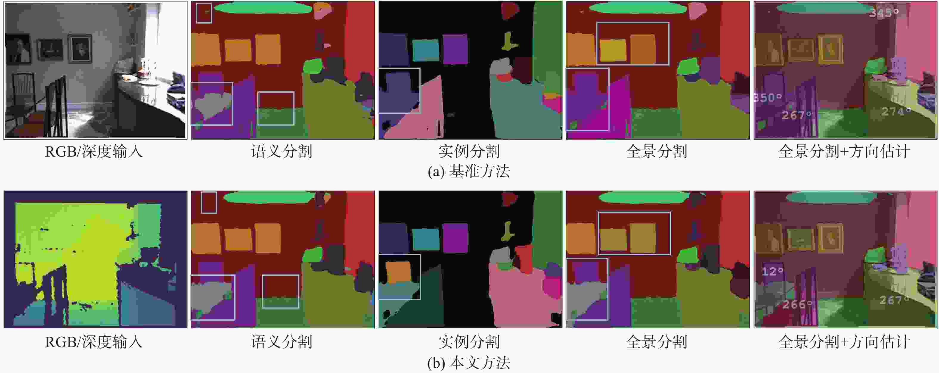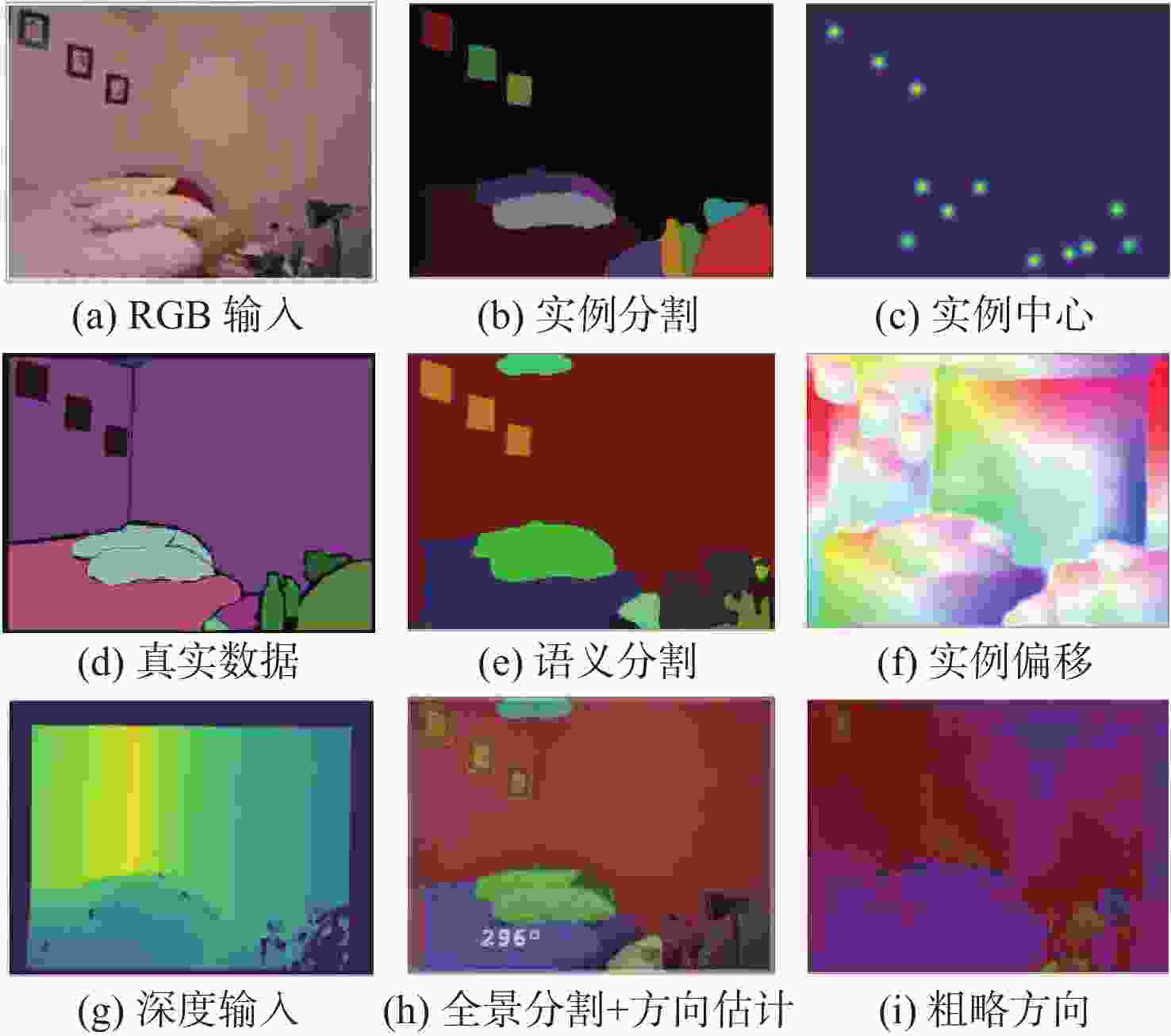 任务 任务权重 学习率 实例分割 全景分割 语义分割 PQ/% MAAE/% mIoU/% PQ/% RQ/% SQ/% MAAE/% mIoU/% 语义分割+实例分割 1∶3 0.03 61.81 48.56 42.98 51.33 82.43 48.77 实例分割+方向估计 3∶1 0.04 59.72 17.66 语义分割+实例分割+方向估计(本文) 1∶3∶1 0.04 61.88 18.45 49.36 43.54 52.08 82.60 15.76 49.75 语义分割+实例分割+方向估计+分类 1∶0.25∶3∶1 0.04 60.14 18.64 49.63 42.02 50.34 82.45 16.70 49.33 表 4 在SUN RGB-D数据集中验证不同任务的组合效果